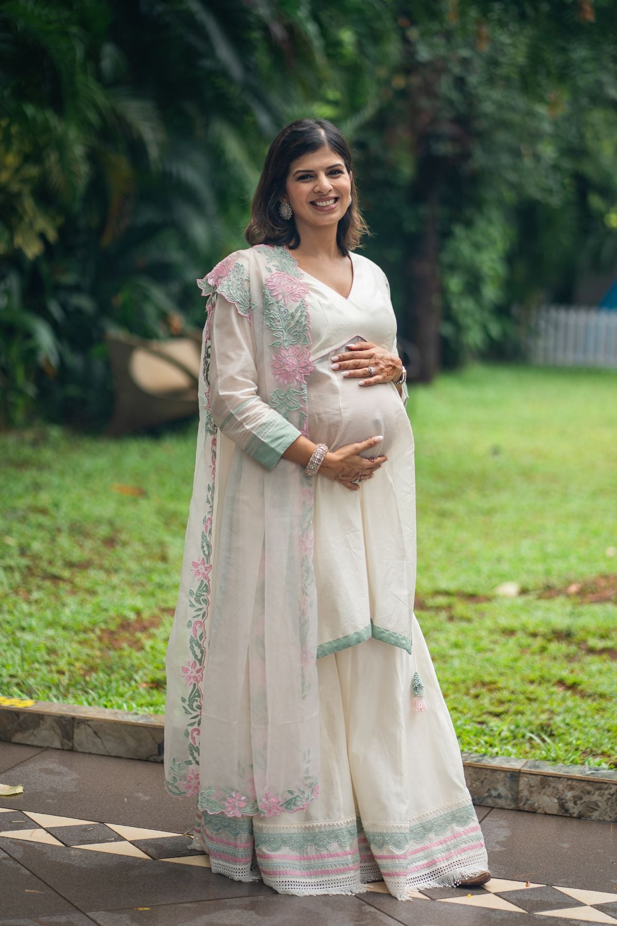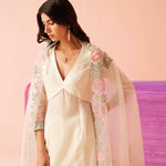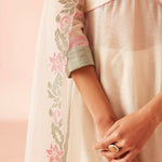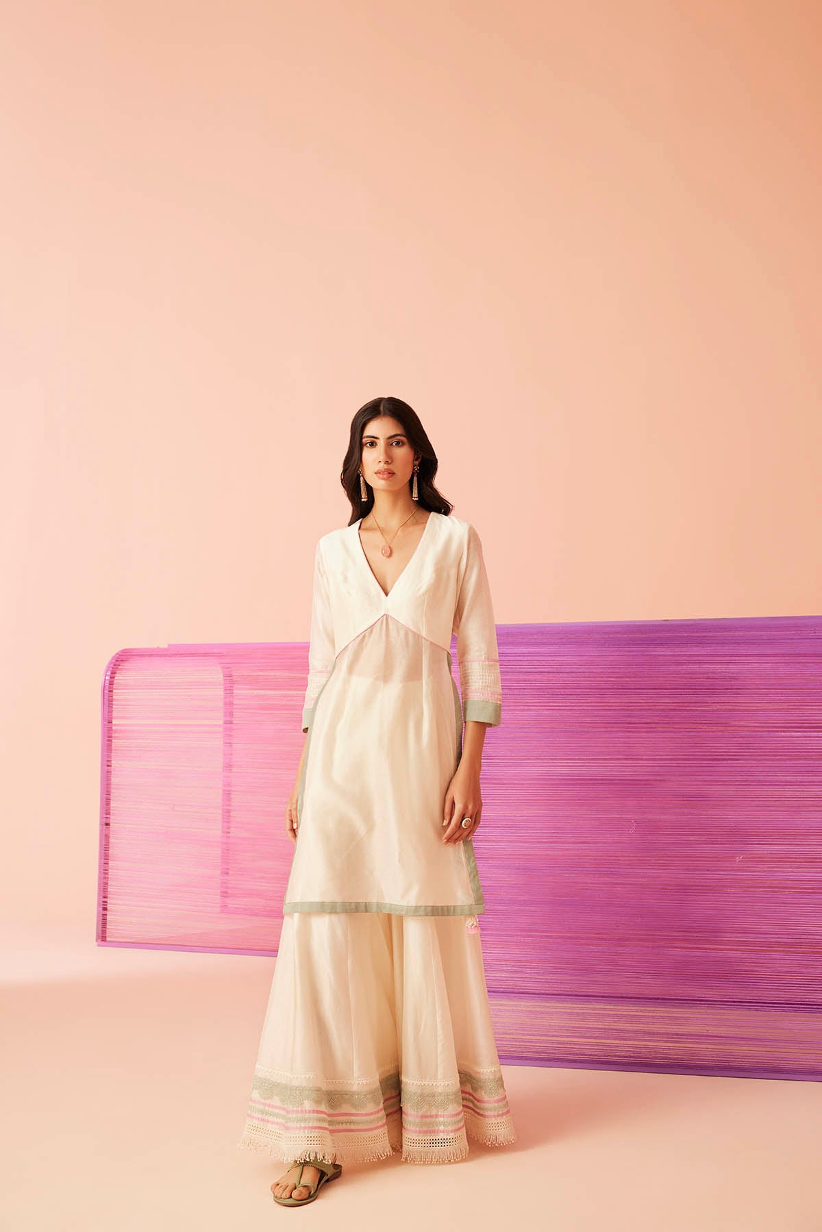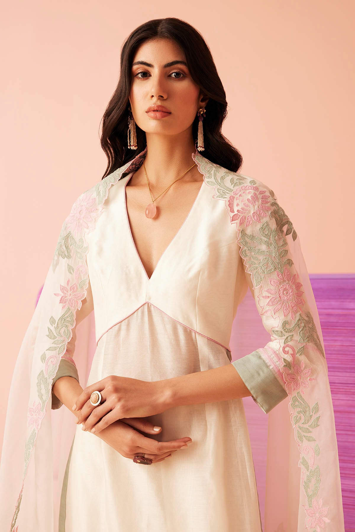 This ivory kurta set is the epitome of summer elegance. The intricate detailing of the sea green striped patches and laces on the kurta and gharara create a playful yet sophisticated look. The organza dupatta, featuring delicate floral embroidery in shades of rose pink and sea green, adds a touch of romanticism to the overall ensemble.