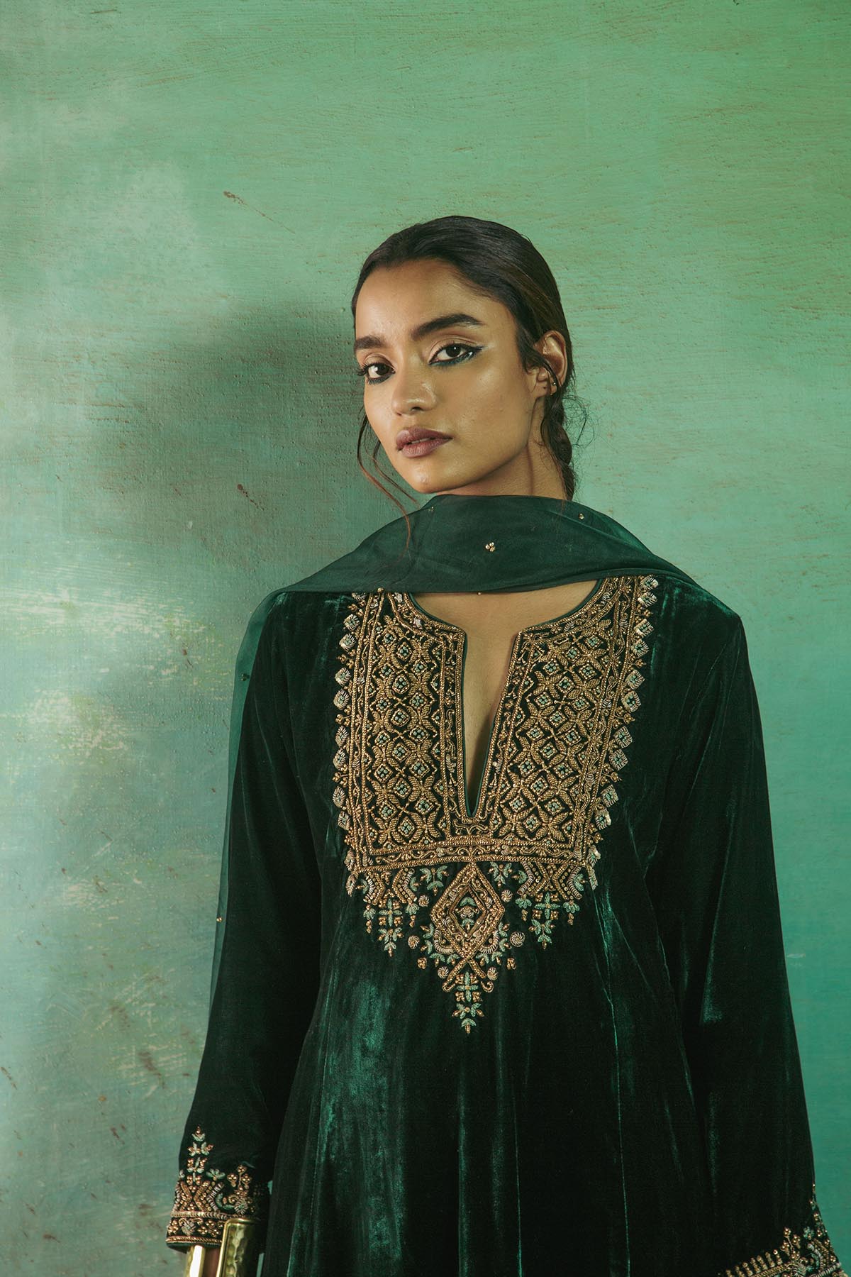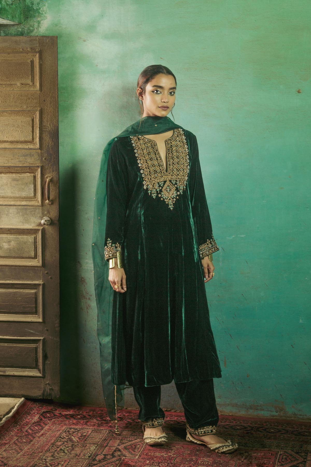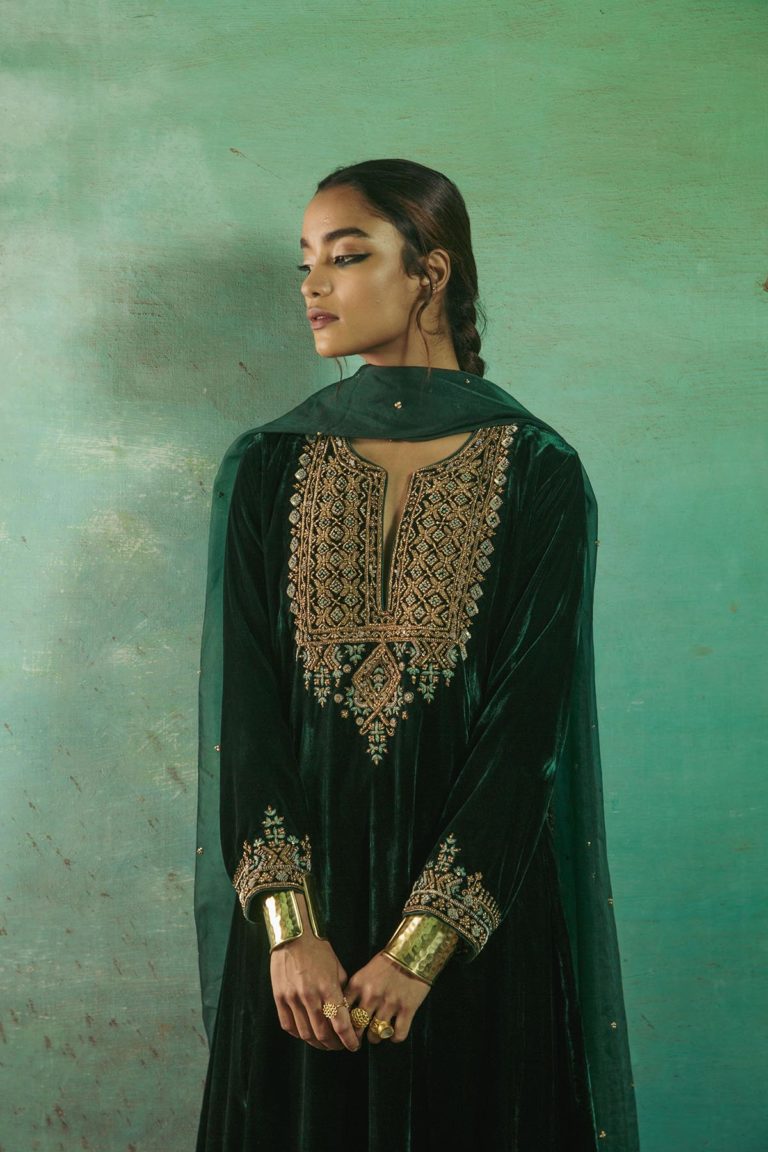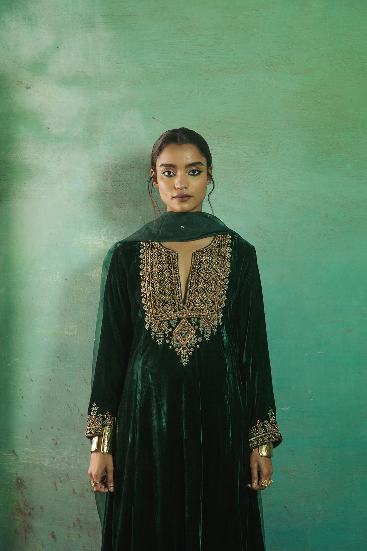 The perfect mix of decadence and simplicity — this kurta and salwar set is embroidered intricately by hand with aari threadwork as the base and further highlighted with zari, bead and sitara work. The plunging Mughal neckline is juxtaposed with a beautifully delicate organza dupatta. Here is an ensemble that promises everasting elegance.
