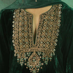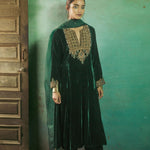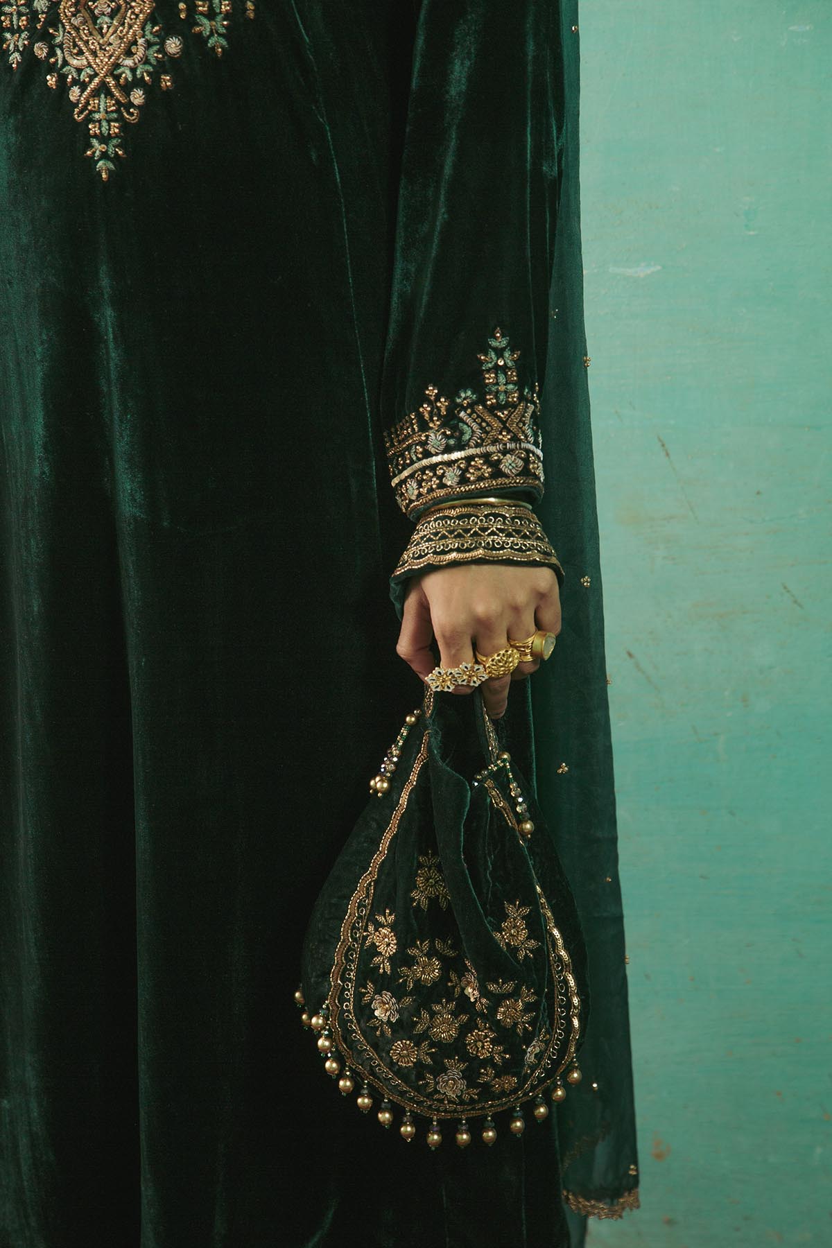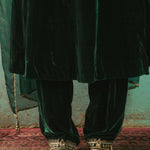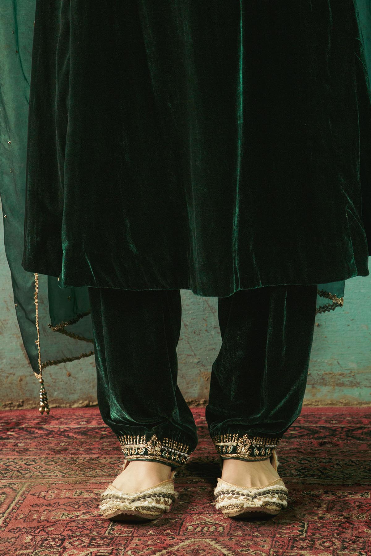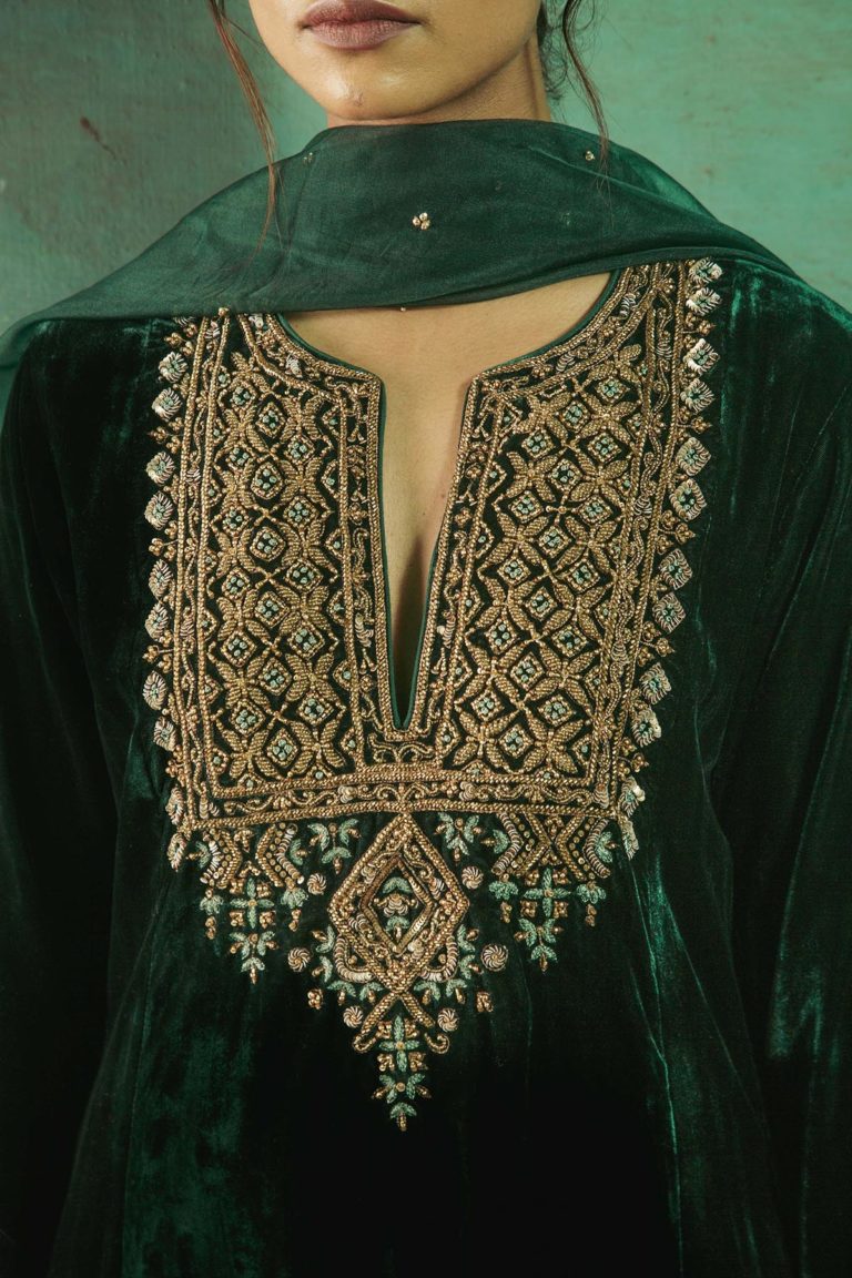 The perfect mix of decadence and simplicity — this kurta and salwar set is embroidered intricately by hand with aari threadwork as the base and further highlighted with zari, bead and sitara work. The plunging Mughal neckline is juxtaposed with a beautifully delicate organza dupatta. Here is an ensemble that promises everasting elegance.