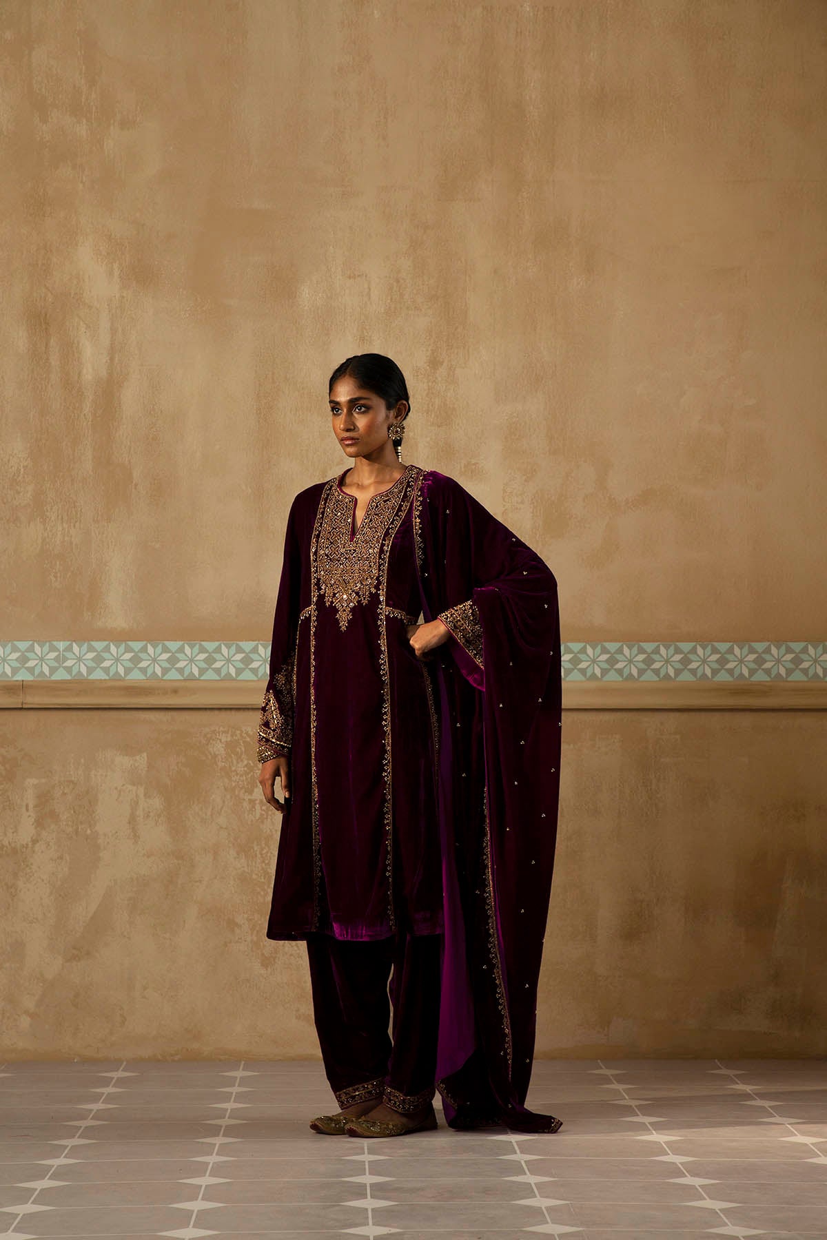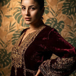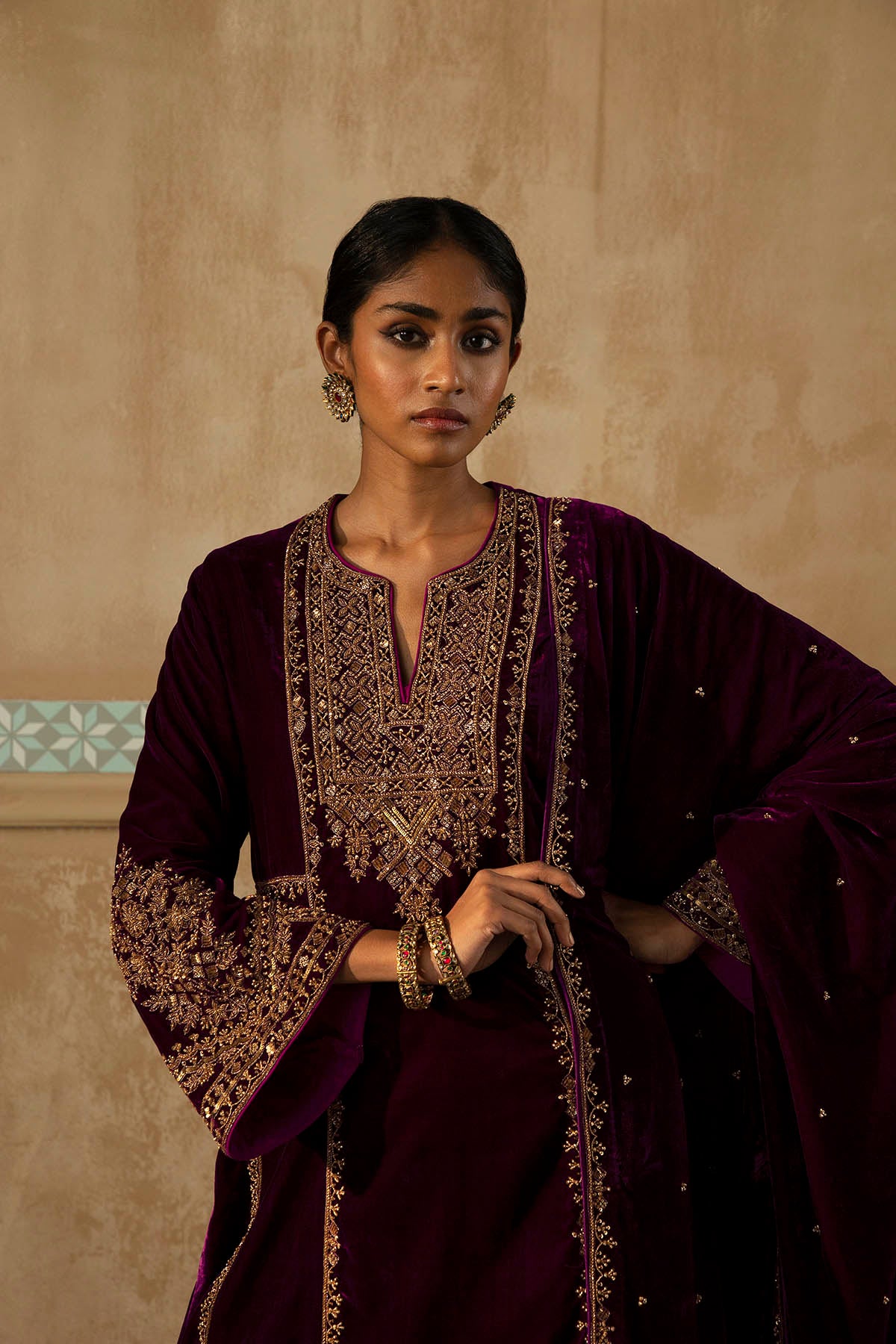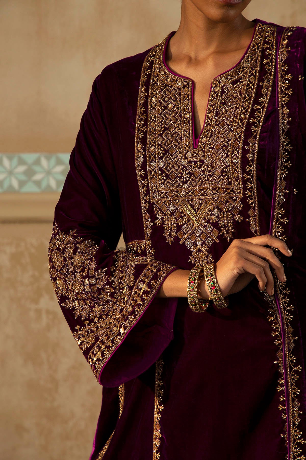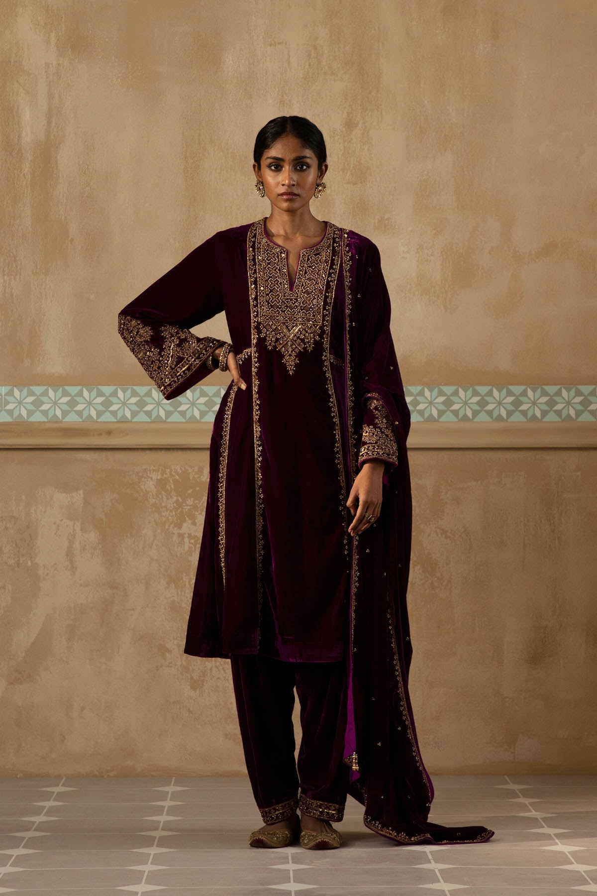 A jewel tone extravaganza — this kalidaar kurta and salwar set is all about polished perfection. Jewel-toned richness meets the subtle glint of aari, cutdana, sitara and zardozi work. Opt for an embellished velvet dupatta for a traditional look. Antique gold jewellery and this set go hand in hand.