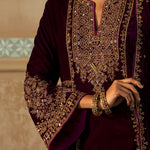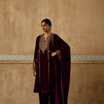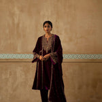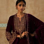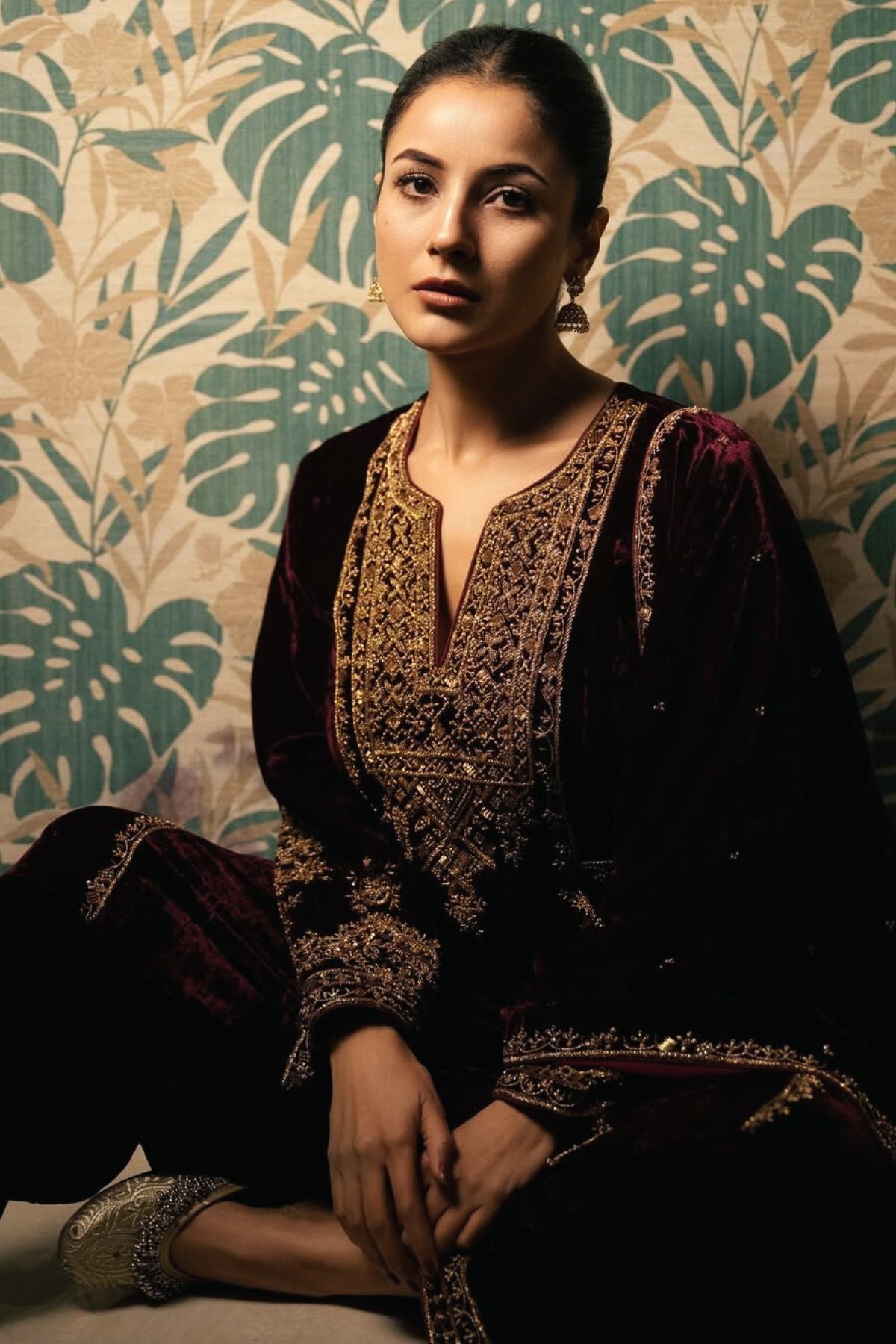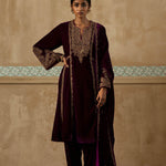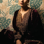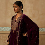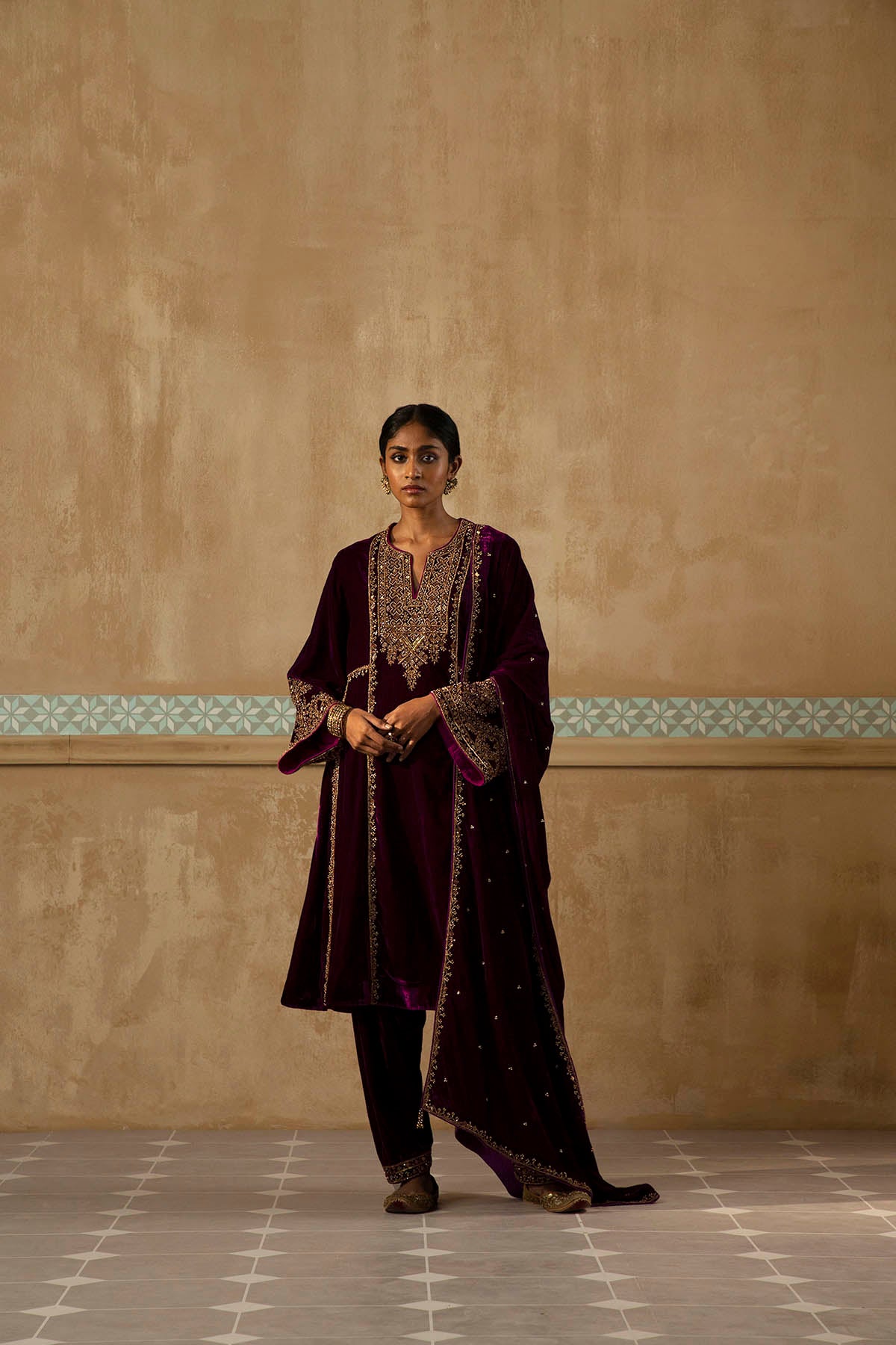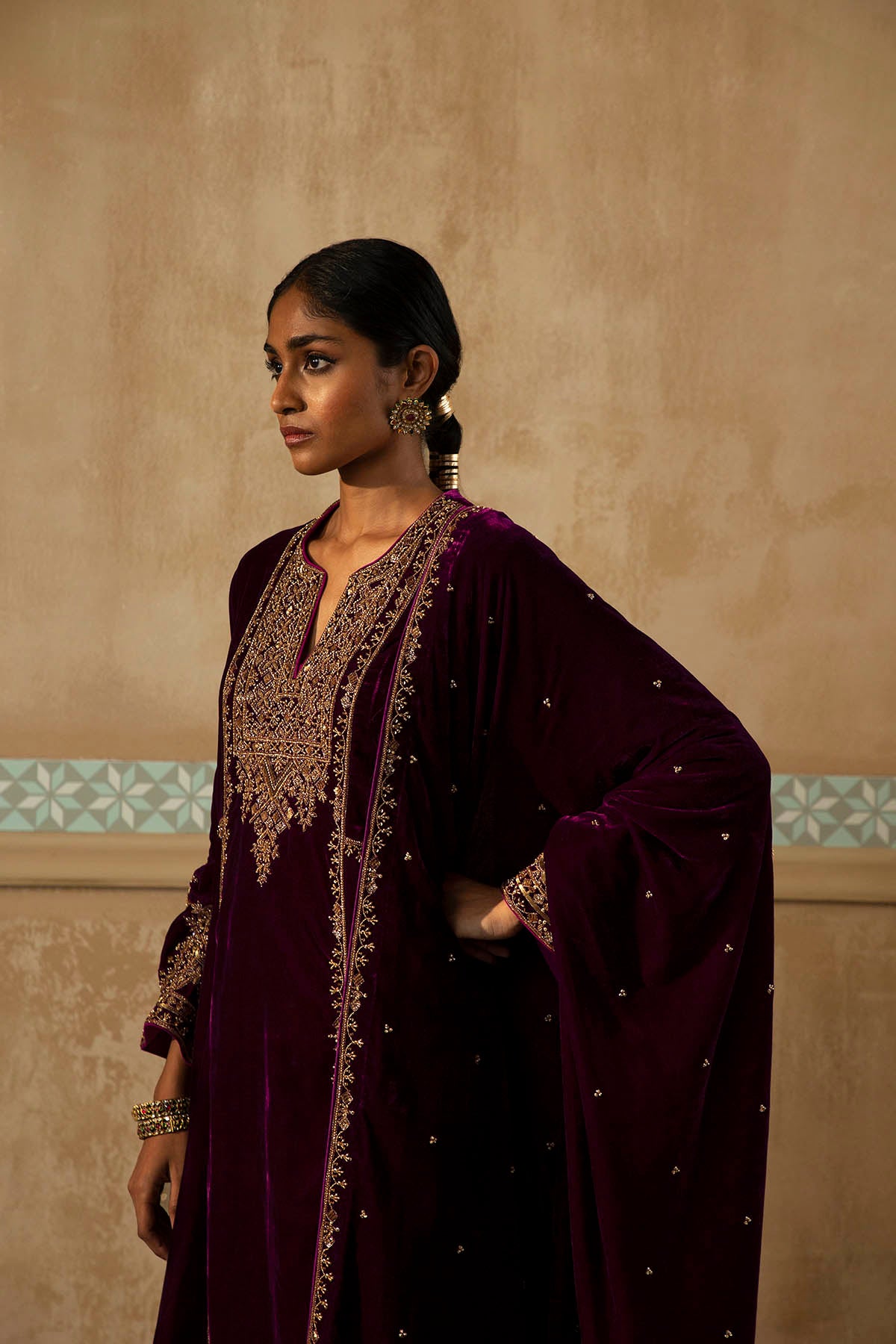 A jewel tone extravaganza — this kalidaar kurta and salwar set is all about polished perfection. Jewel-toned richness meets the subtle glint of aari, cutdana, sitara and zardozi work. Opt for an embellished velvet dupatta for a traditional look. Antique gold jewellery and this set go hand in hand.