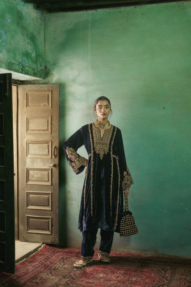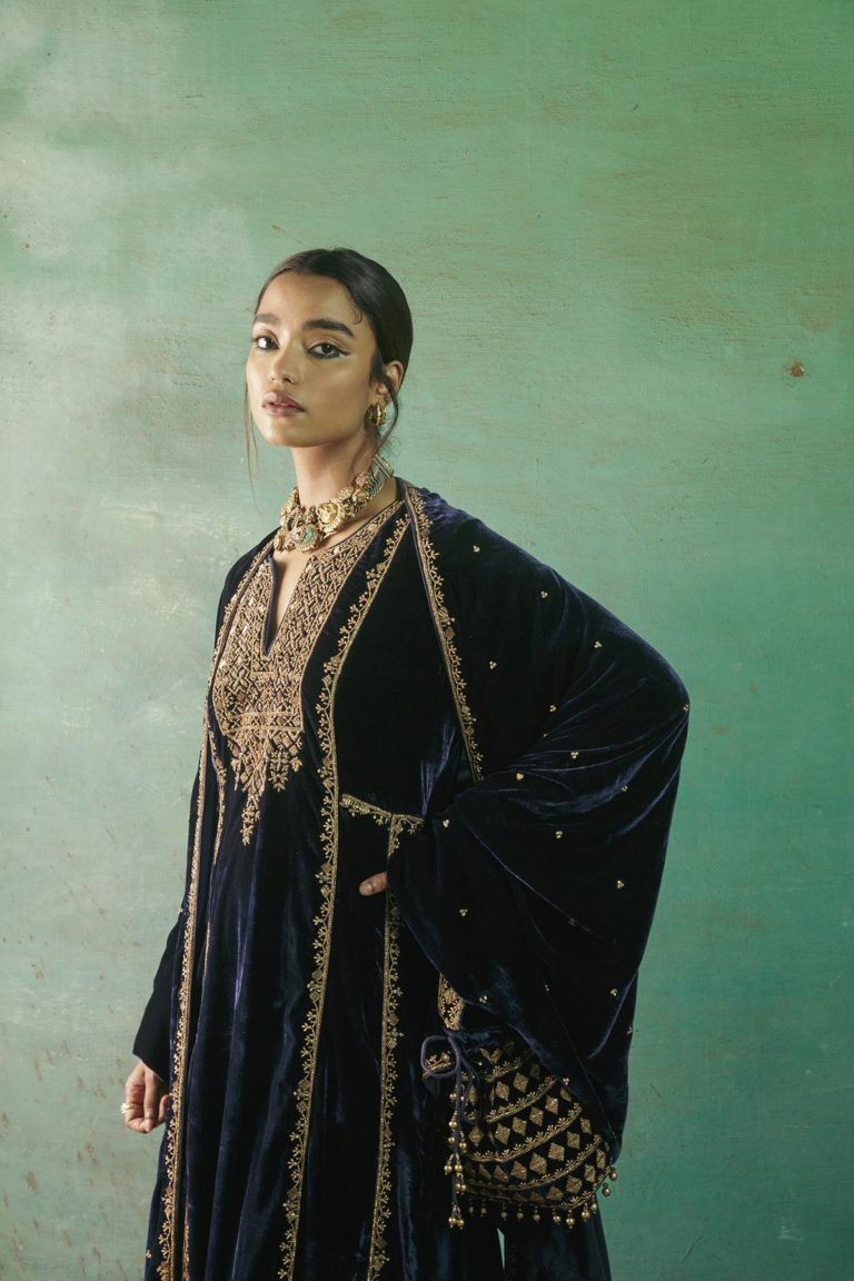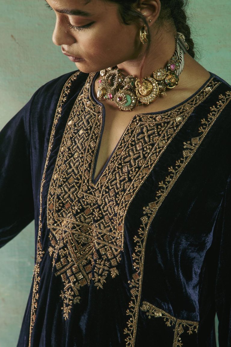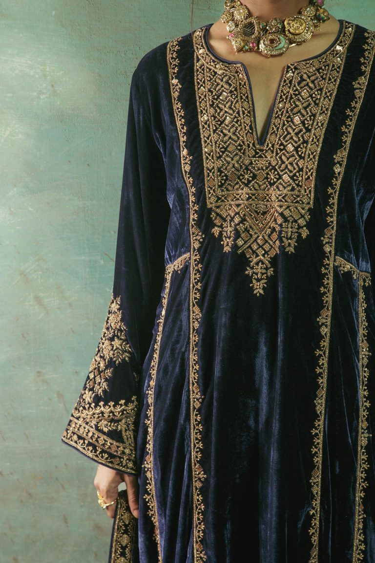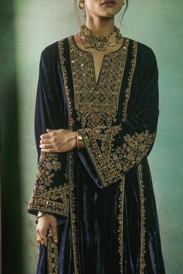 A jewel tone extravaganza — this kalidaar kurta and salwar set is all about polished perfection. Jewel-toned richness meets the subtle glint of aari, cutdana, sitara and zardozi work. Opt for an embellished velvet dupatta for a traditional look. Antique gold jewellery and this set go hand in hand.