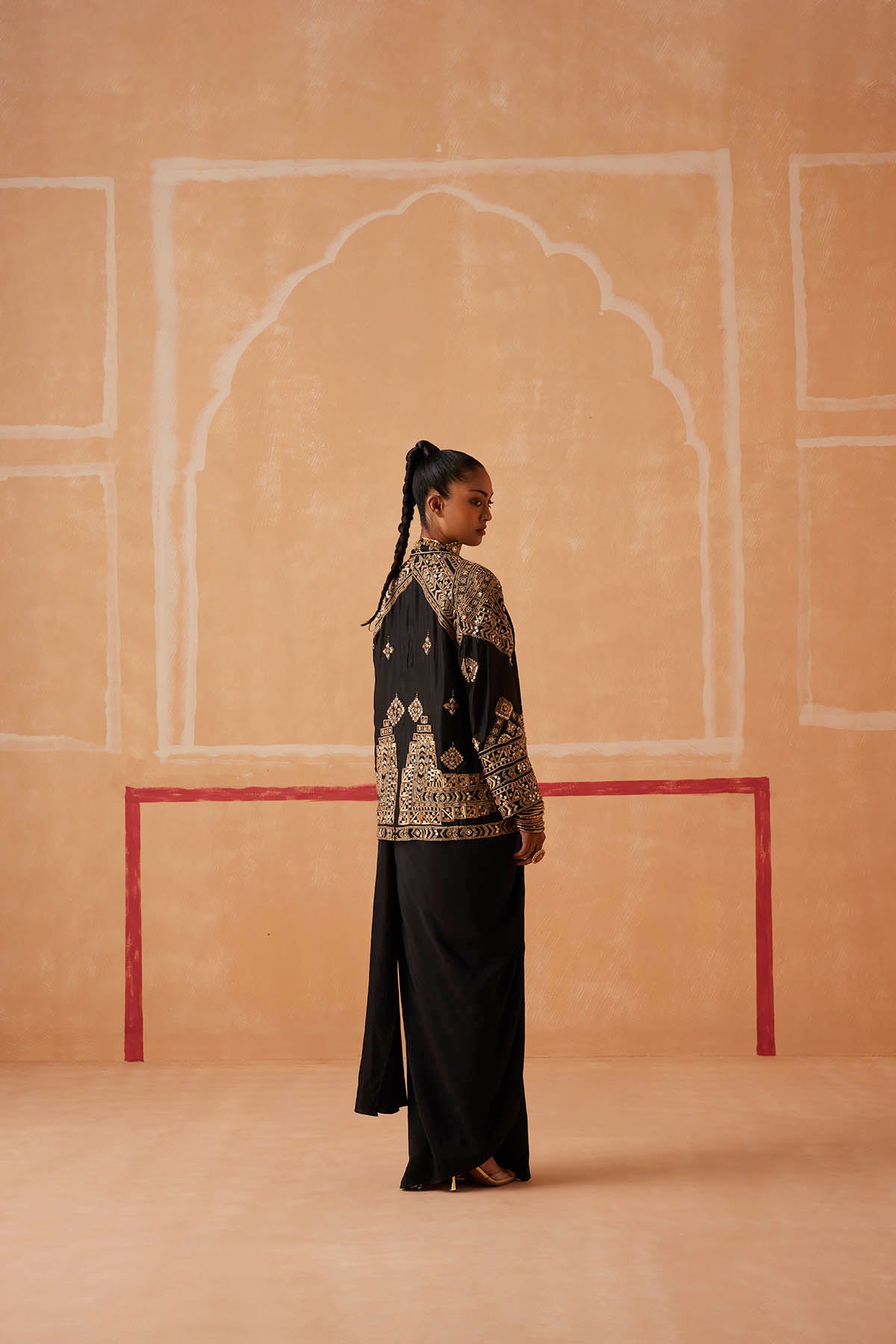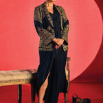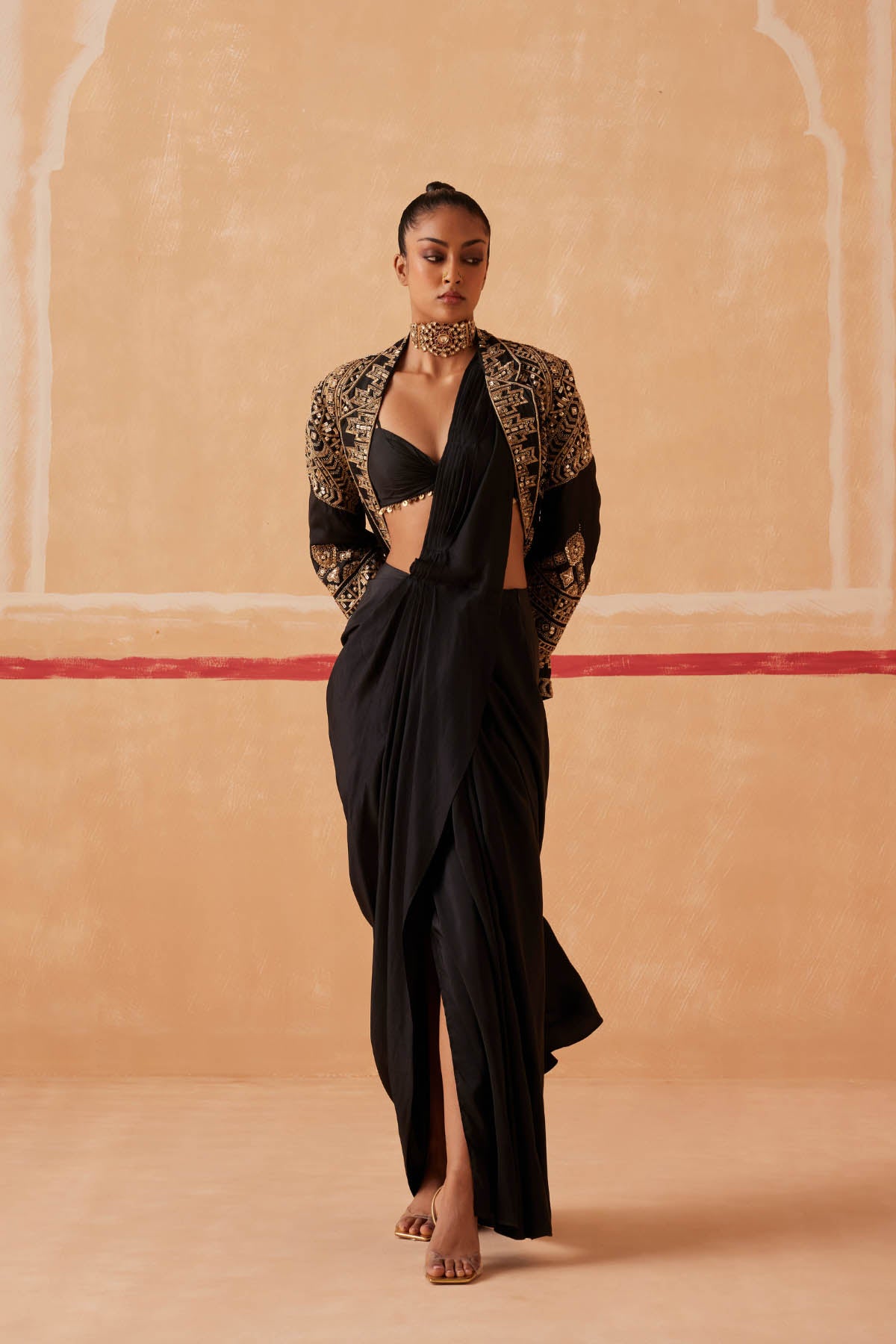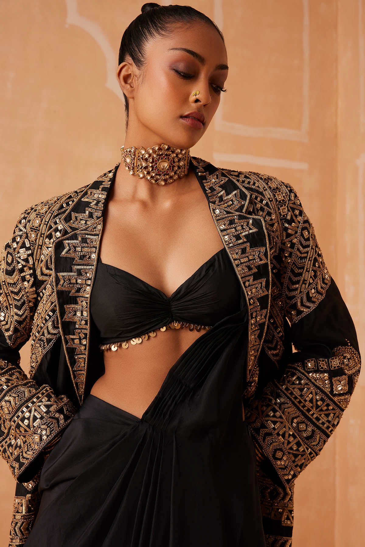 Age-old traditions and contemporary aesthetics fuse in cadence to create the perfect jacket set. Geometric hand embroidered motifs in antique gold adorn the meticulously tailored jacket made in pure silk. Paired with a modern draped saree featuring high slits, this ensemble is all you need to make a statement.