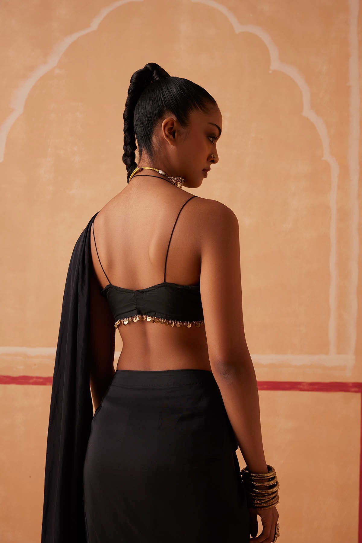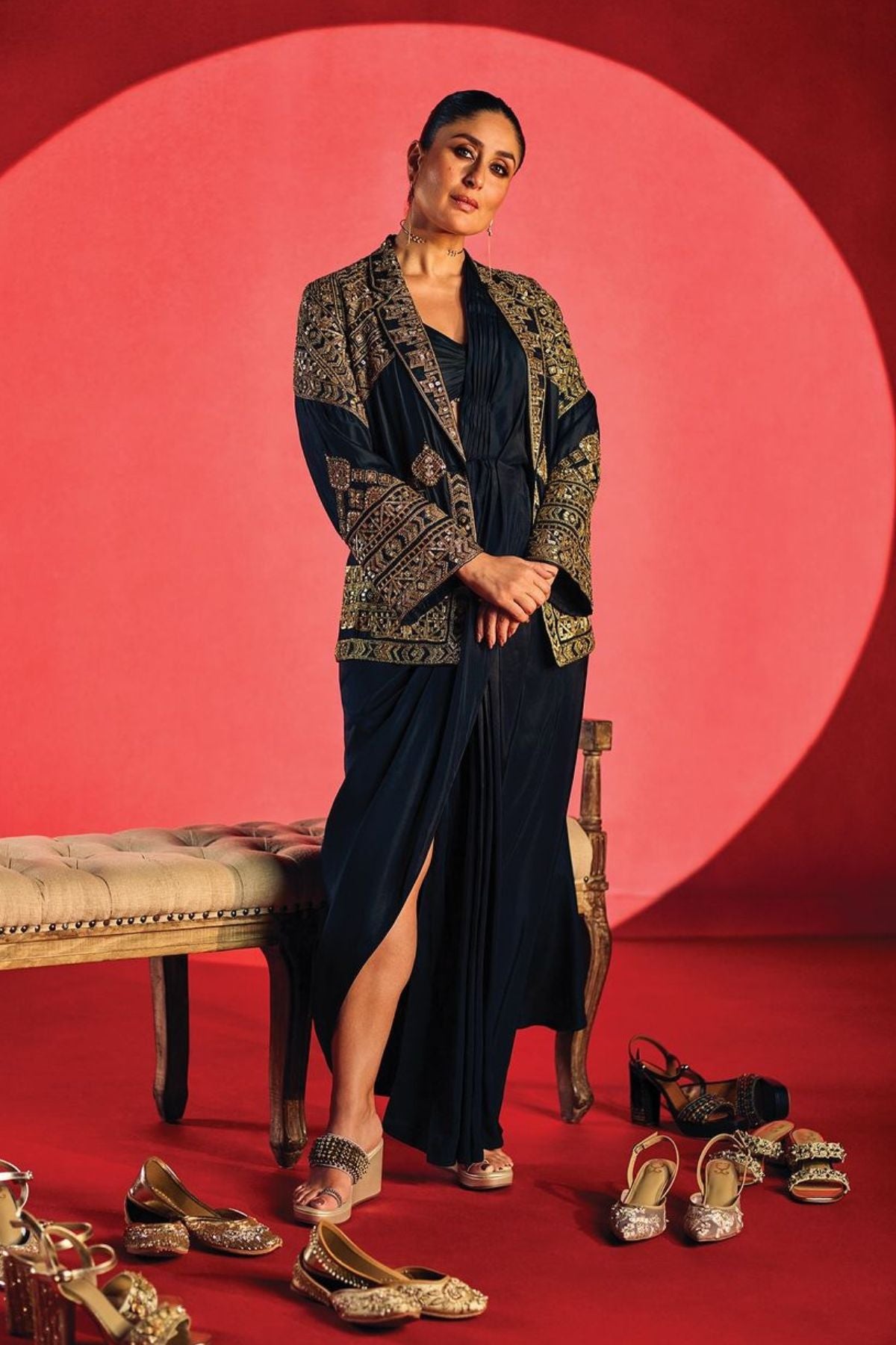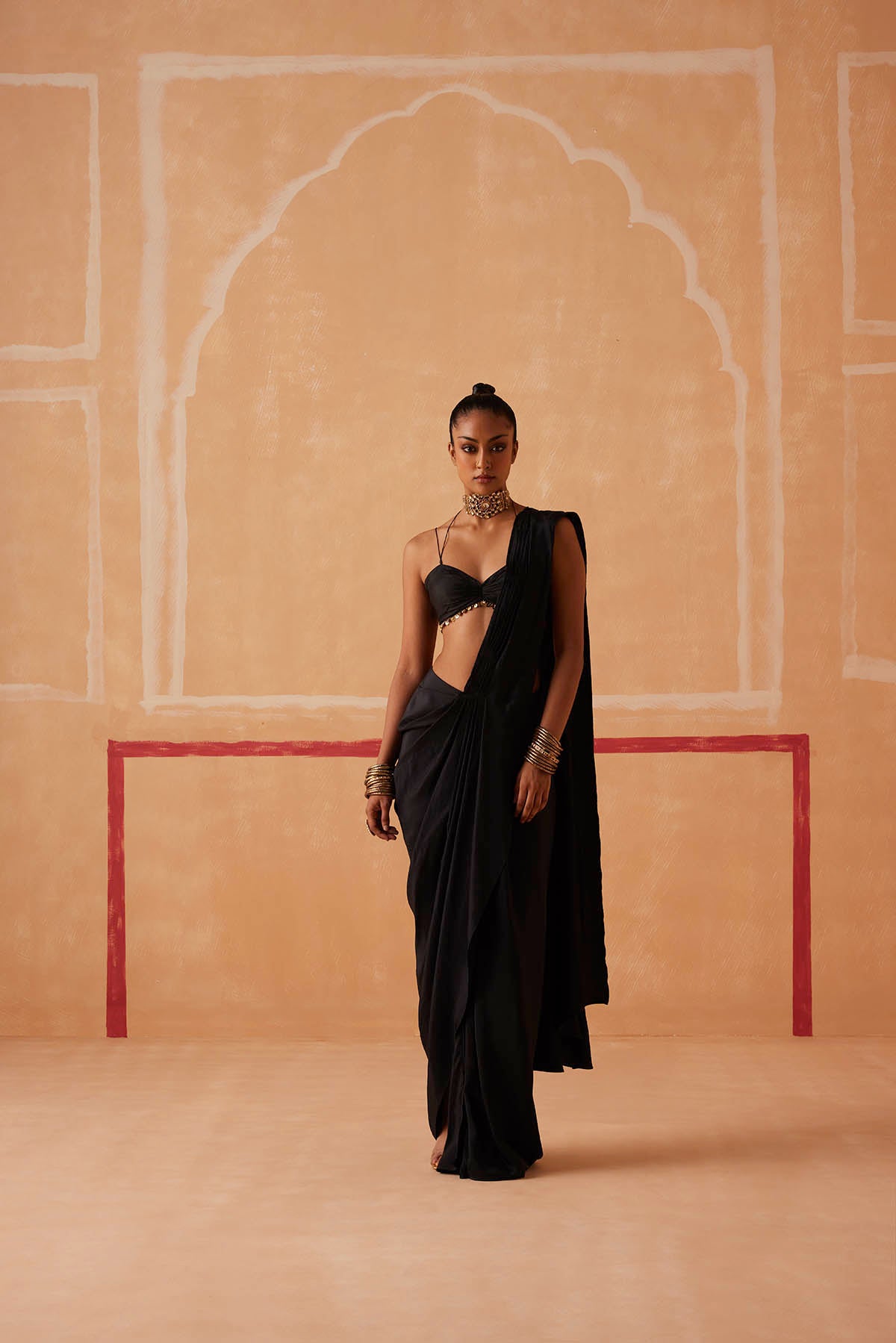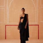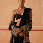 Age-old traditions and contemporary aesthetics fuse in cadence to create the perfect jacket set. Geometric hand embroidered motifs in antique gold adorn the meticulously tailored jacket made in pure silk. Paired with a modern draped saree featuring high slits, this ensemble is all you need to make a statement.