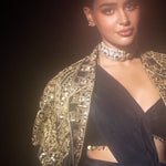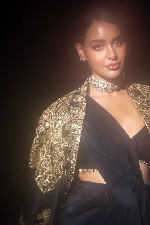 Age-old traditions and contemporary aesthetics fuse in cadence to create the perfect jacket set. Geometric hand embroidered motifs in antique gold adorn the meticulously tailored jacket made in pure silk. Paired with a modern draped saree featuring high slits, this ensemble is all you need to make a statement.
