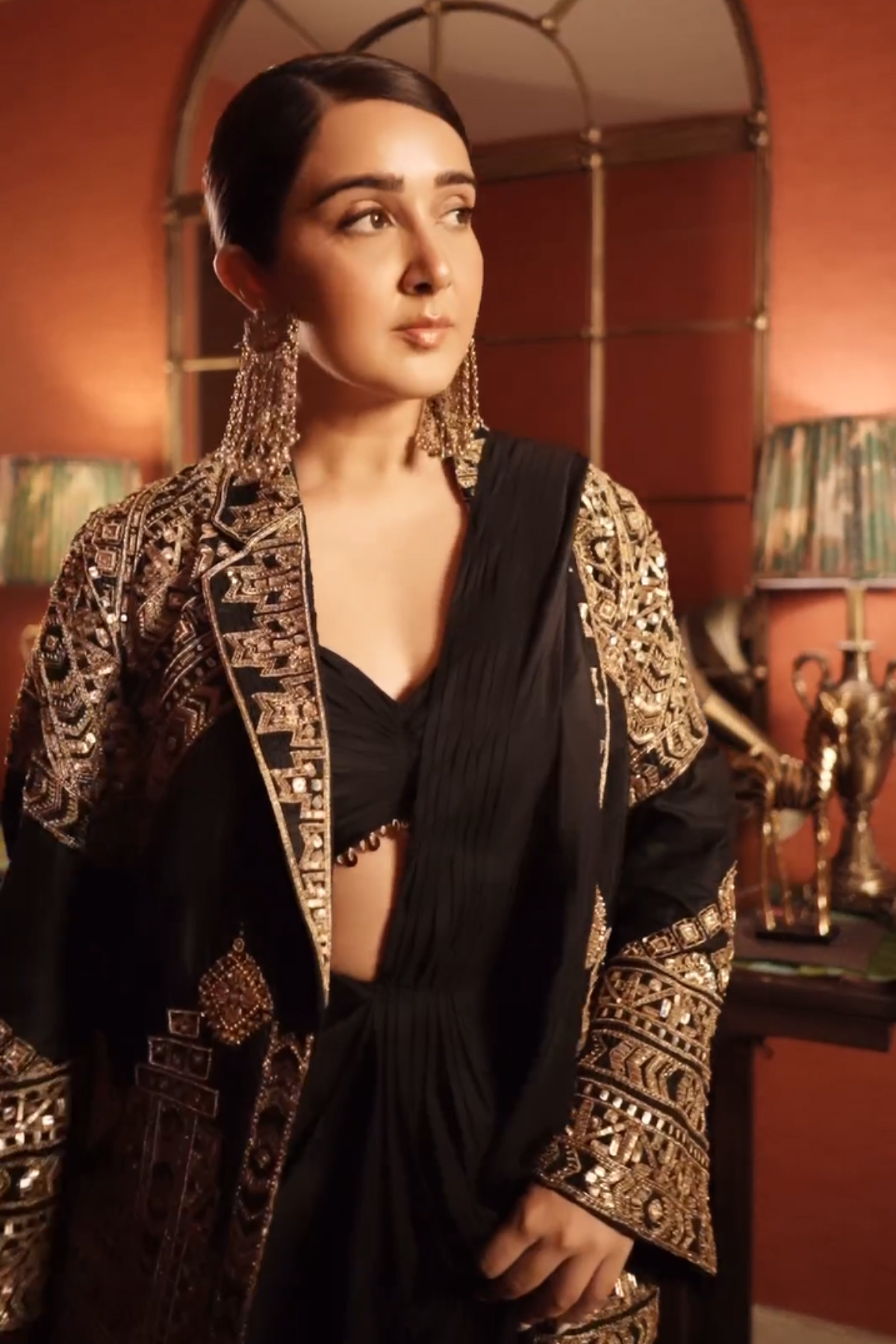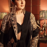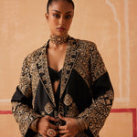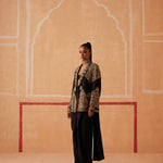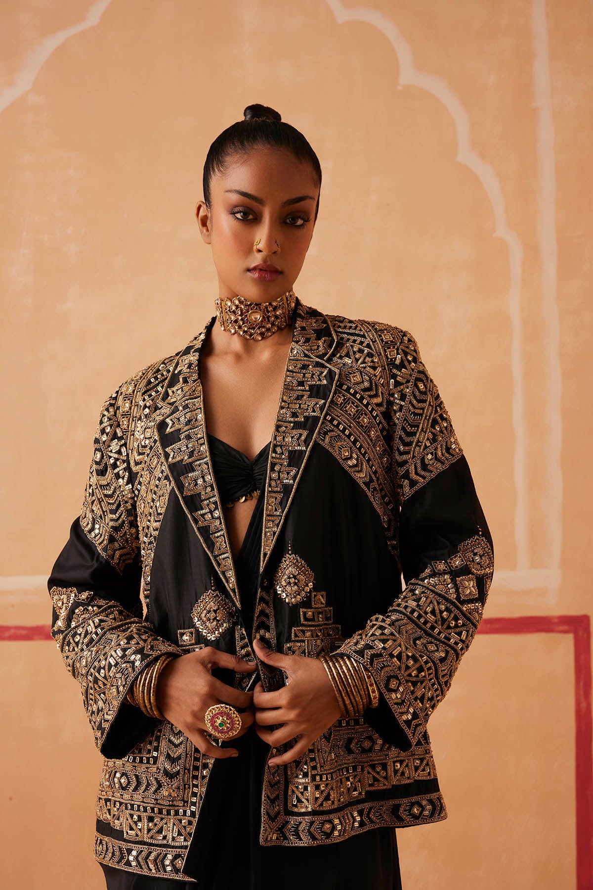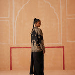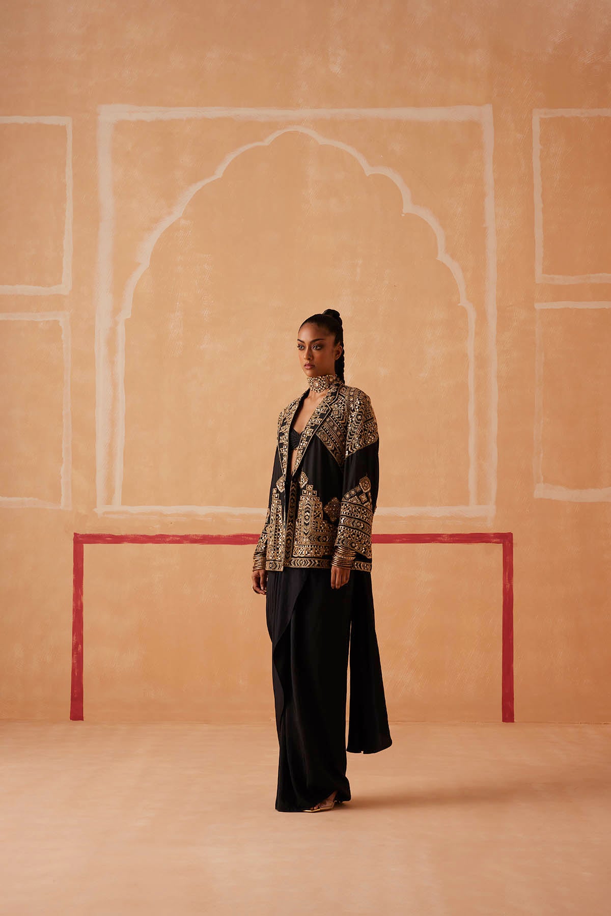 Age-old traditions and contemporary aesthetics fuse in cadence to create the perfect jacket set. Geometric hand embroidered motifs in antique gold adorn the meticulously tailored jacket made in pure silk. Paired with a modern draped saree featuring high slits, this ensemble is all you need to make a statement.