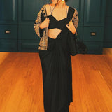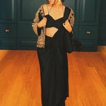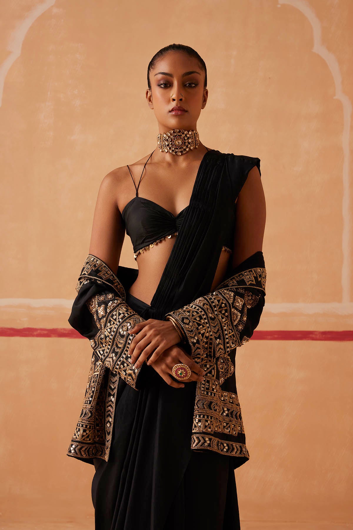 Age-old traditions and contemporary aesthetics fuse in cadence to create the perfect jacket set. Geometric hand embroidered motifs in antique gold adorn the meticulously tailored jacket made in pure silk. Paired with a modern draped saree featuring high slits, this ensemble is all you need to make a statement.