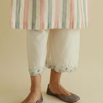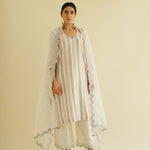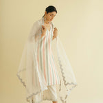 Time honoured classic with a modern twist – the elegance of pristine ivory, and the vintage charm of sea green and blush pink come together to create a thorough pastel delight. The tri-coloured silk chanderi patchwork stripes give the kurta contemporary flair. It comes paired with hand-embroidered palazzos and a dreamy scalloped organza dupatta that is accentuated with intricate resham and badla embroidery.