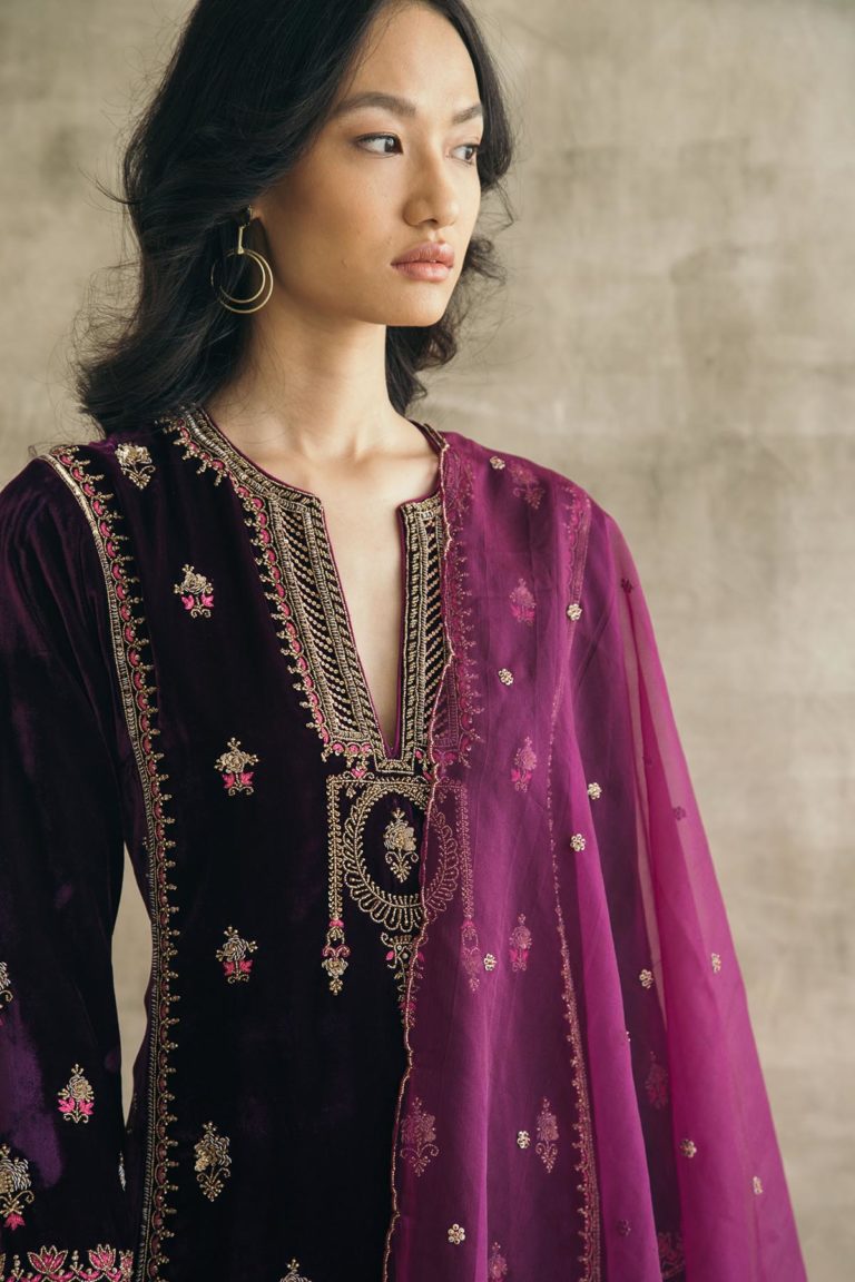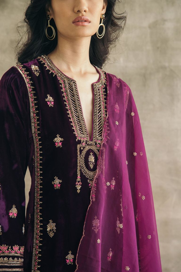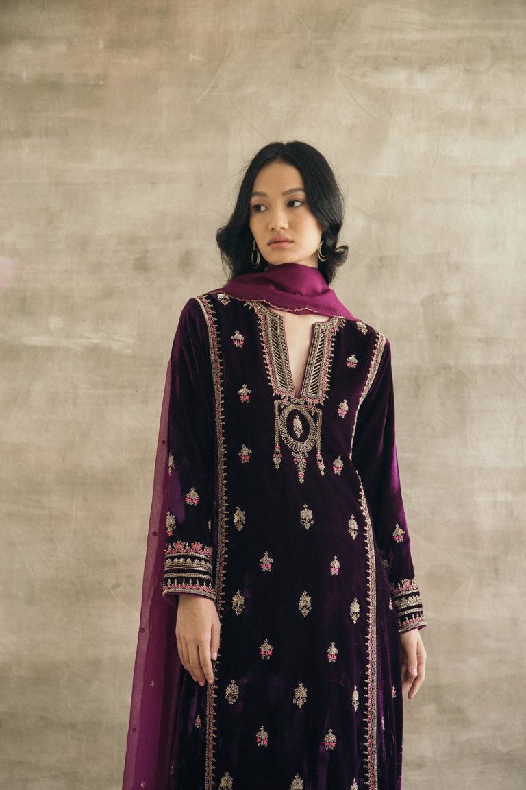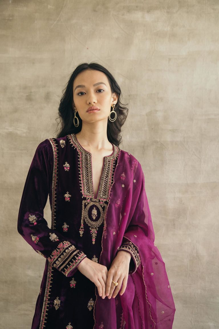 Plum perfection — don head-to-toe velvet with this kalidaar silk velvet kurta with scalloped palazzos and an embroidered organza dupatta. The zardozi hand-embroidered motifs spread across the kurta are the hero of this piece, and find their inspiration in the royal robes of Mughal queens.