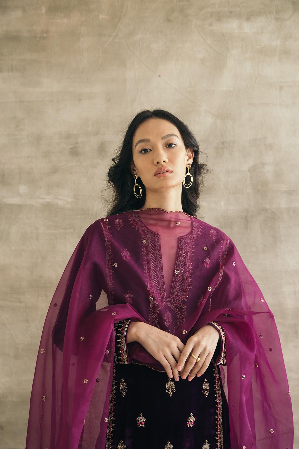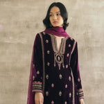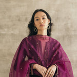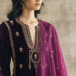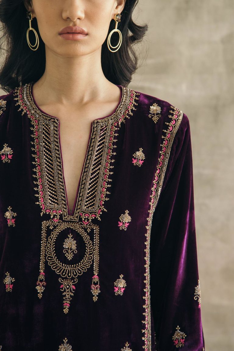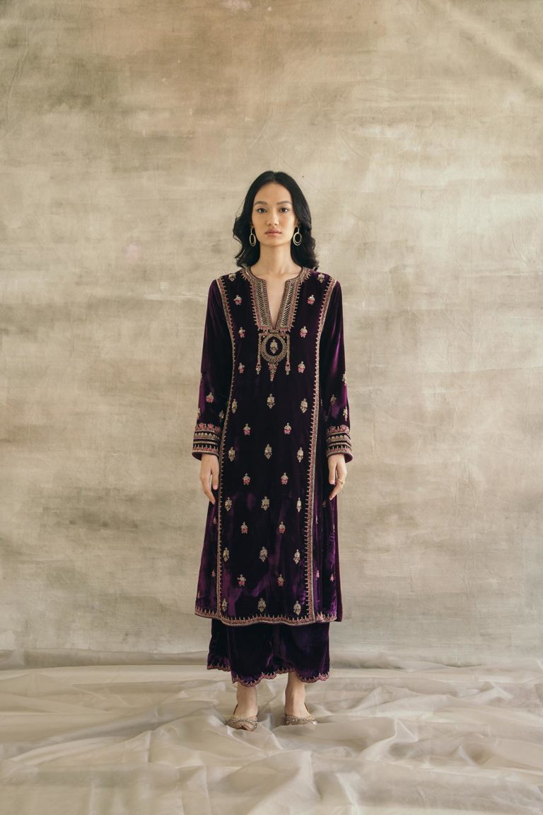 Plum perfection — don head-to-toe velvet with this kalidaar silk velvet kurta with scalloped palazzos and an embroidered organza dupatta. The zardozi hand-embroidered motifs spread across the kurta are the hero of this piece, and find their inspiration in the royal robes of Mughal queens.