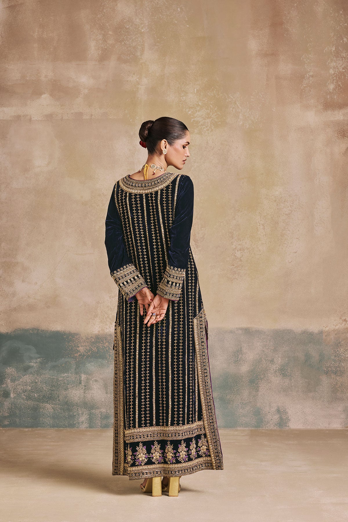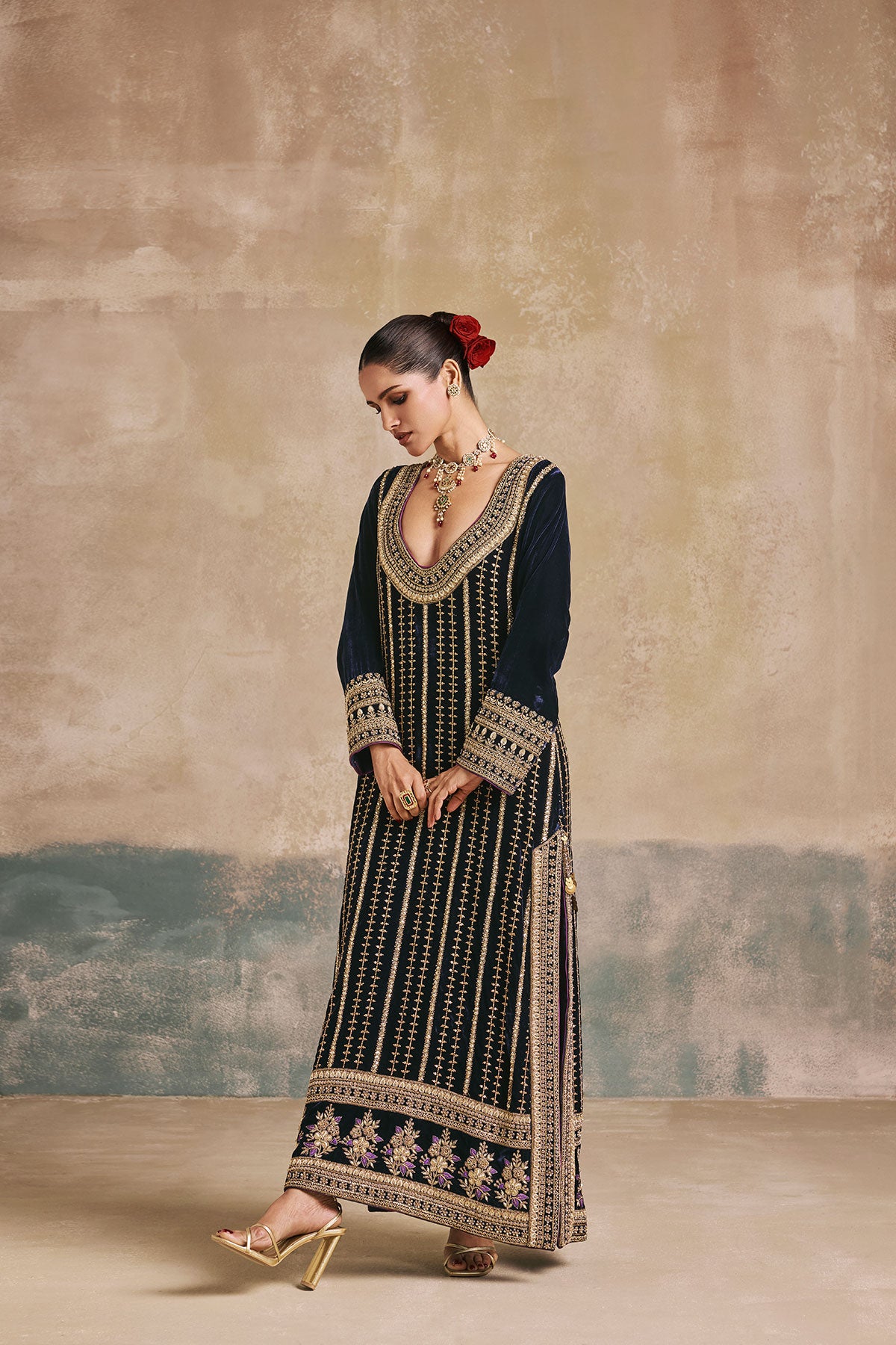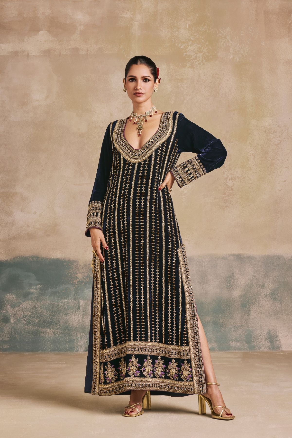This navy blue kaftan comes adorned with antique gold embroidery, detailed Mughal-inspired motifs, and a statement neckline. The vertical embroidery elongates the silhouette, while ornate hemwork adds a regal touch. Perfect for weddings, festive evenings, and celebrations that call for a contemporary statement.