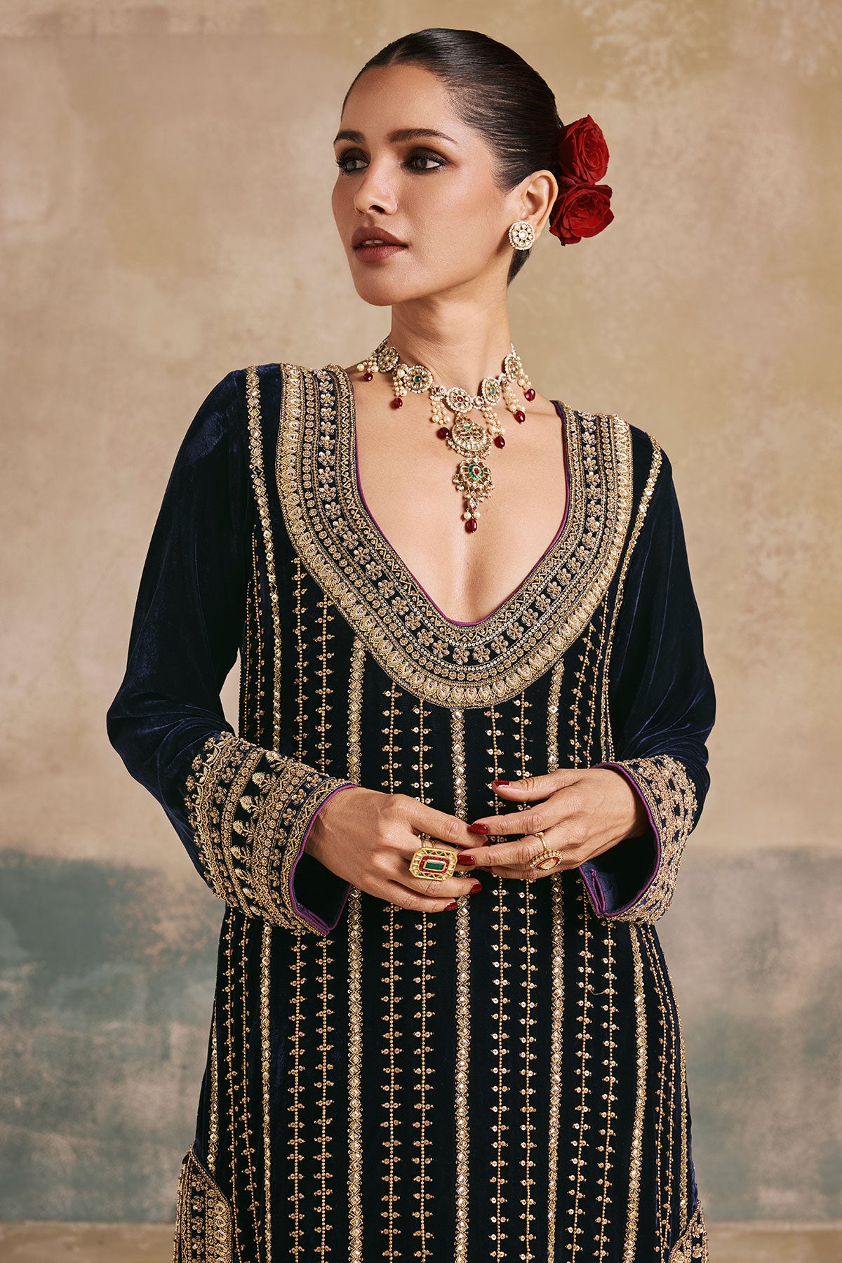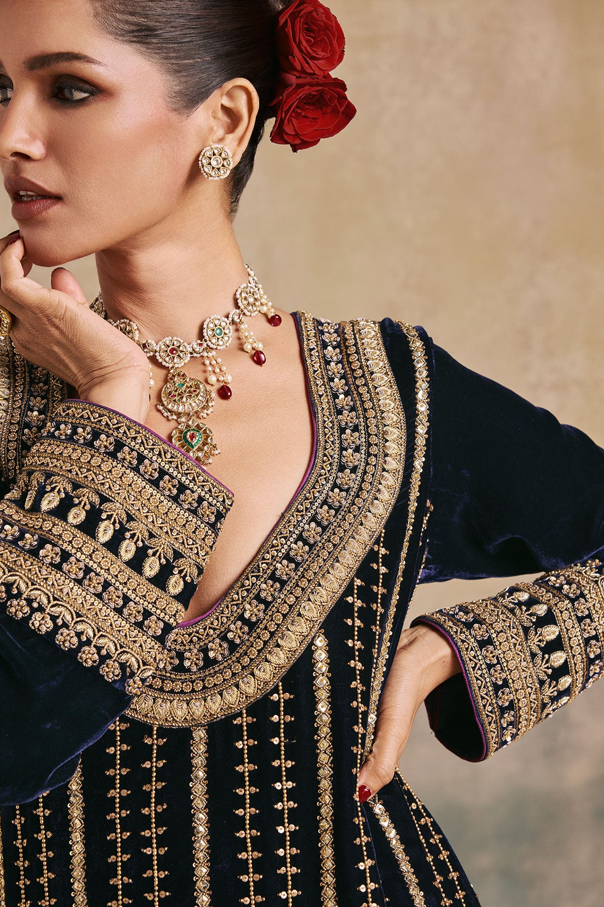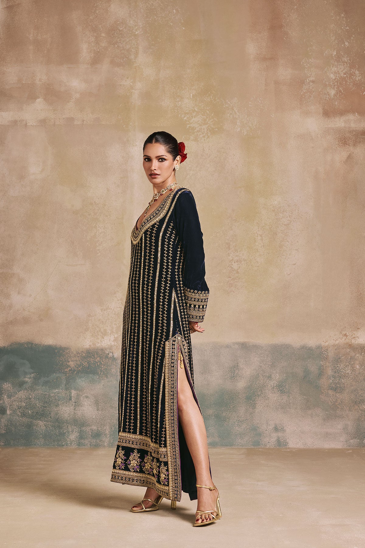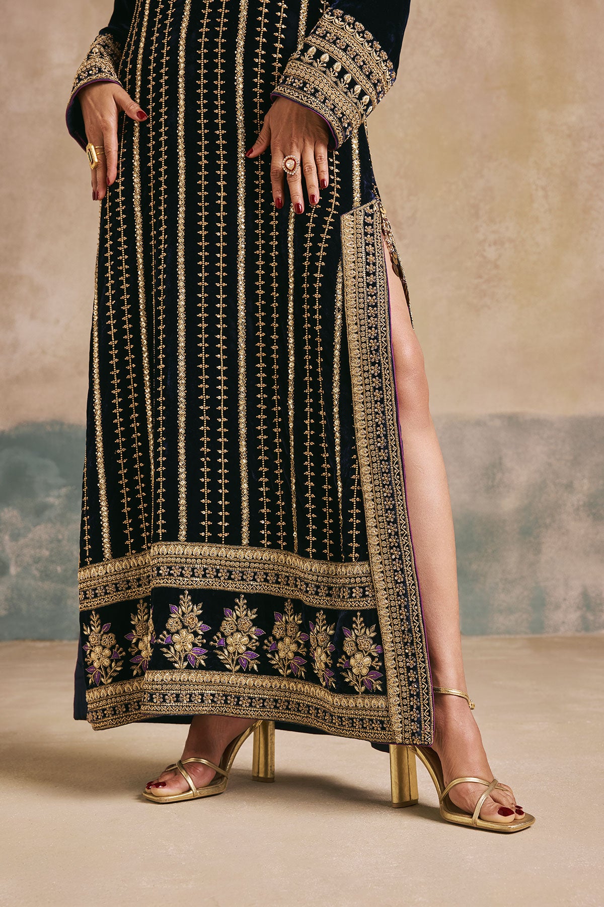This navy blue kaftan comes adorned with antique gold embroidery, detailed Mughal-inspired motifs, and a statement neckline. The vertical embroidery elongates the silhouette, while ornate hemwork adds a regal touch. Perfect for weddings, festive evenings, and celebrations that call for a contemporary statement.