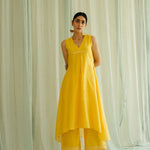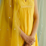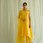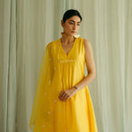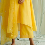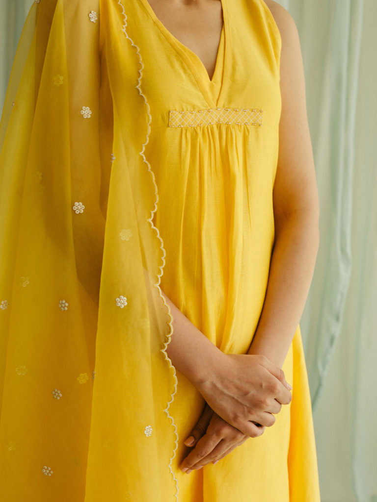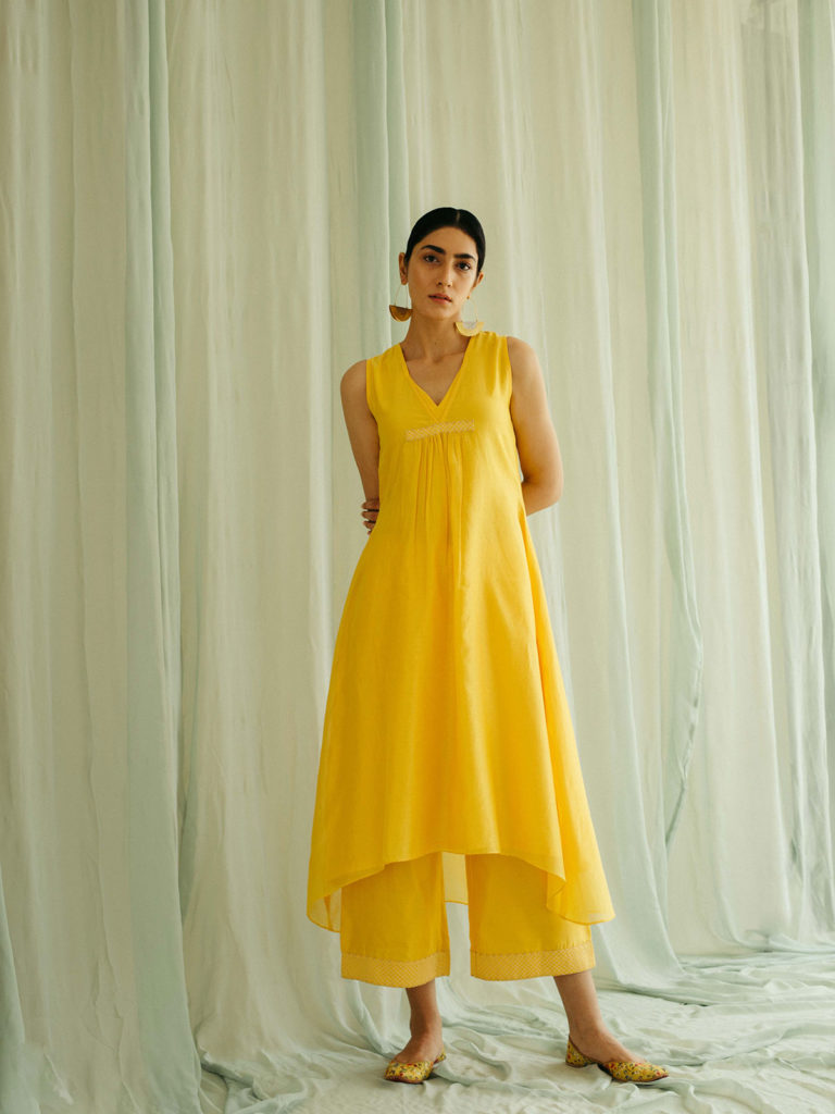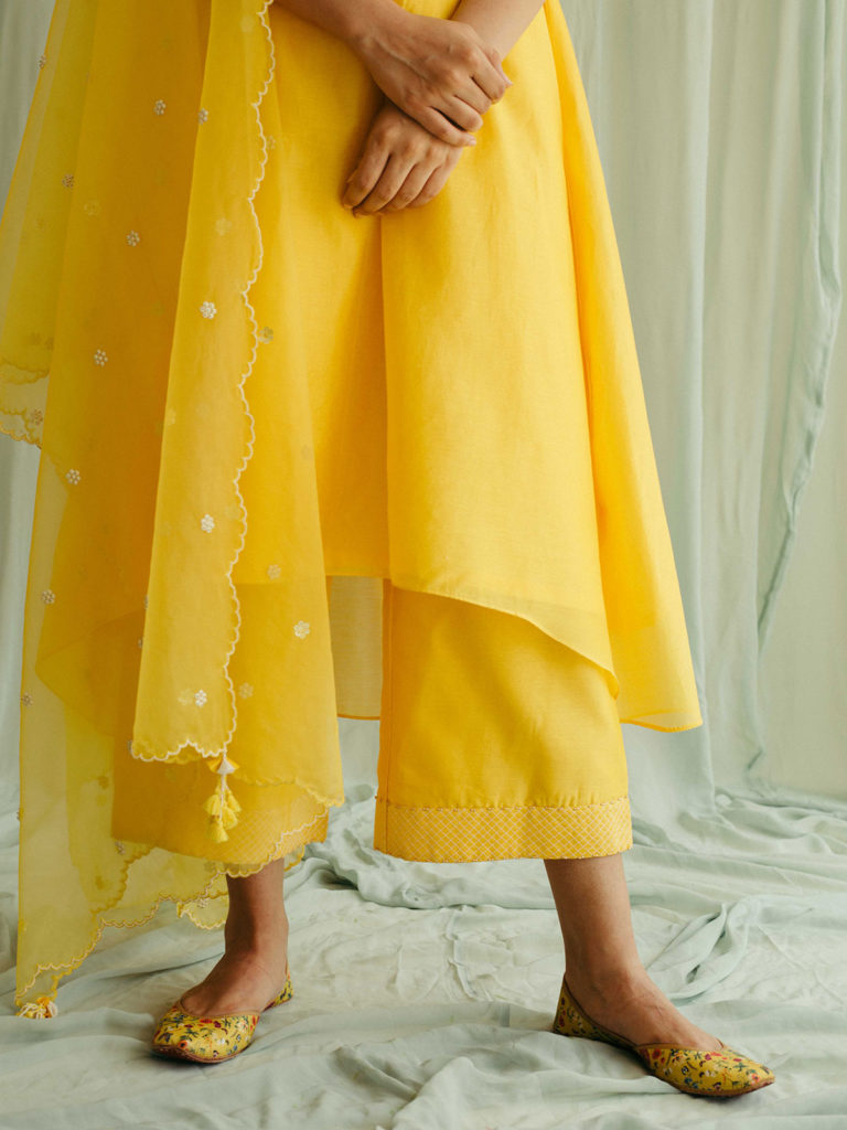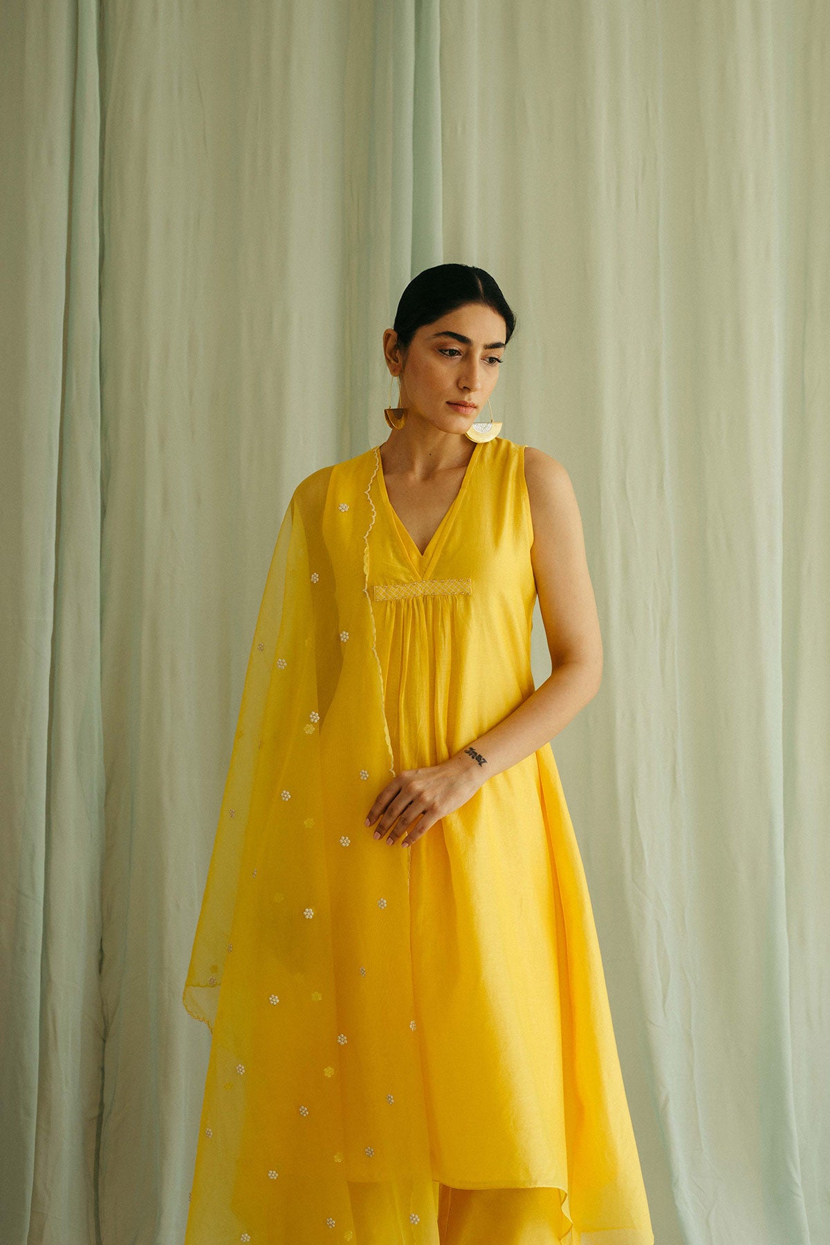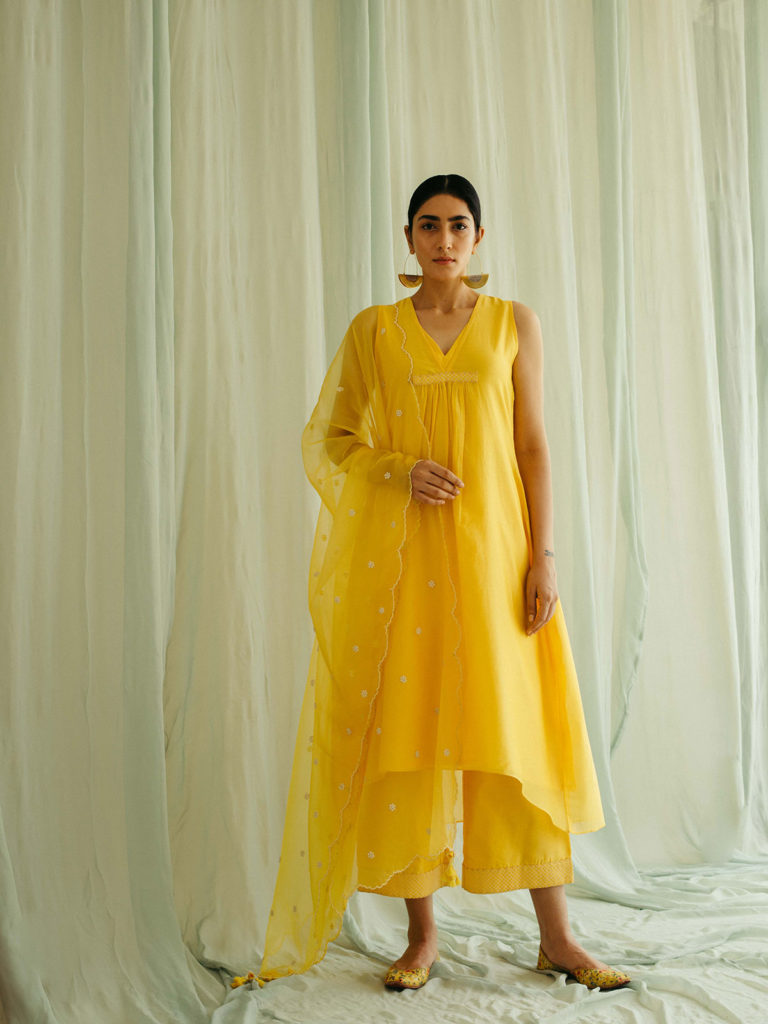 A burst of sunshine — This silk chanderi set features an ivory thread stitch detailing on the kurta yoke and palazzo hemline. The hand-embroidered organza dupatta has been sprinkled with ivory bead and sitara motifs, and finished with a scalloped yellow thread and bead border. A lesson in maximum impact, minimum effort.