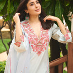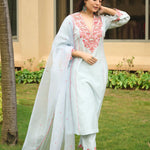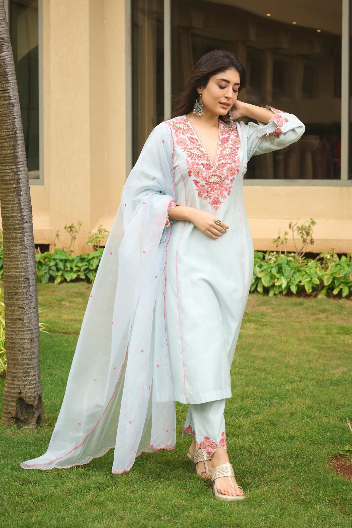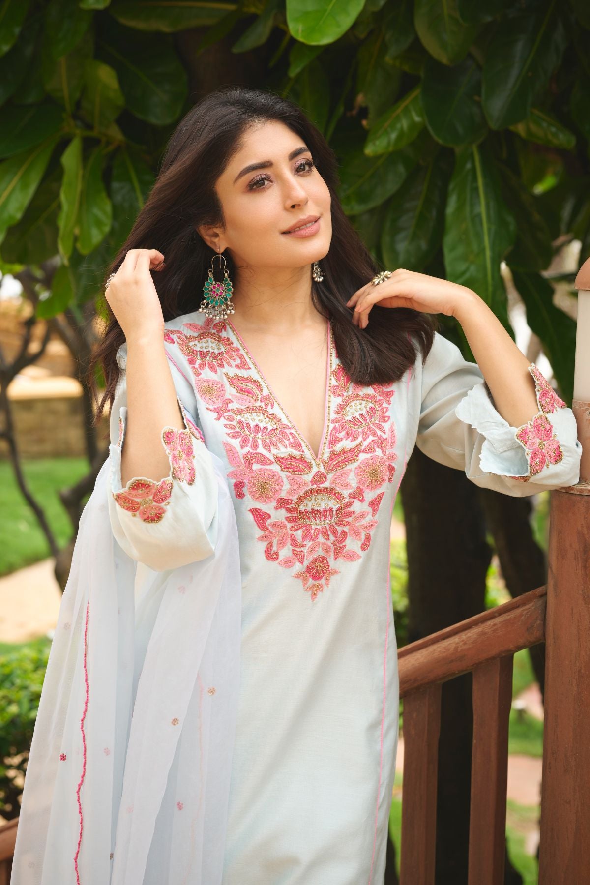 Our exquisite ice blue kurta set, perfect for the modern woman who loves a touch of traditional elegance. Featuring bell sleeves and a plunging V-shaped neckline, this set is adorned with floral applique embroidery in dark and fuchsia pink. The palazzo bottoms are finished with scalloped edges for an extra touch of sophistication. The set comes paired with a sheer scalloped organza dupatta embellished with small beads and resham outlining for an elegant day look.