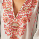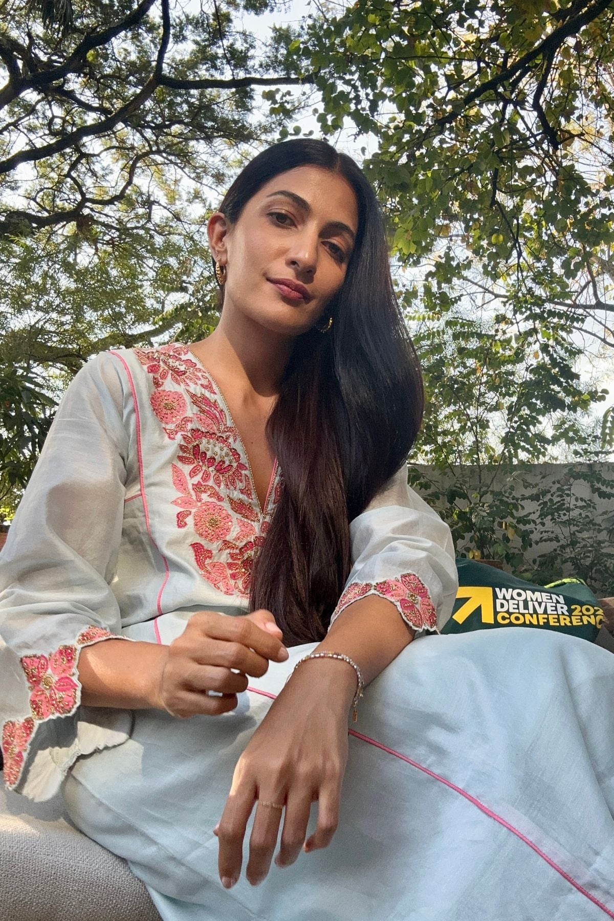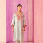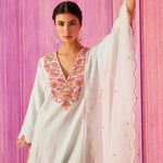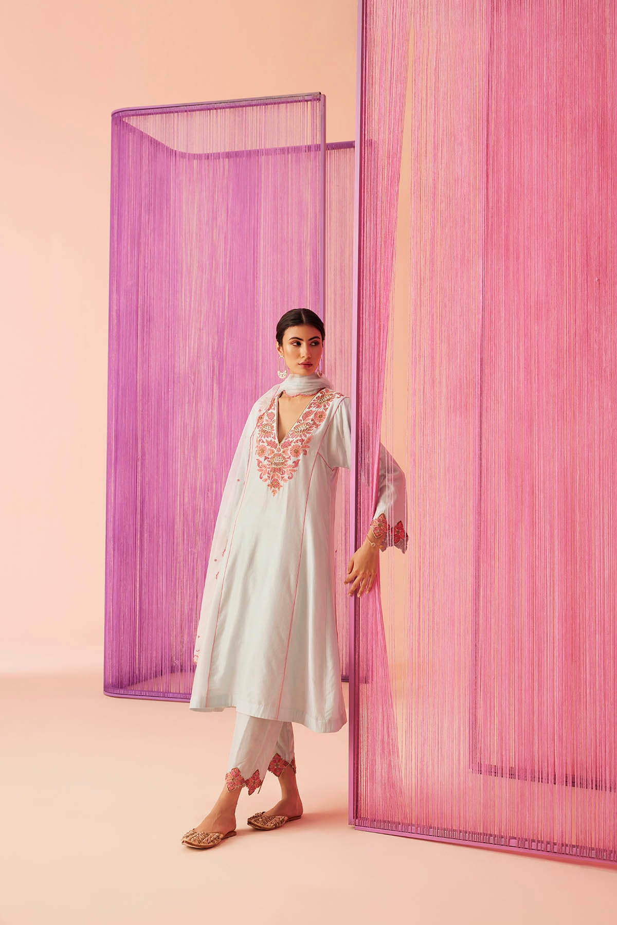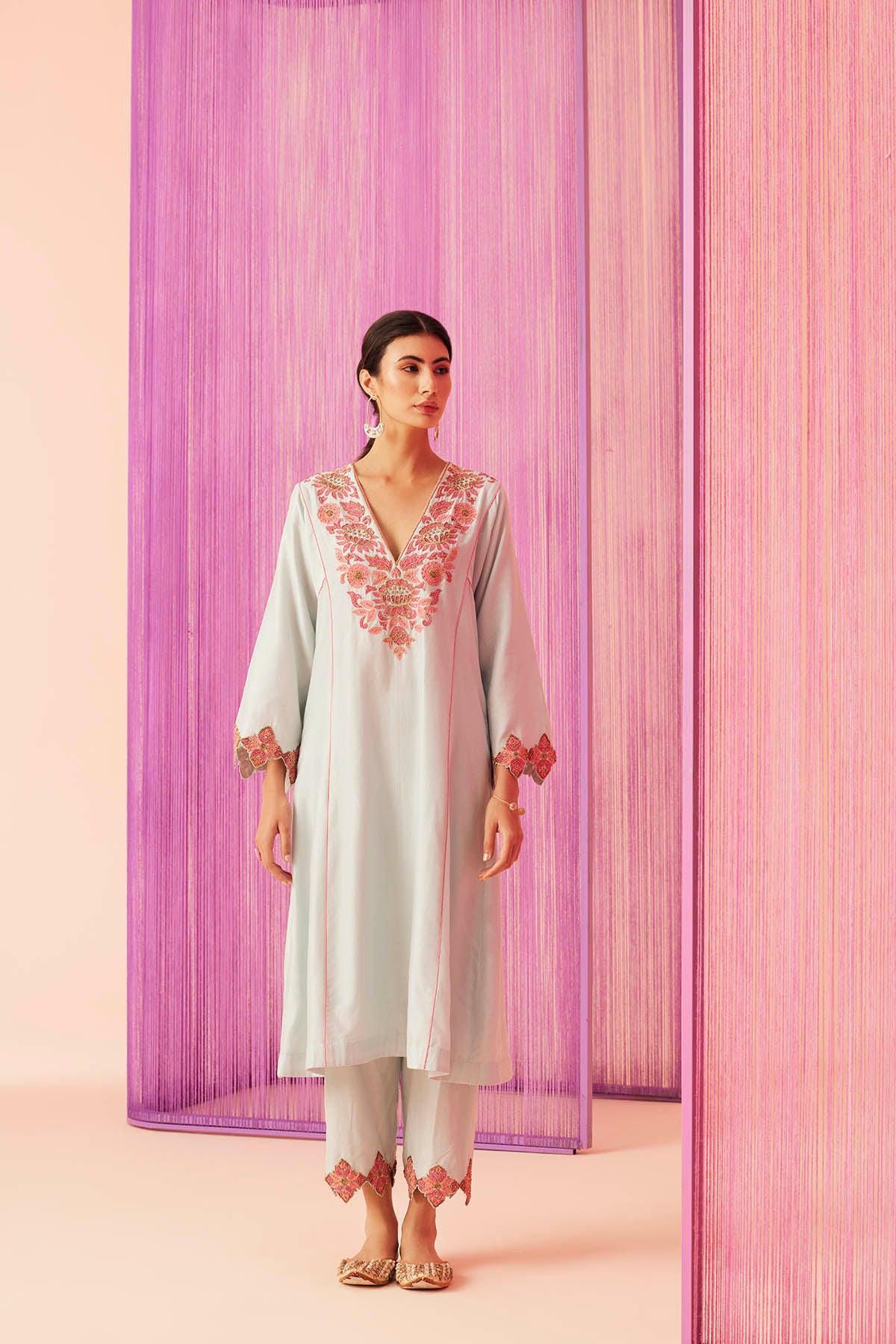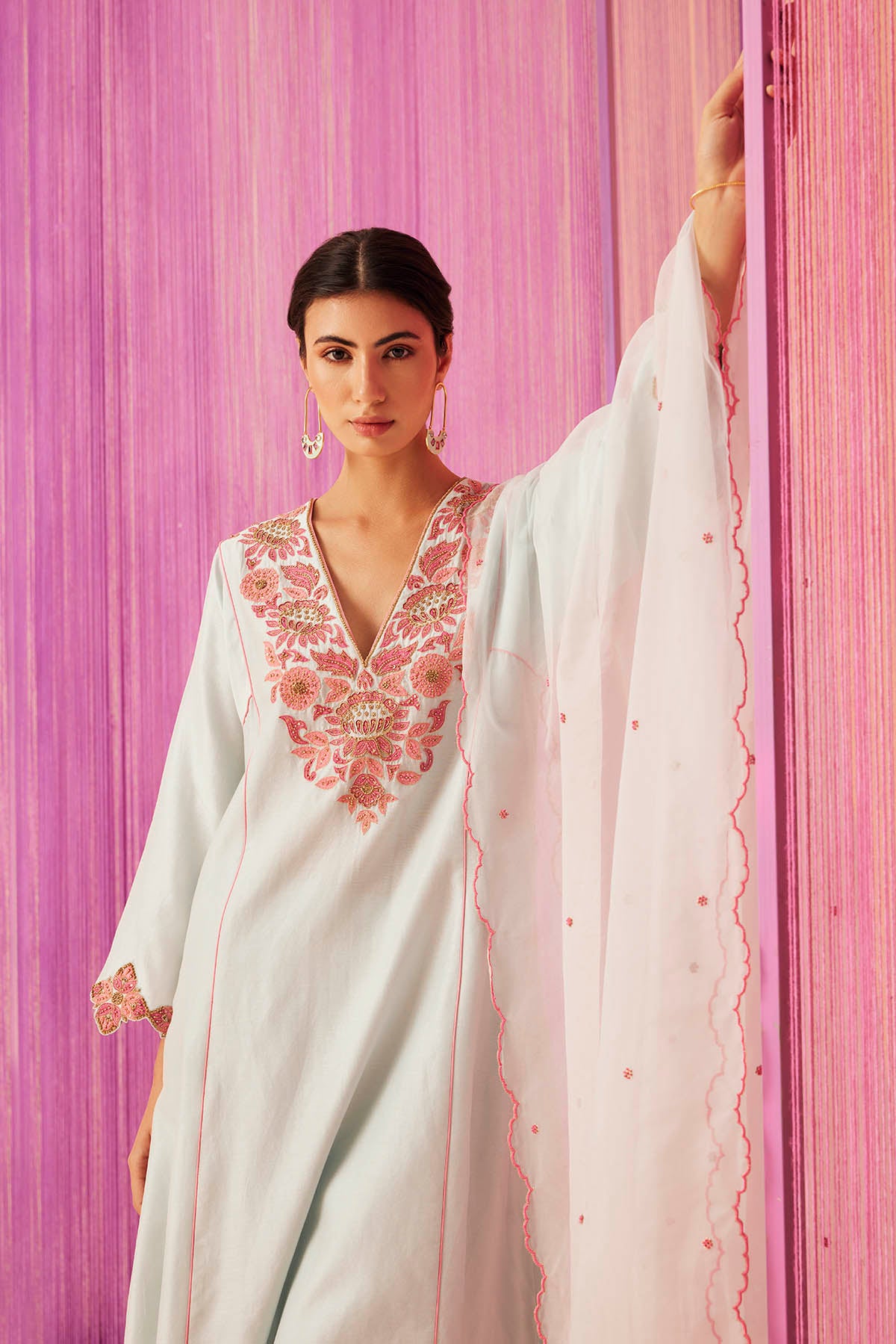 Our exquisite ice blue kurta set, perfect for the modern woman who loves a touch of traditional elegance. Featuring bell sleeves and a plunging V-shaped neckline, this set is adorned with floral applique embroidery in dark and fuchsia pink. The palazzo bottoms are finished with scalloped edges for an extra touch of sophistication. The set comes paired with a sheer scalloped organza dupatta embellished with small beads and resham outlining for an elegant day look.