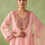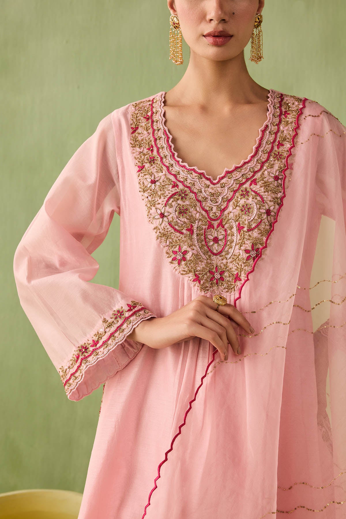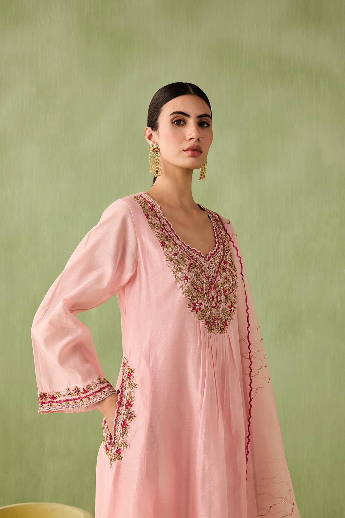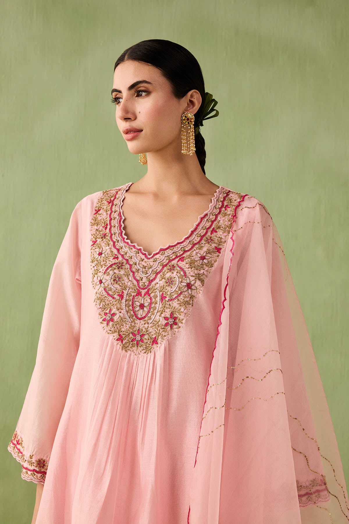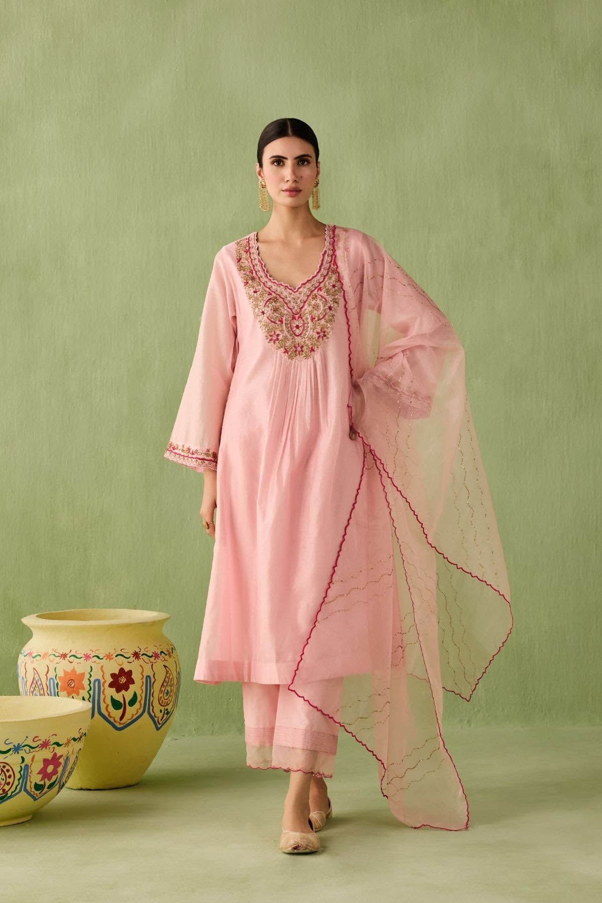 Modern minimalism meets traditional craftsmanship in this blush pink kurta set. With an embroidered yoke and bell sleeves, the kurta comes paired with an organza panelled pallazo that is expertly highlighted with resham, and zari lines to create a comfortable yet stylish look. The intricately embroidered leheriya waves on the dupatta add a touch of whimsy to the overall ensemble making it perfect for a summer wedding.