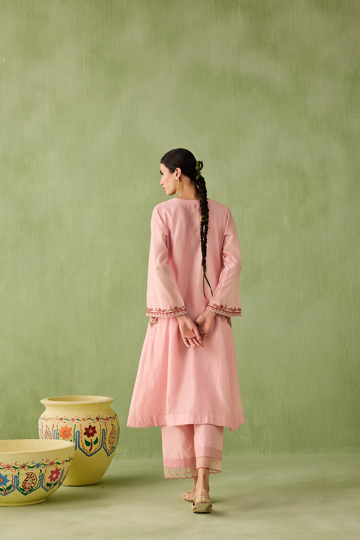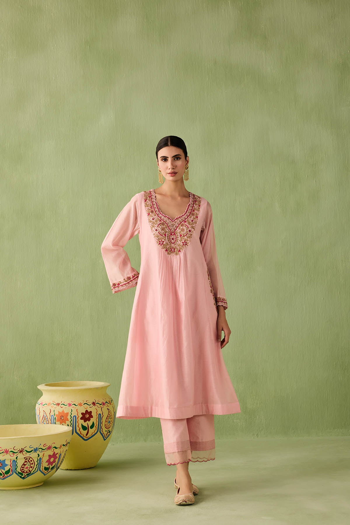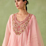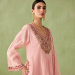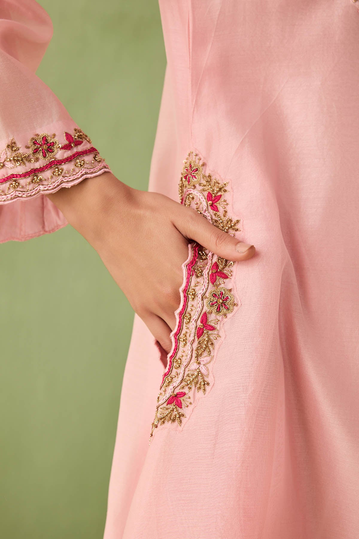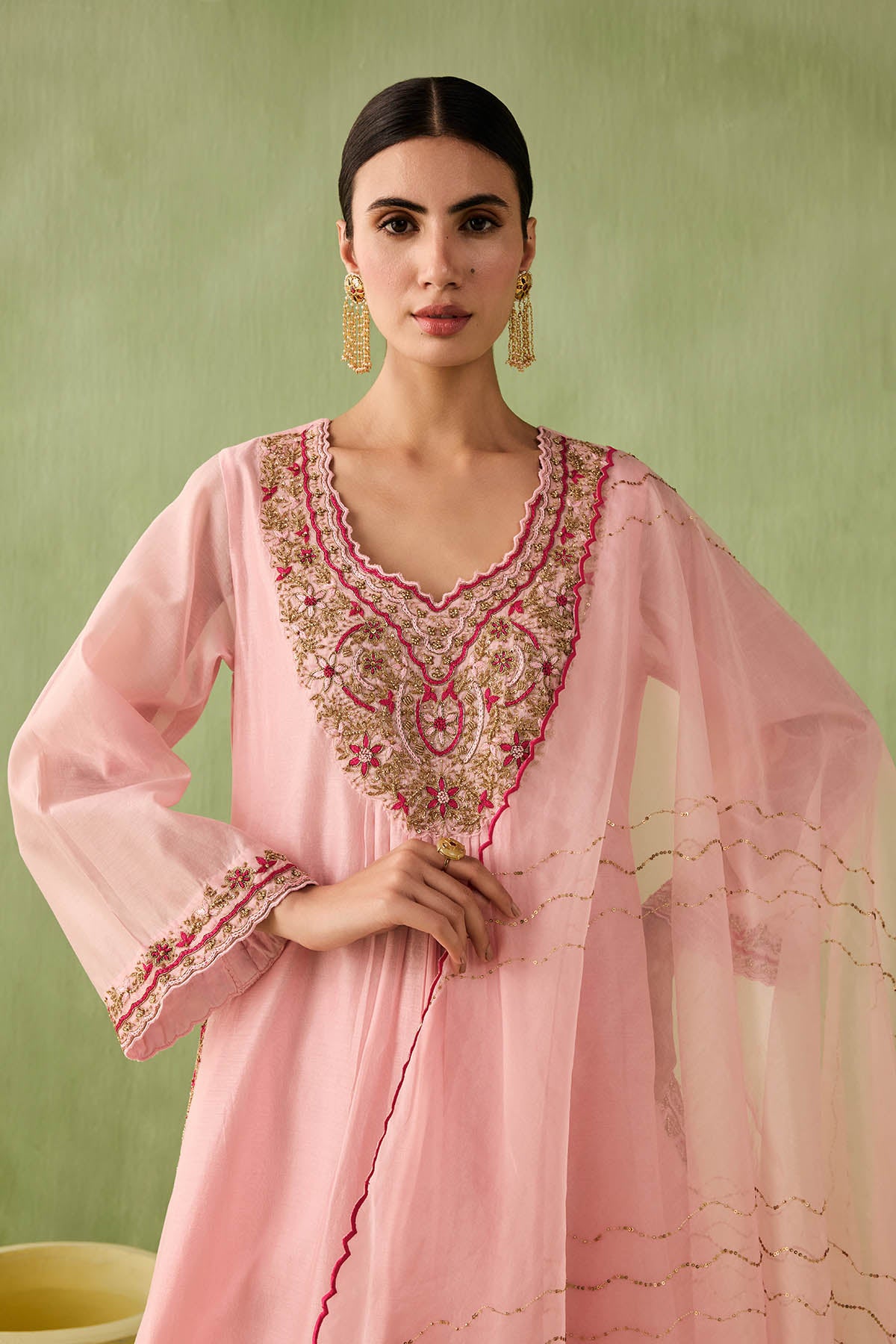 Modern minimalism meets traditional craftsmanship in this blush pink kurta set. With an embroidered yoke and bell sleeves, the kurta comes paired with an organza panelled pallazo that is expertly highlighted with resham, and zari lines to create a comfortable yet stylish look. The intricately embroidered leheriya waves on the dupatta add a touch of whimsy to the overall ensemble making it perfect for a summer wedding.