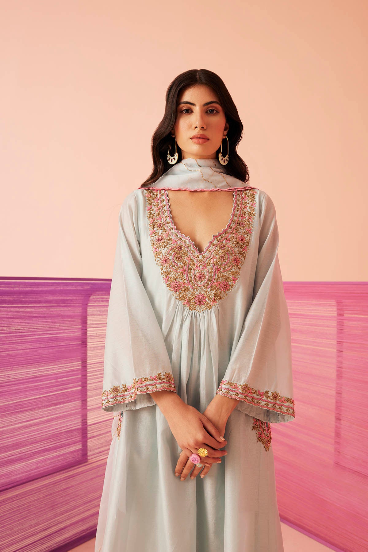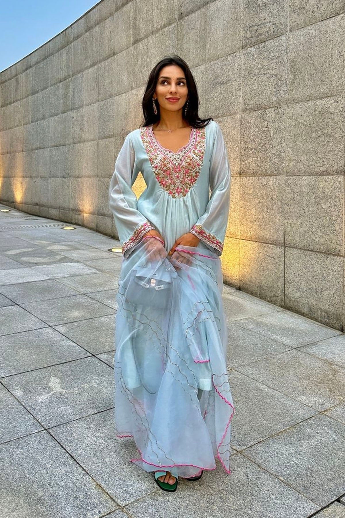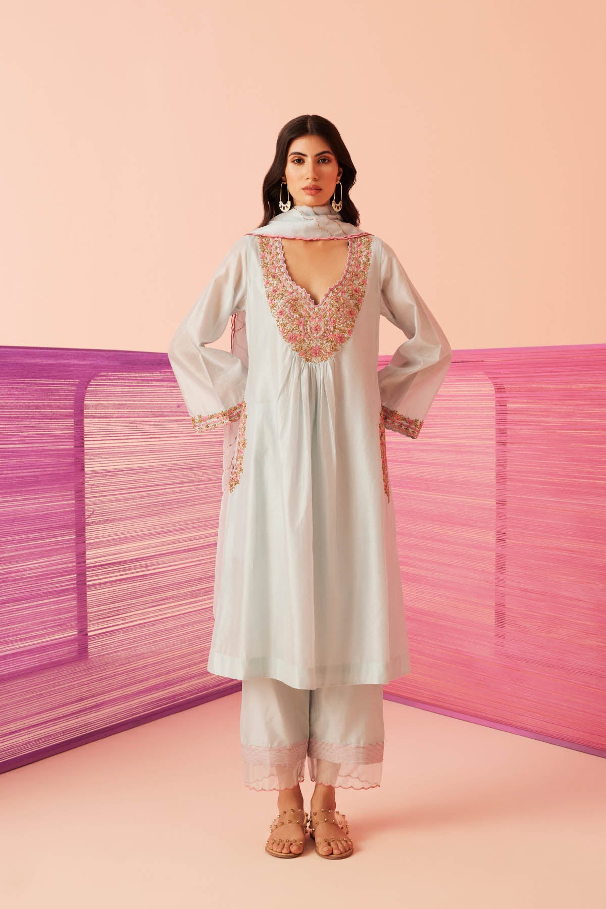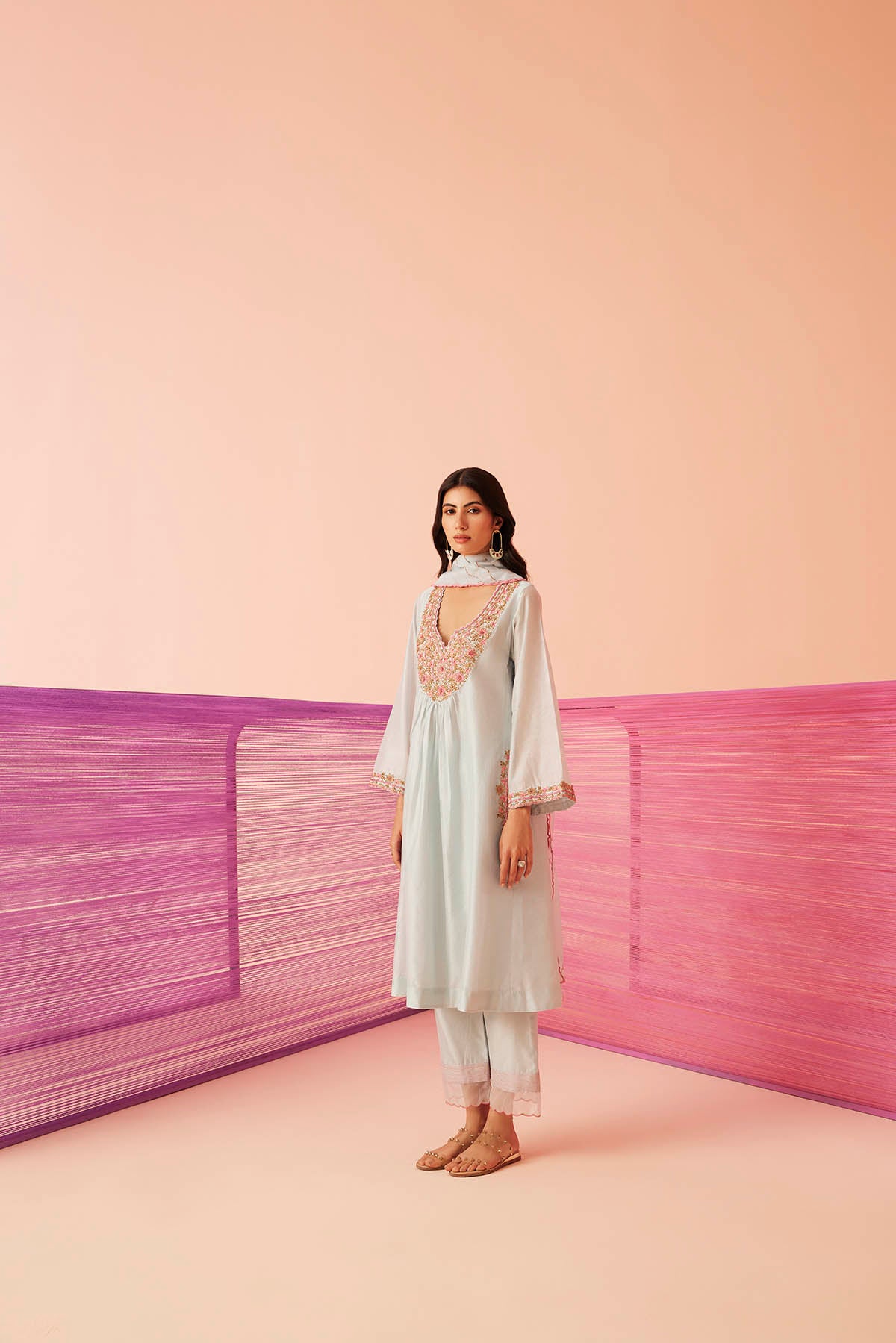 This refreshing ice blue kurta set is the perfect addition to your summer wardrobe. The beautiful floral applique embellishment in lilac, rose pink, and sea green adds a pop of colour to the classic design, while the lace detailing on the dupatta and bell sleeves elevate the overall look. With statement earrings and minimal makeup, the outfit is a sureshot head-turner.