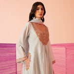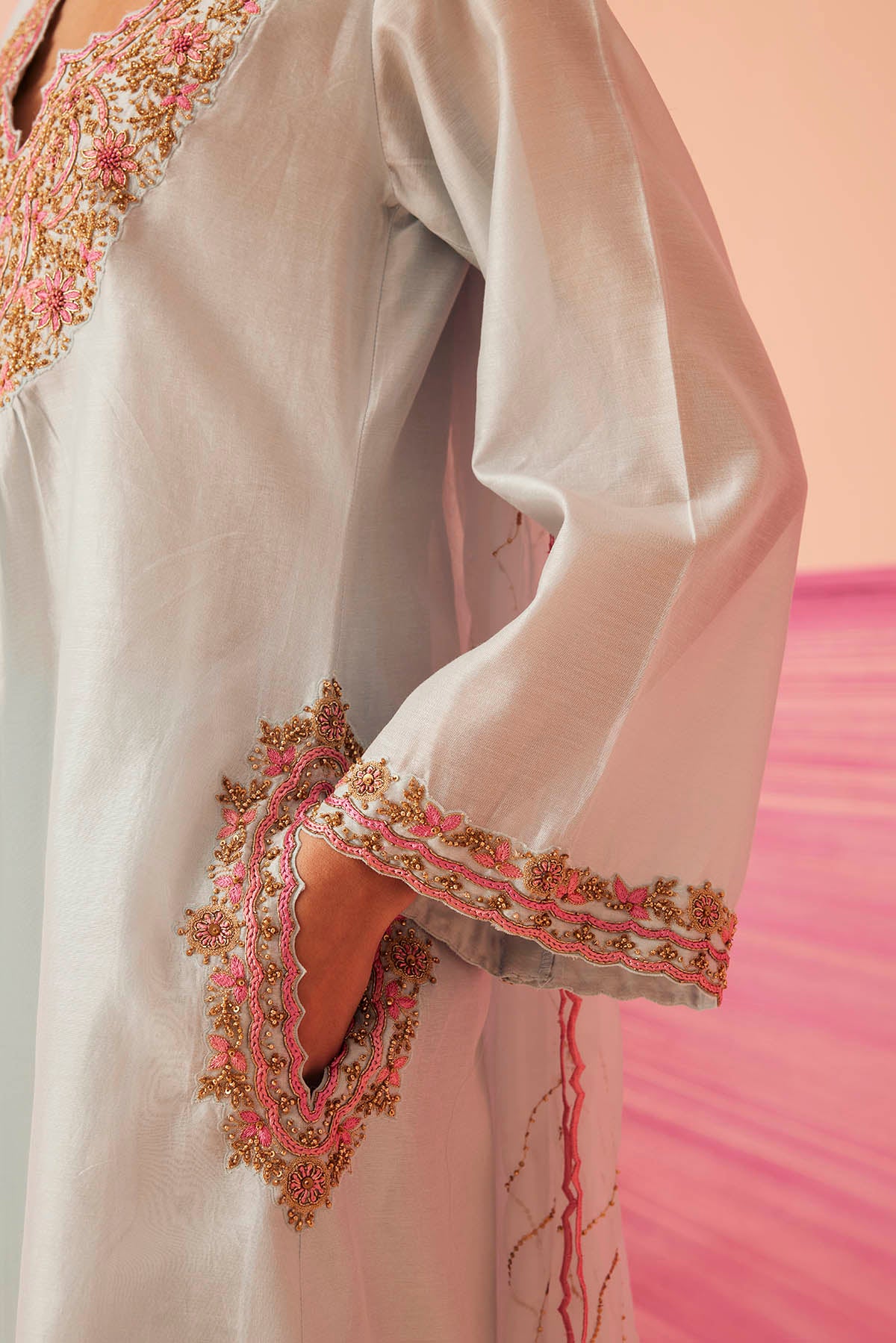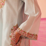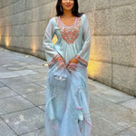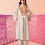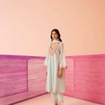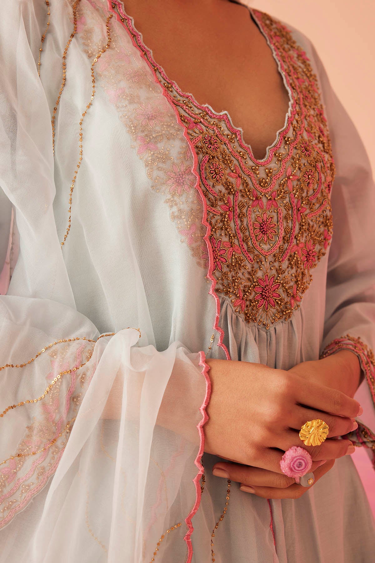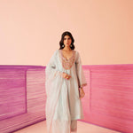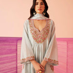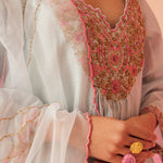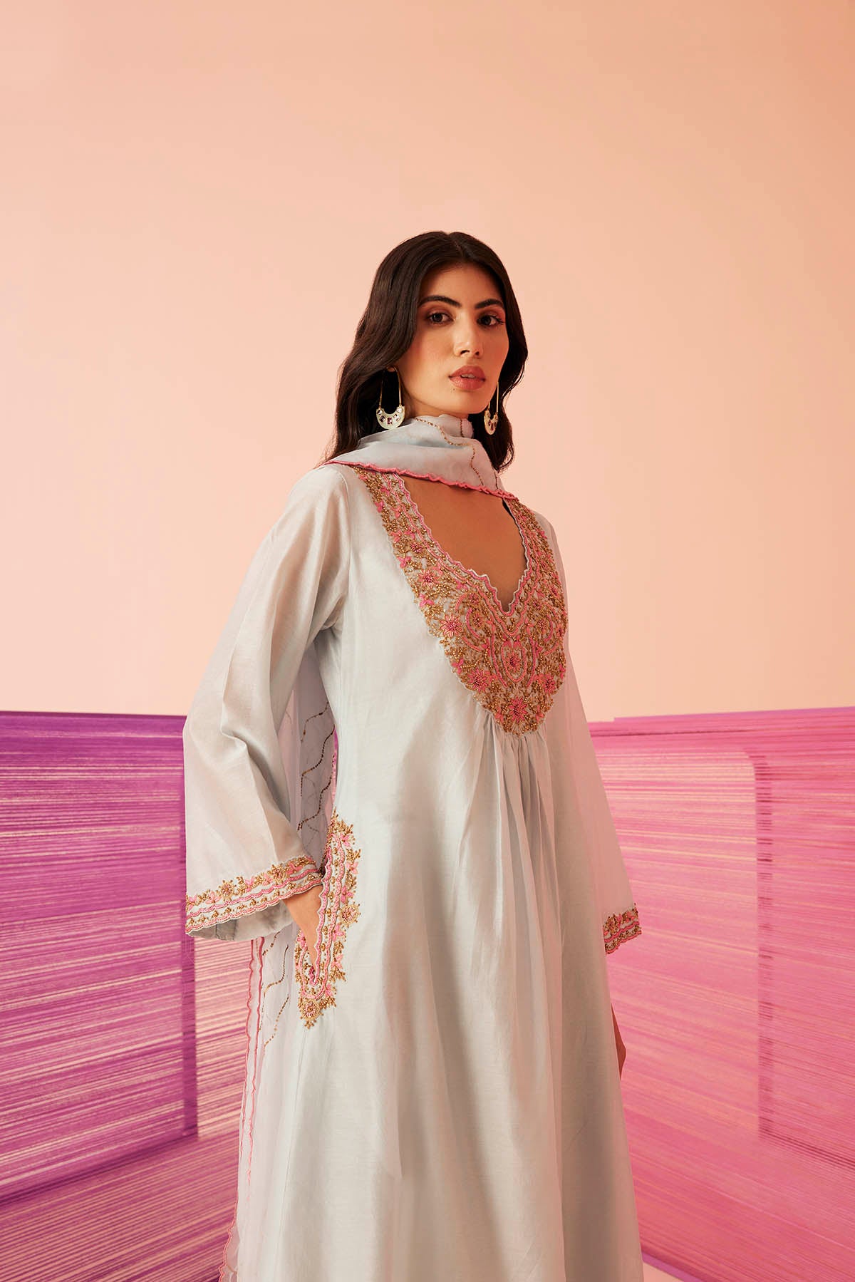 This refreshing ice blue kurta set is the perfect addition to your summer wardrobe. The beautiful floral applique embellishment in lilac, rose pink, and sea green adds a pop of colour to the classic design, while the lace detailing on the dupatta and bell sleeves elevate the overall look. With statement earrings and minimal makeup, the outfit is a sureshot head-turner.