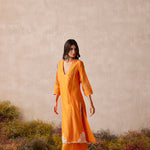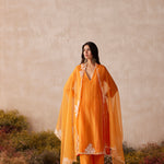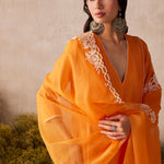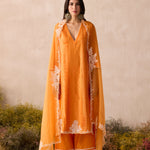 Brighten up your wardrobe with our vibrant tangerine kurta that comes adorned with delicate pleats and abstract 3D floral placements across its surface. The palazzos come detailed with intricate lacework and are perfectly complimented by the sheer ogranza dupatta that is masterfully scalloped into geometric shapes.