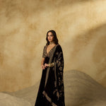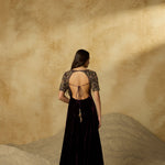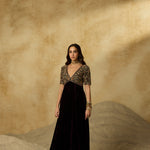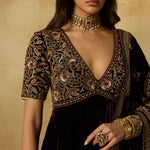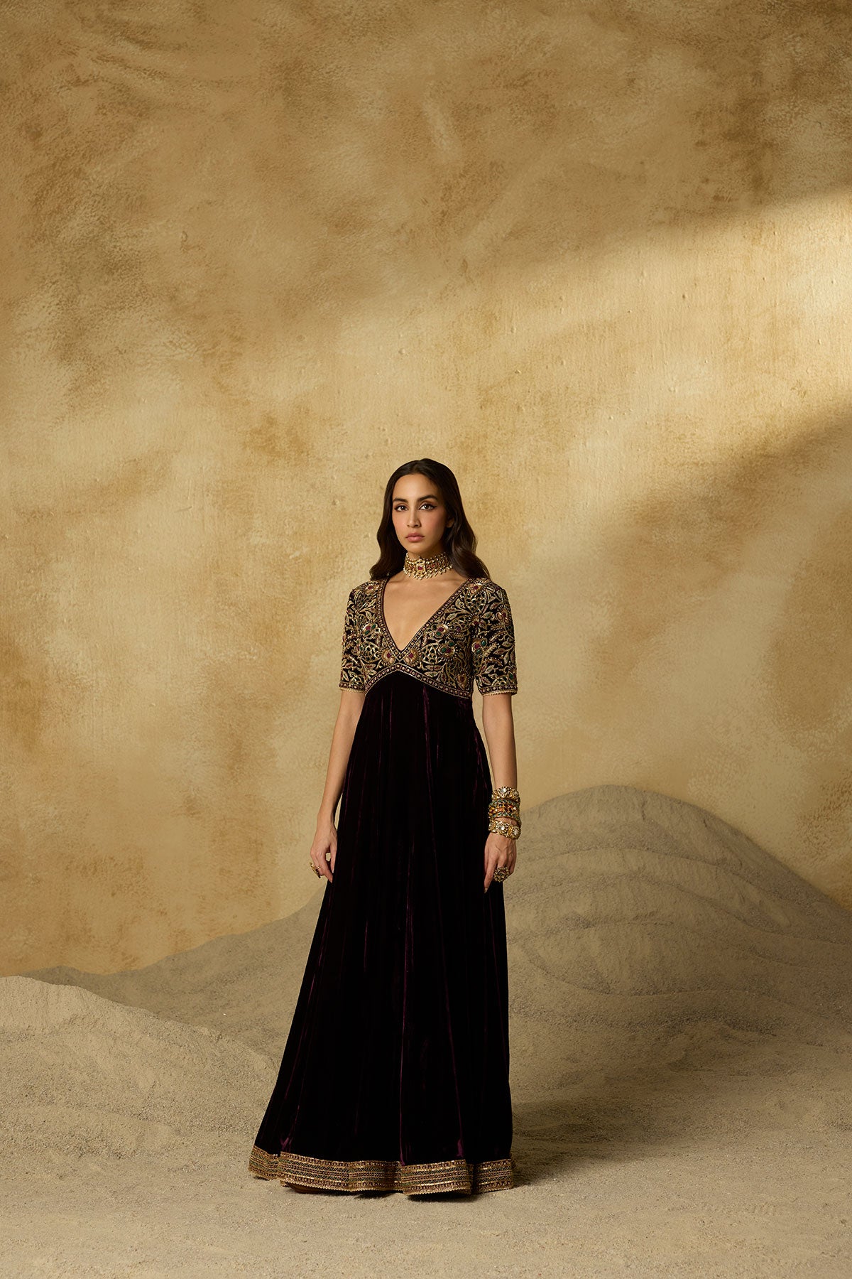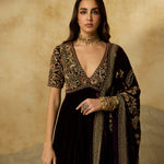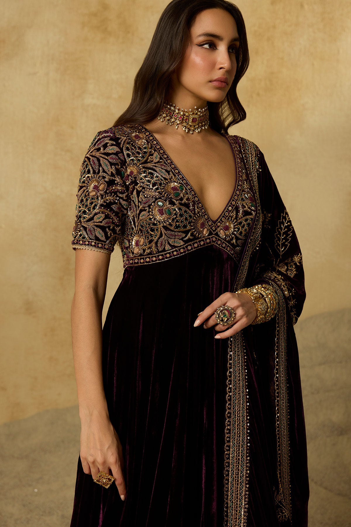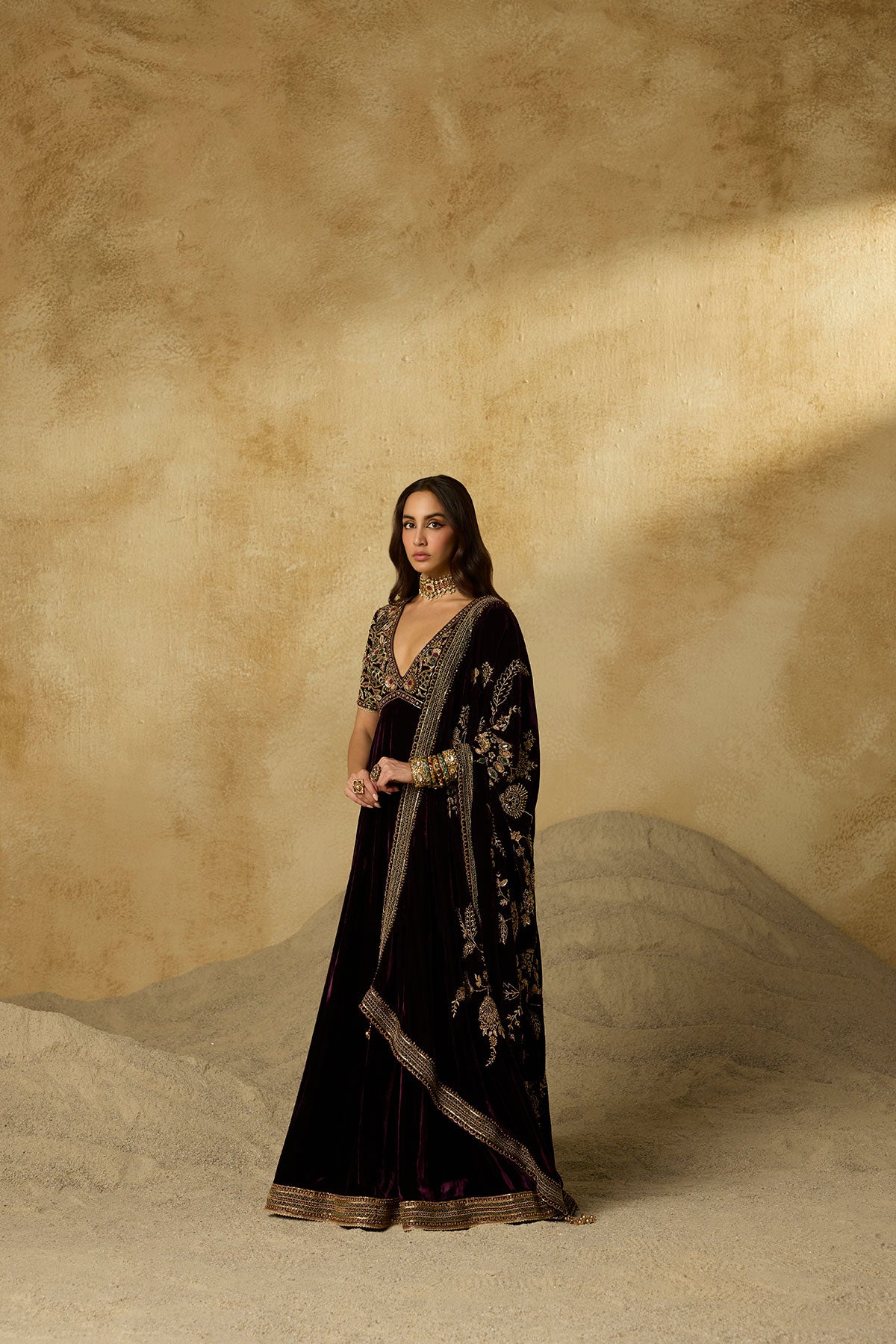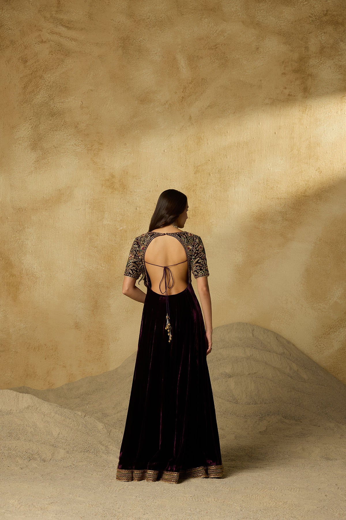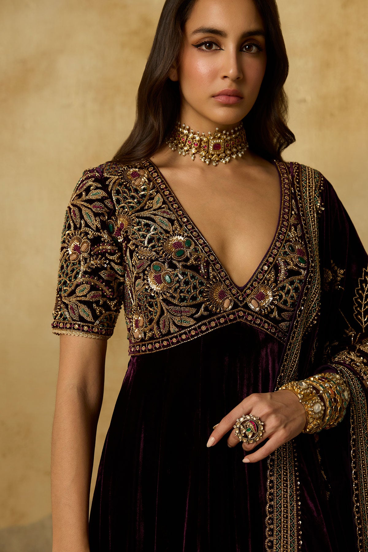 This backless Anarkali in deep jamuni velvet is adorned with intricate antique gold zardozi and contrasting beads, flowing effortlessly in a silhouette made to captivate. Paired with a matching dupatta, it is a trousseau essential that commands attention.