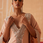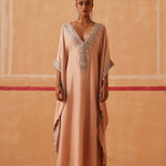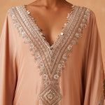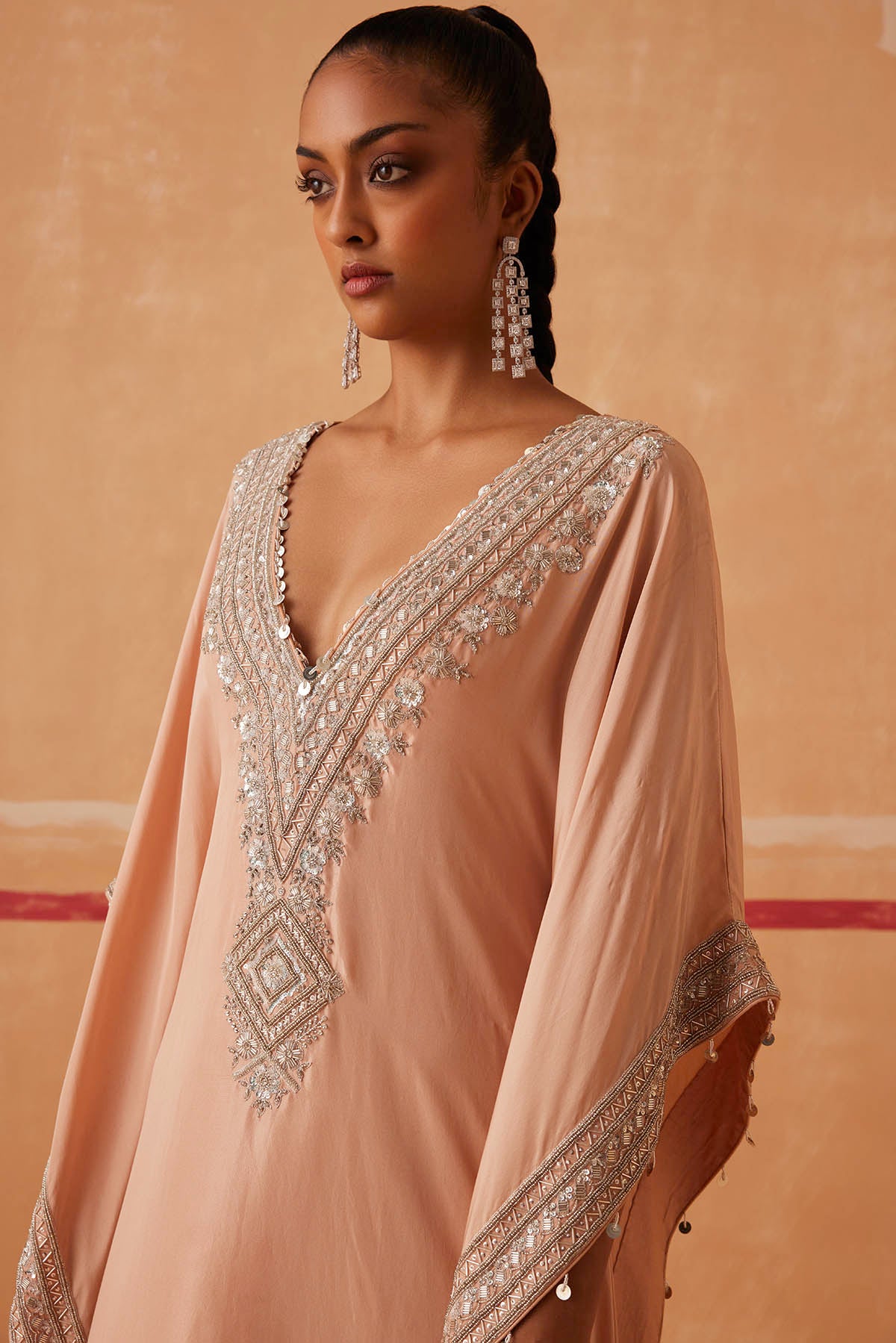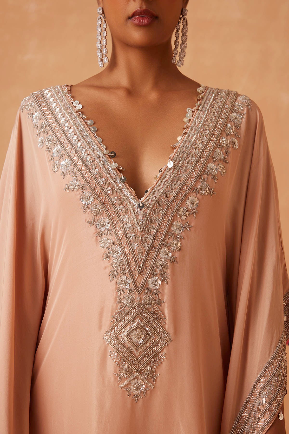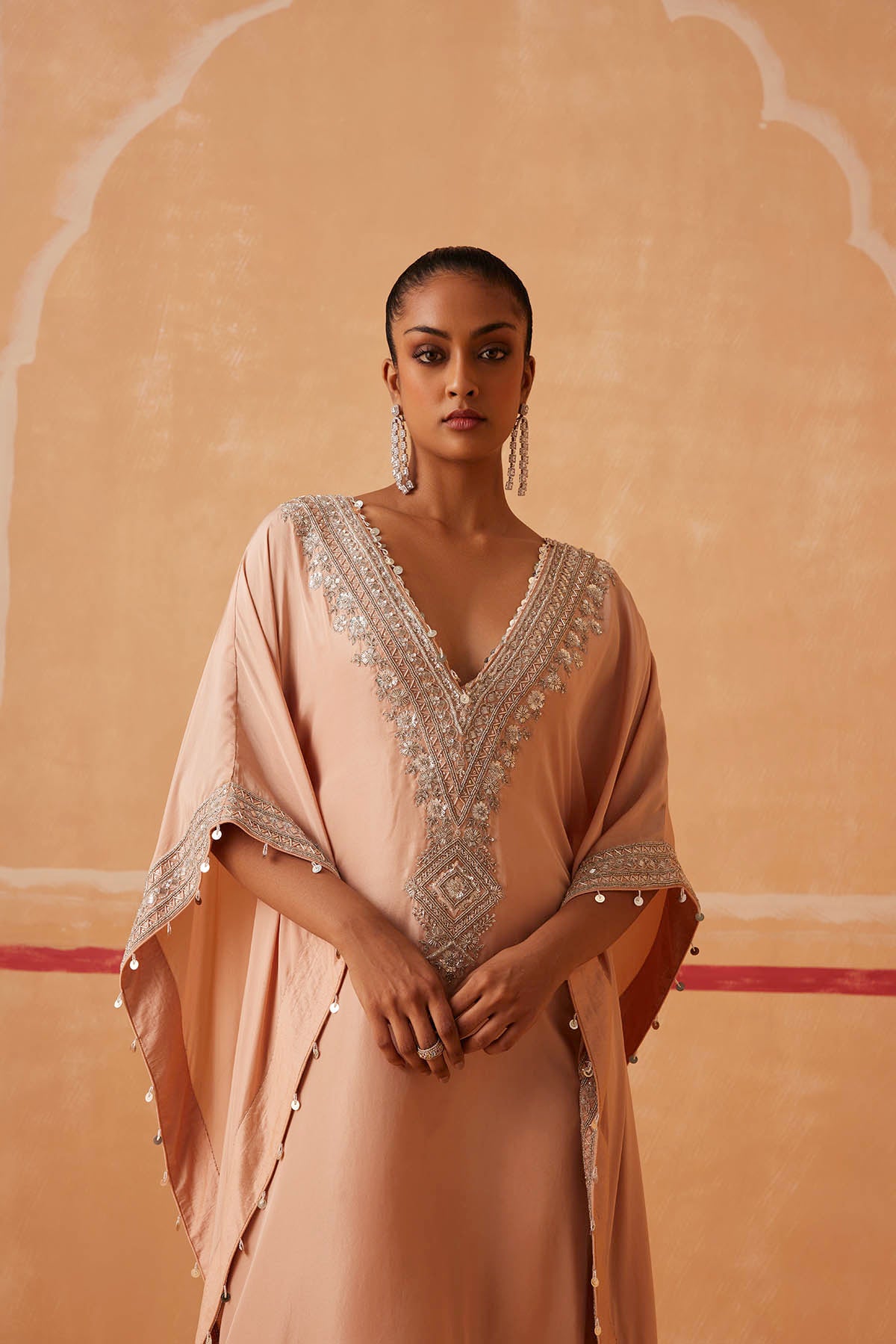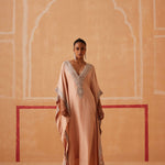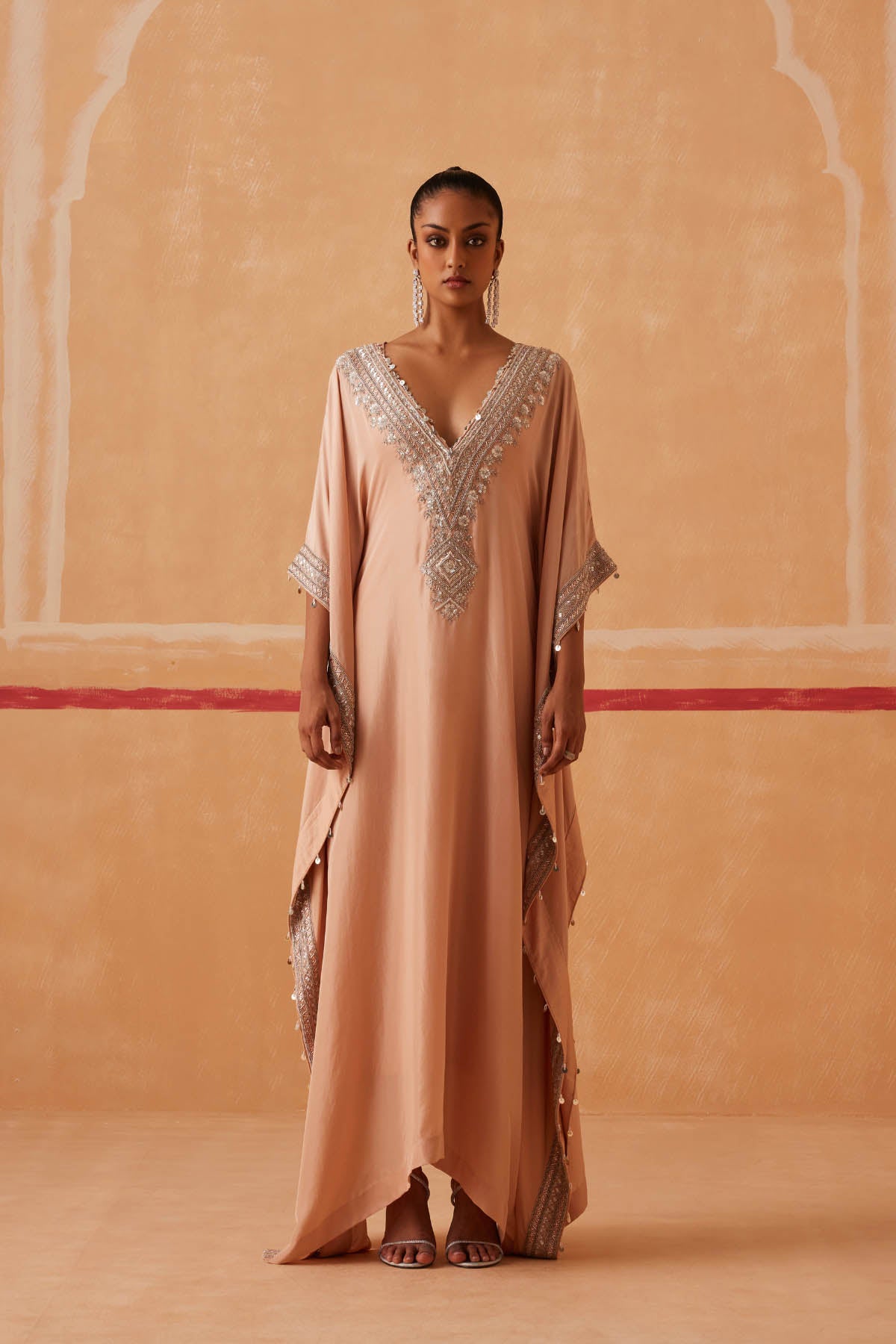 A celebration of simplicity, our Tara Kaftan creates a mesmerizing silhouette that will turn heads wherever you go. Silver piping, cutdana, and delicate beads form an exquisite neckline, while tassels add a touch of drama to the look.