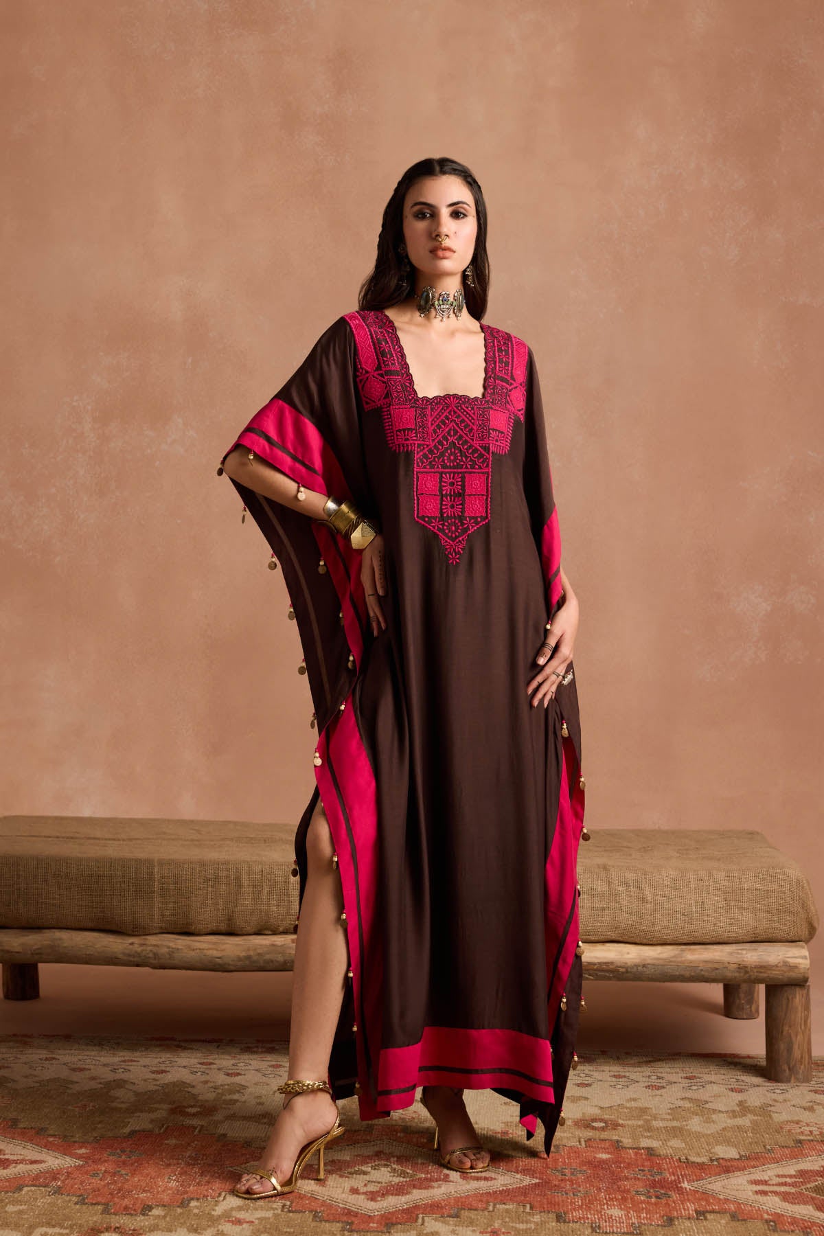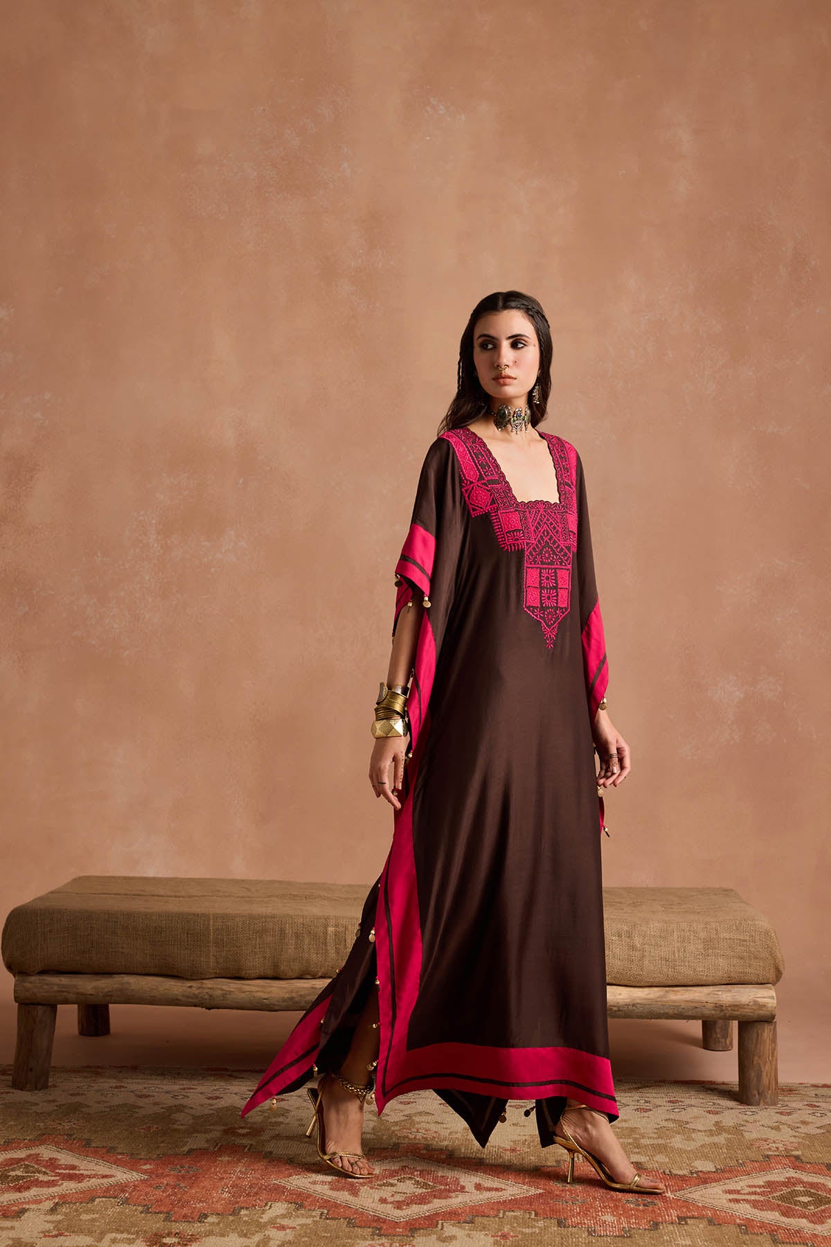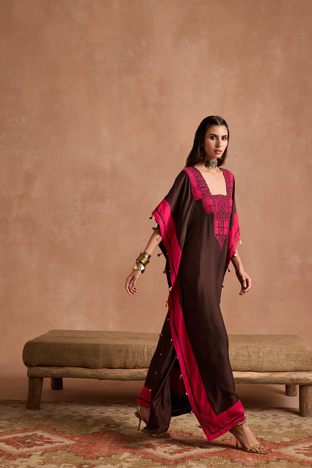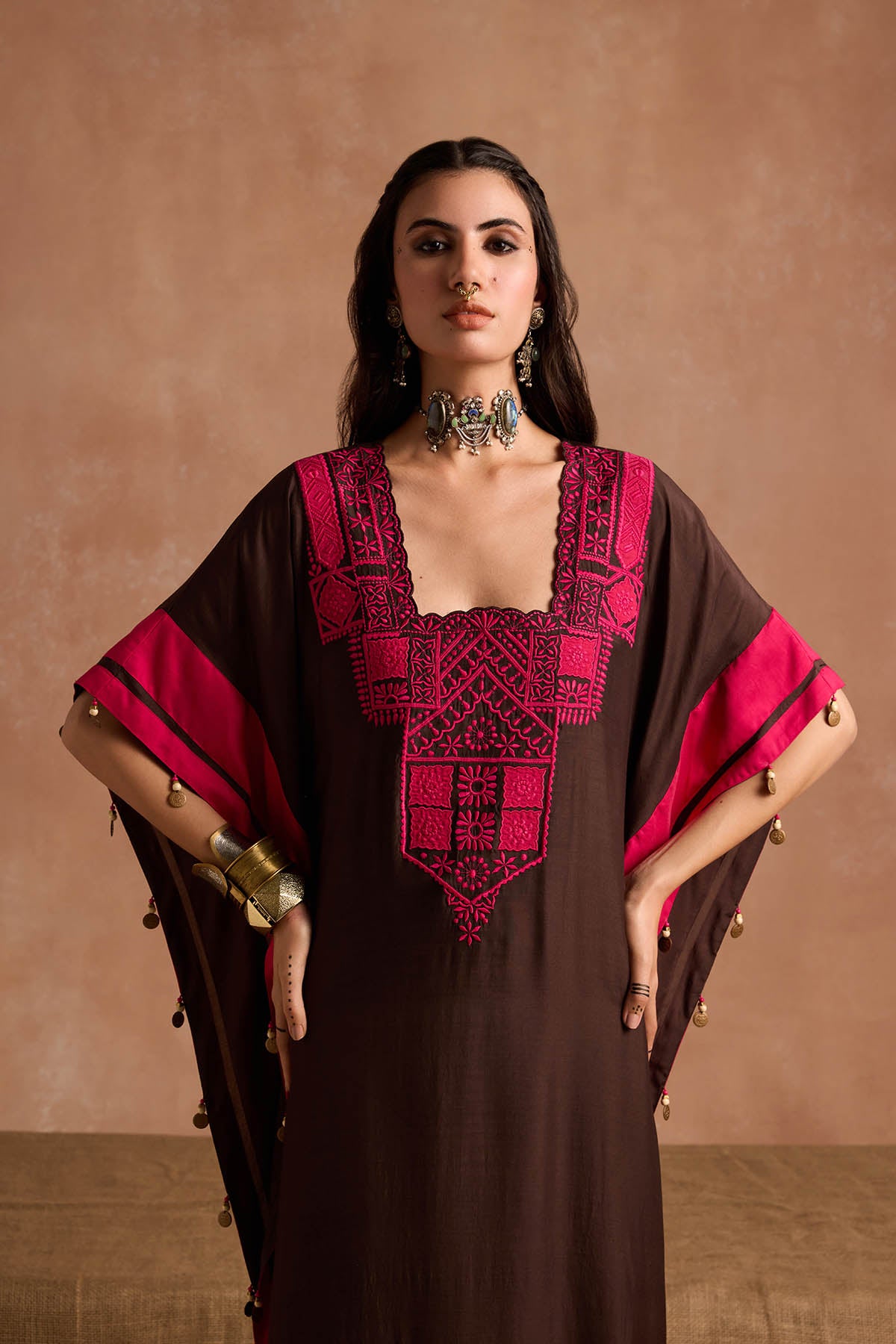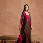 This is what earthy dreams are made of! Brown muslin with a contrast pink applique patchwork border is complemented by a plunging mughal neckline. The sides of this floor skimming kaftan are accentuated with signature coin hangings that lend this silhouette modernity.