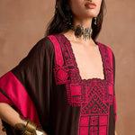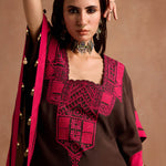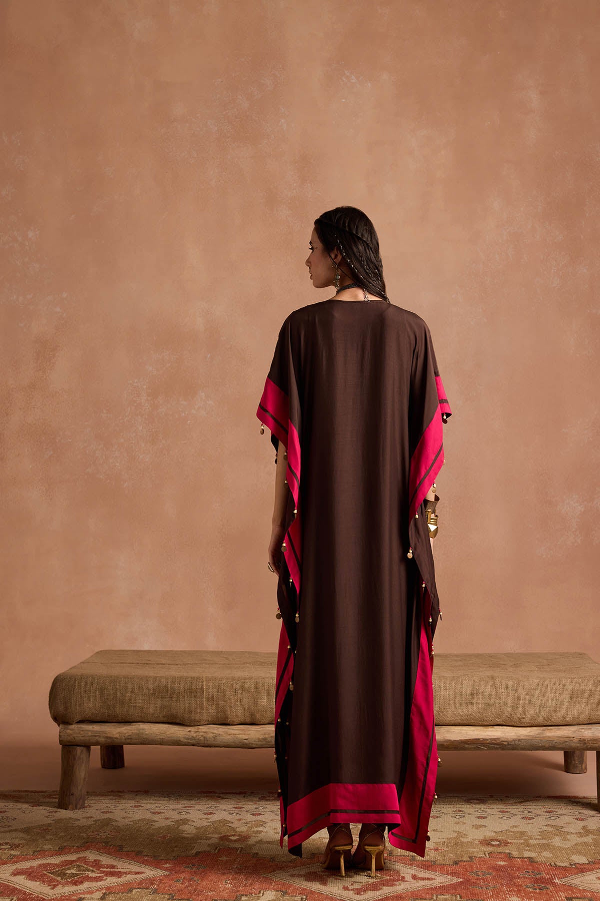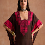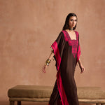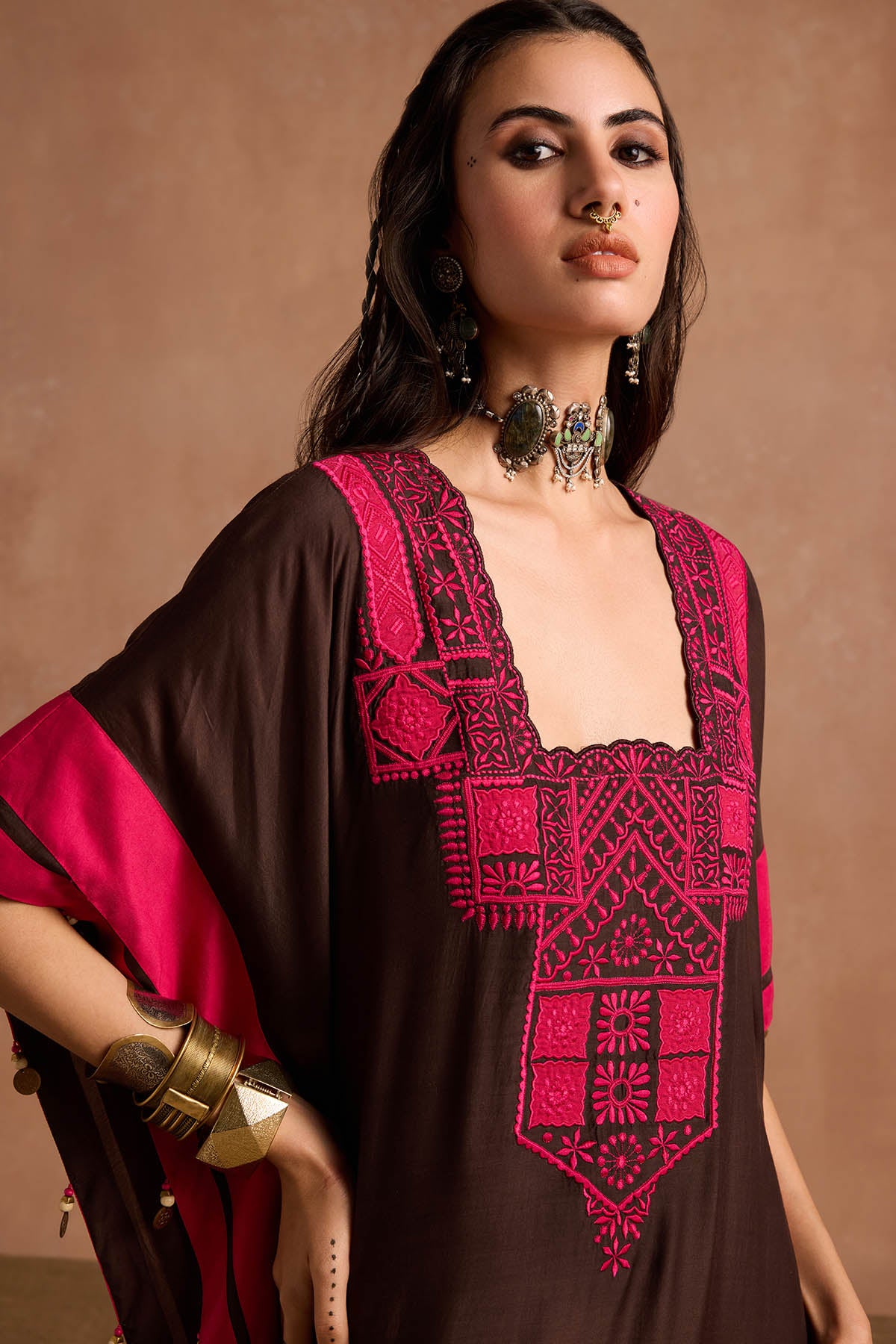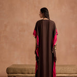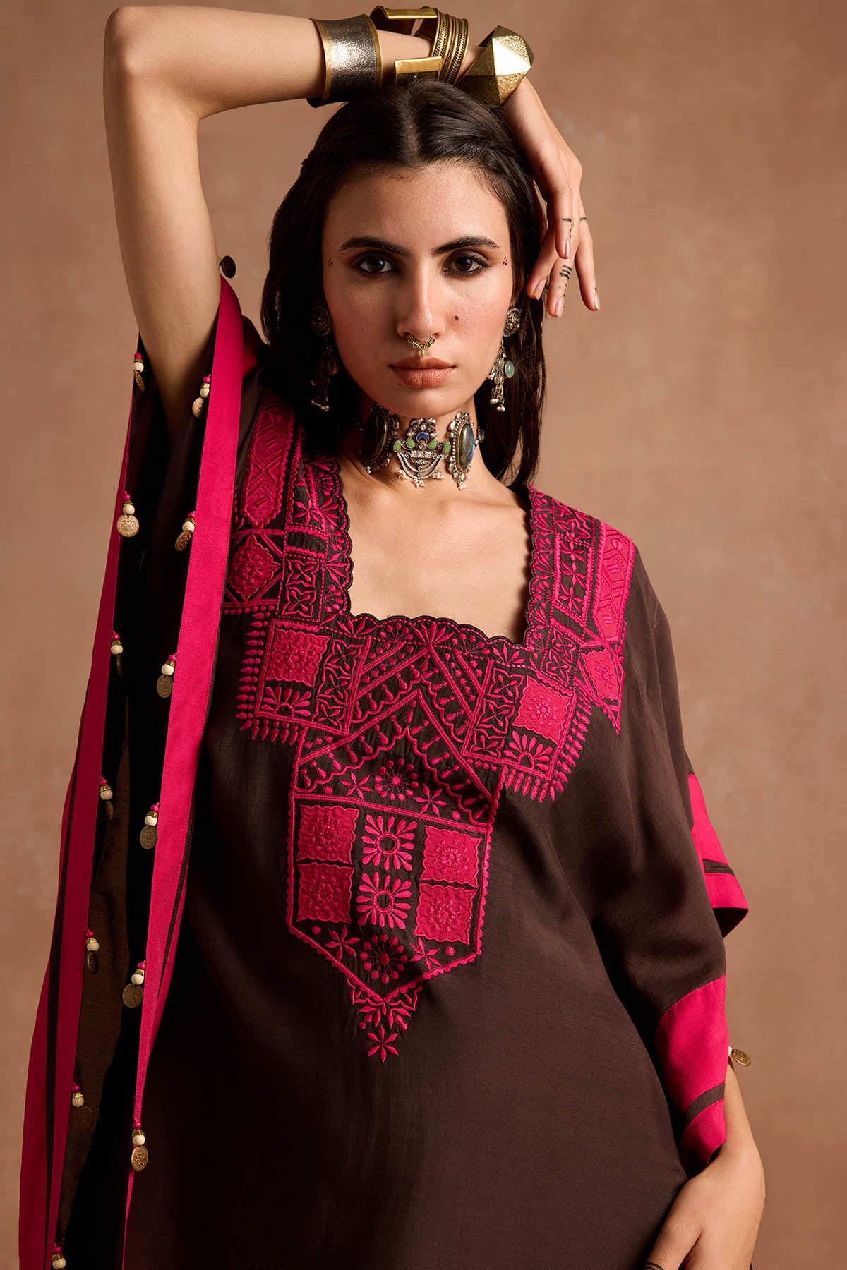 This is what earthy dreams are made of! Brown muslin with a contrast pink applique patchwork border is complemented by a plunging mughal neckline. The sides of this floor skimming kaftan are accentuated with signature coin hangings that lend this silhouette modernity.