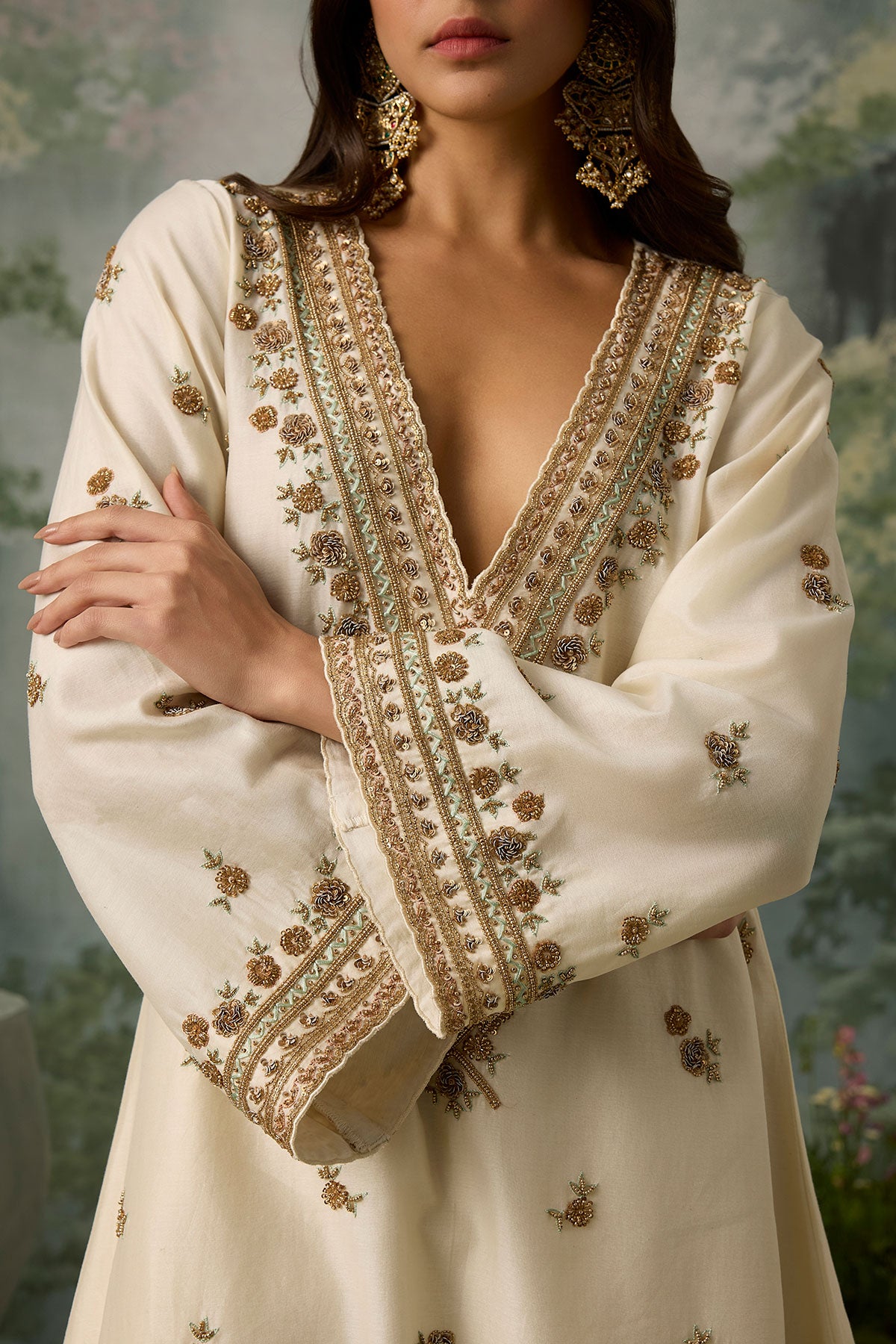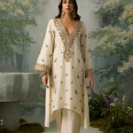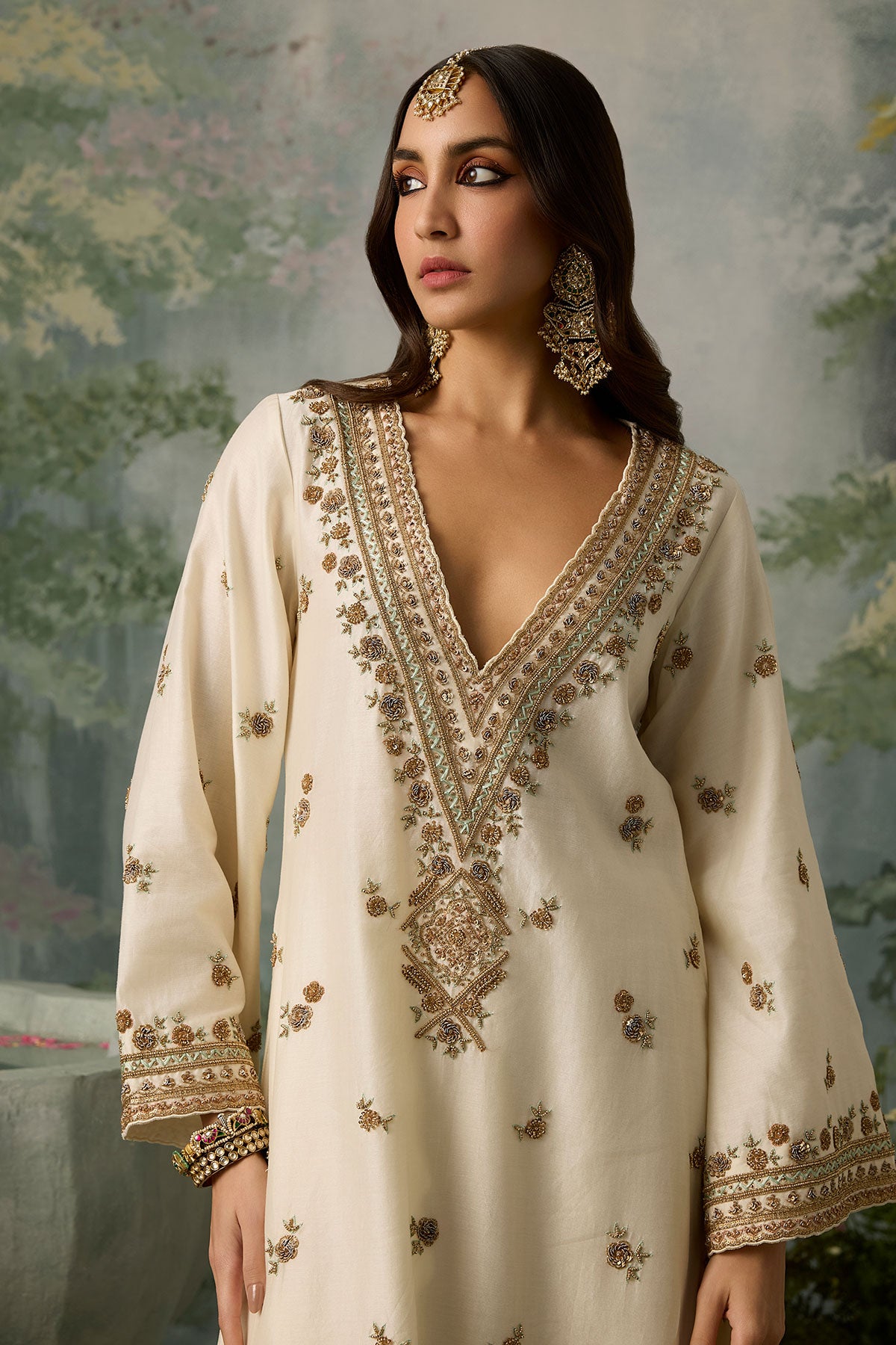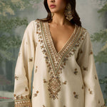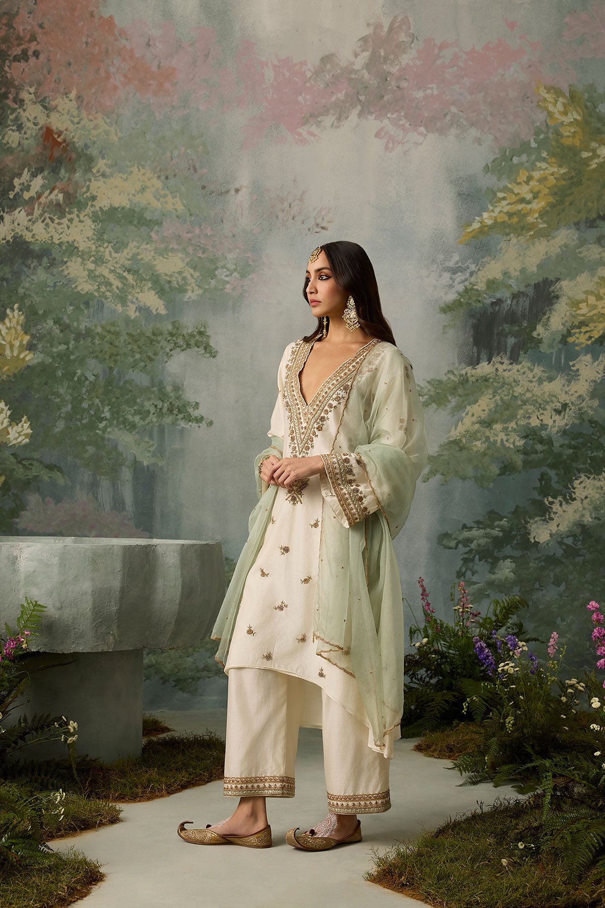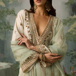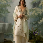 The perfect blend of decadence and simplicity — this kurta and palazzo set features intricate hand-embroidered aari threadwork, brought to life with touches of zari, bead, and sitara detailing. A plunging Mughal neckline adds quiet drama, balanced by an organza dupatta embroidered with fine precision. An ensemble that promises timeless elegance.