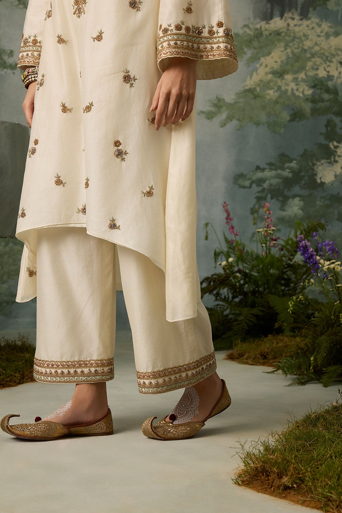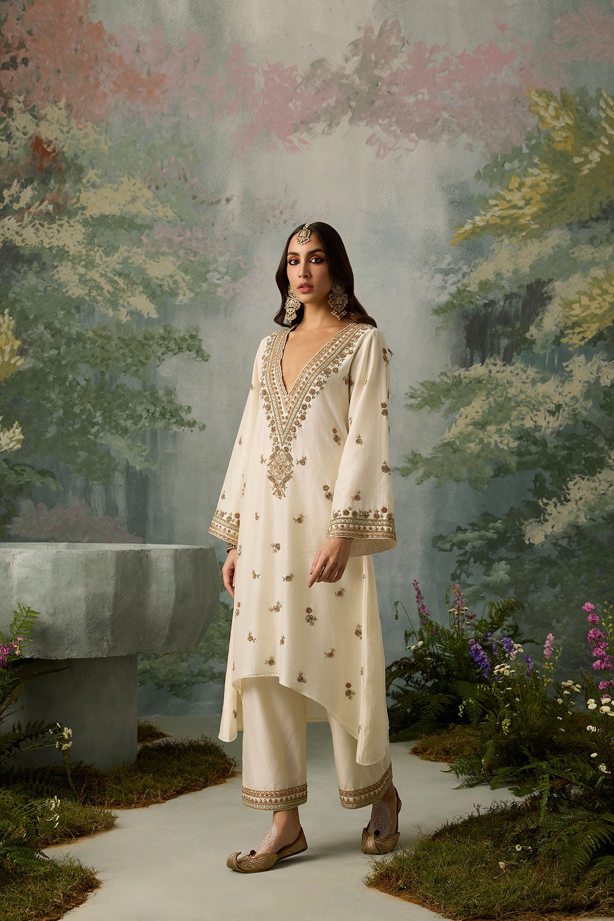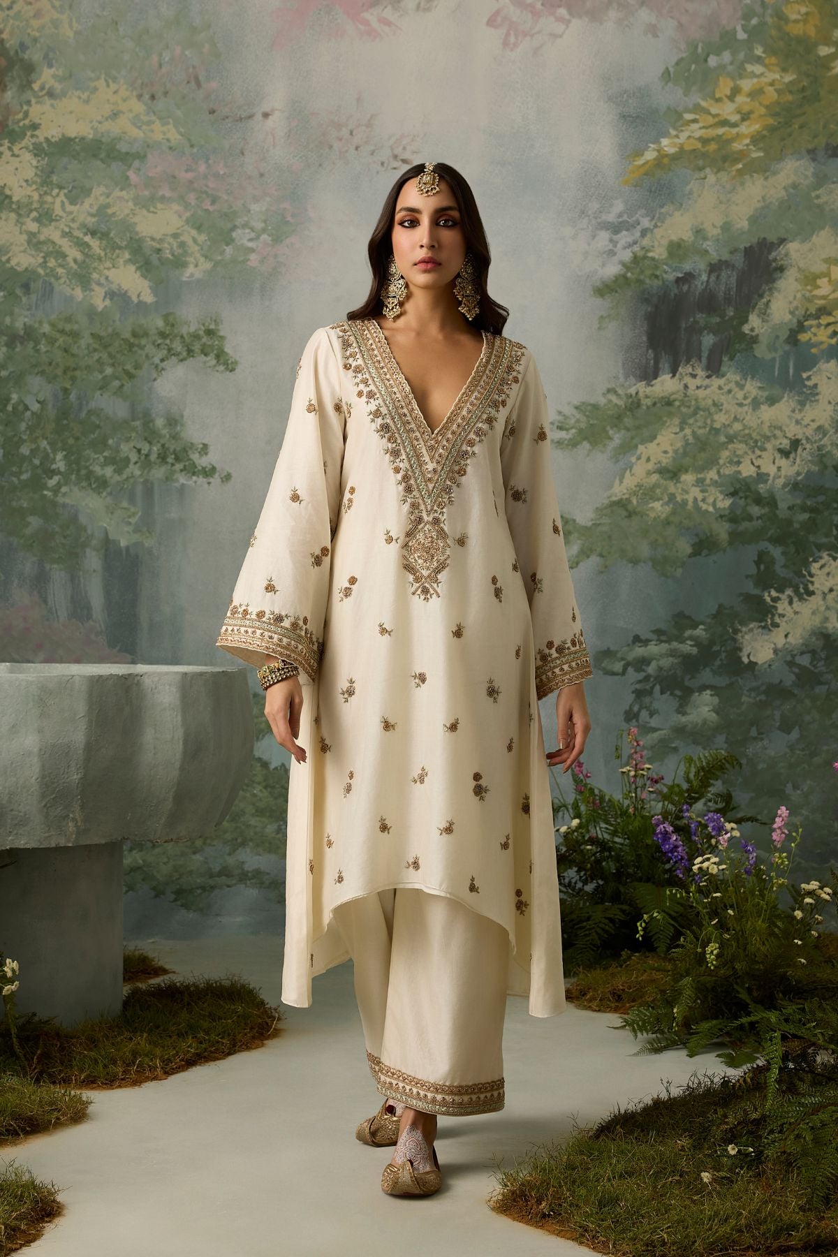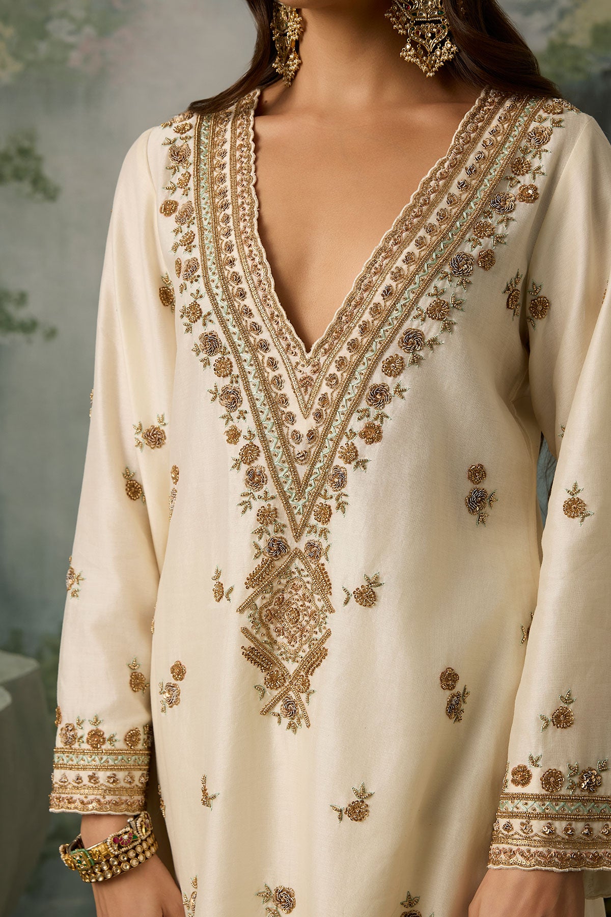 The perfect blend of decadence and simplicity — this kurta and palazzo set features intricate hand-embroidered aari threadwork, brought to life with touches of zari, bead, and sitara detailing. A plunging Mughal neckline adds quiet drama, balanced by an organza dupatta embroidered with fine precision. An ensemble that promises timeless elegance.