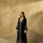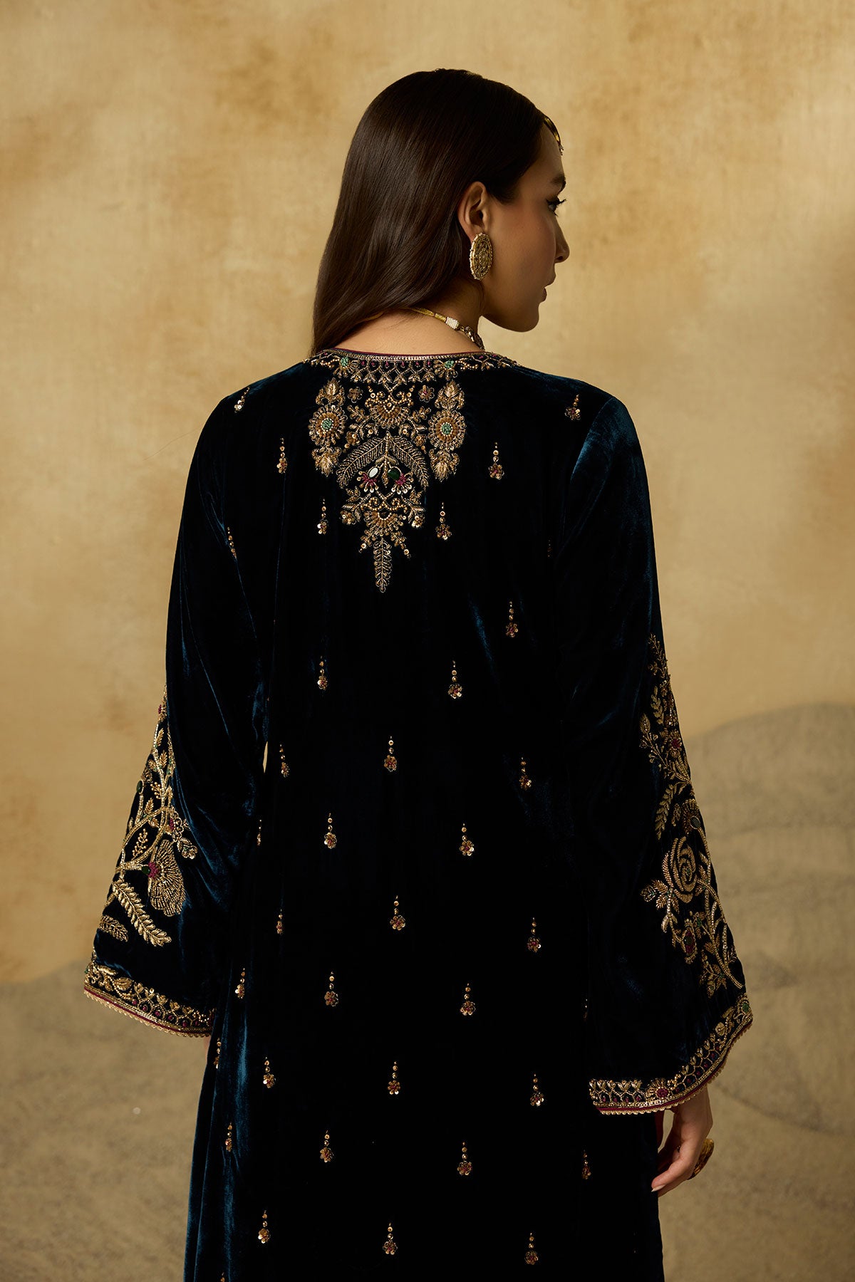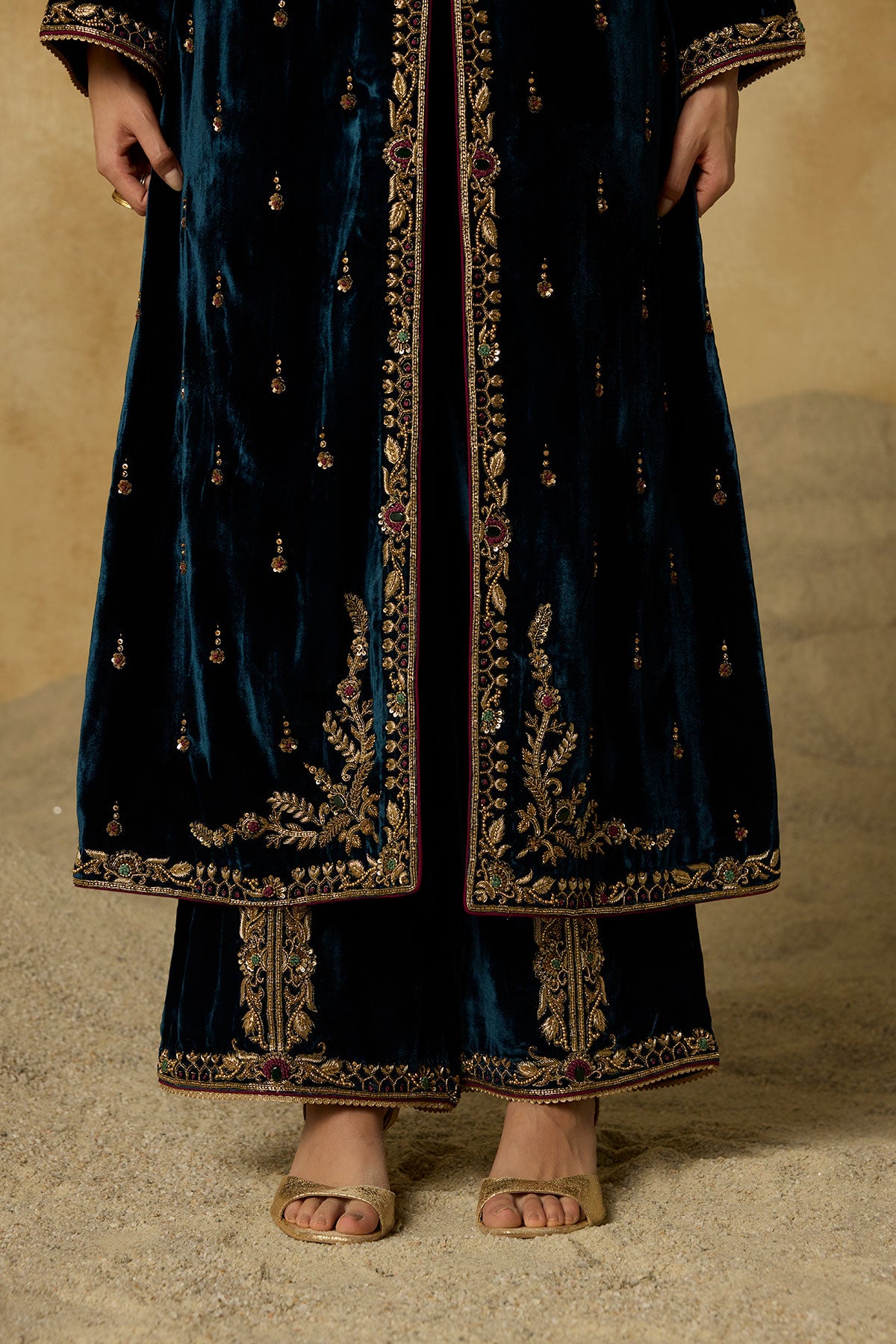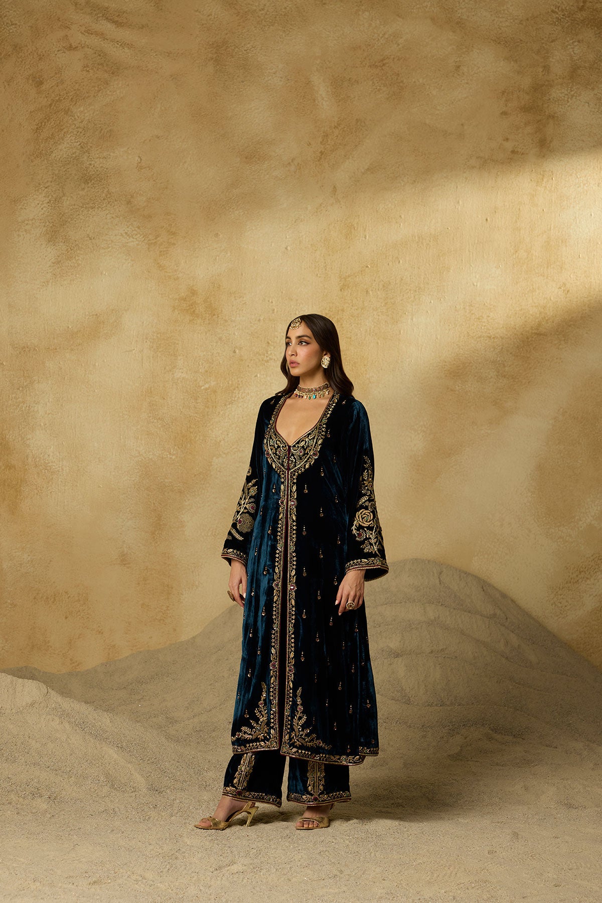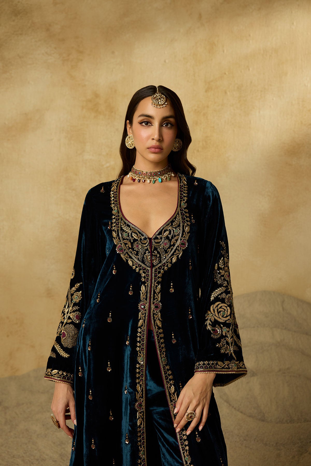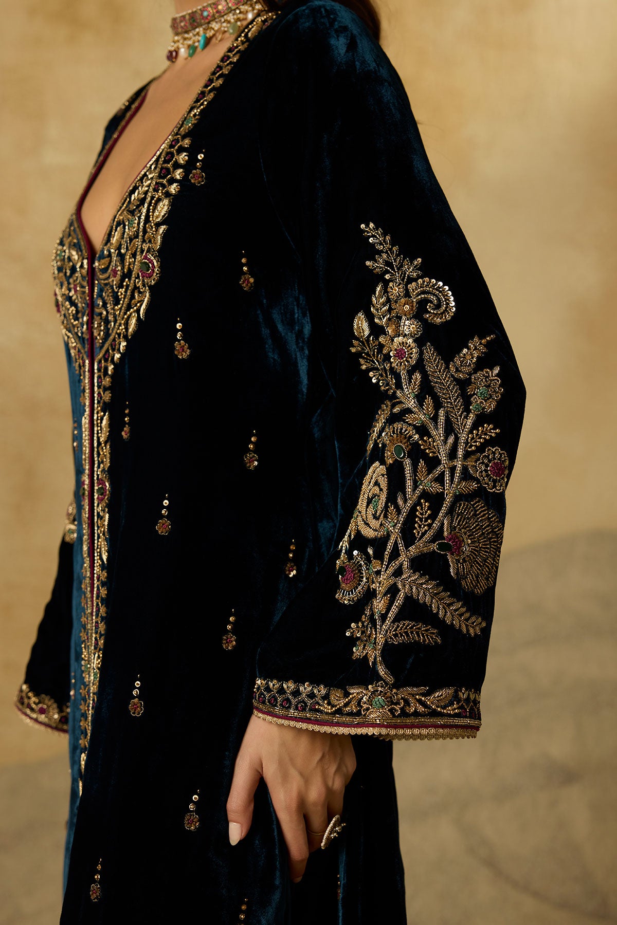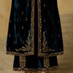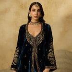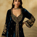 This jacket-style Anarkali is defined by its exquisite scoop neckline—hand-embroidered with antique gold zardozi, aari, gemstones, and sequins that glimmer against peacock blue silk velvet. Styled without a dupatta, it’s a versatile piece that can be effortlessly dressed up or pared down.