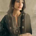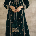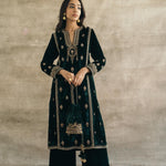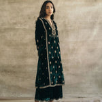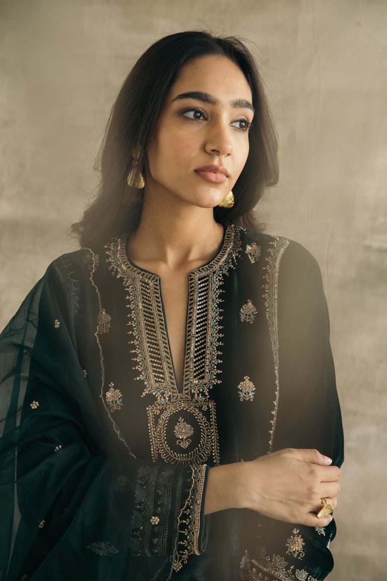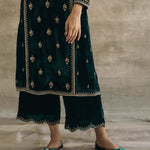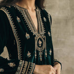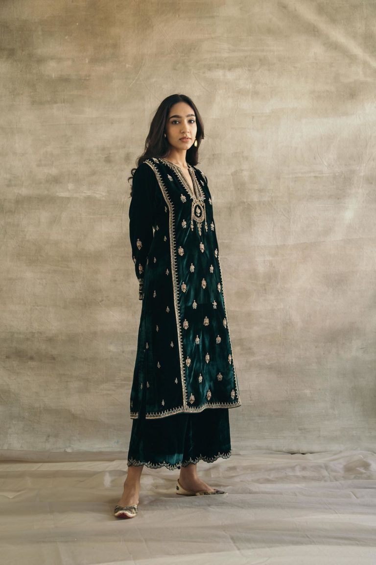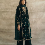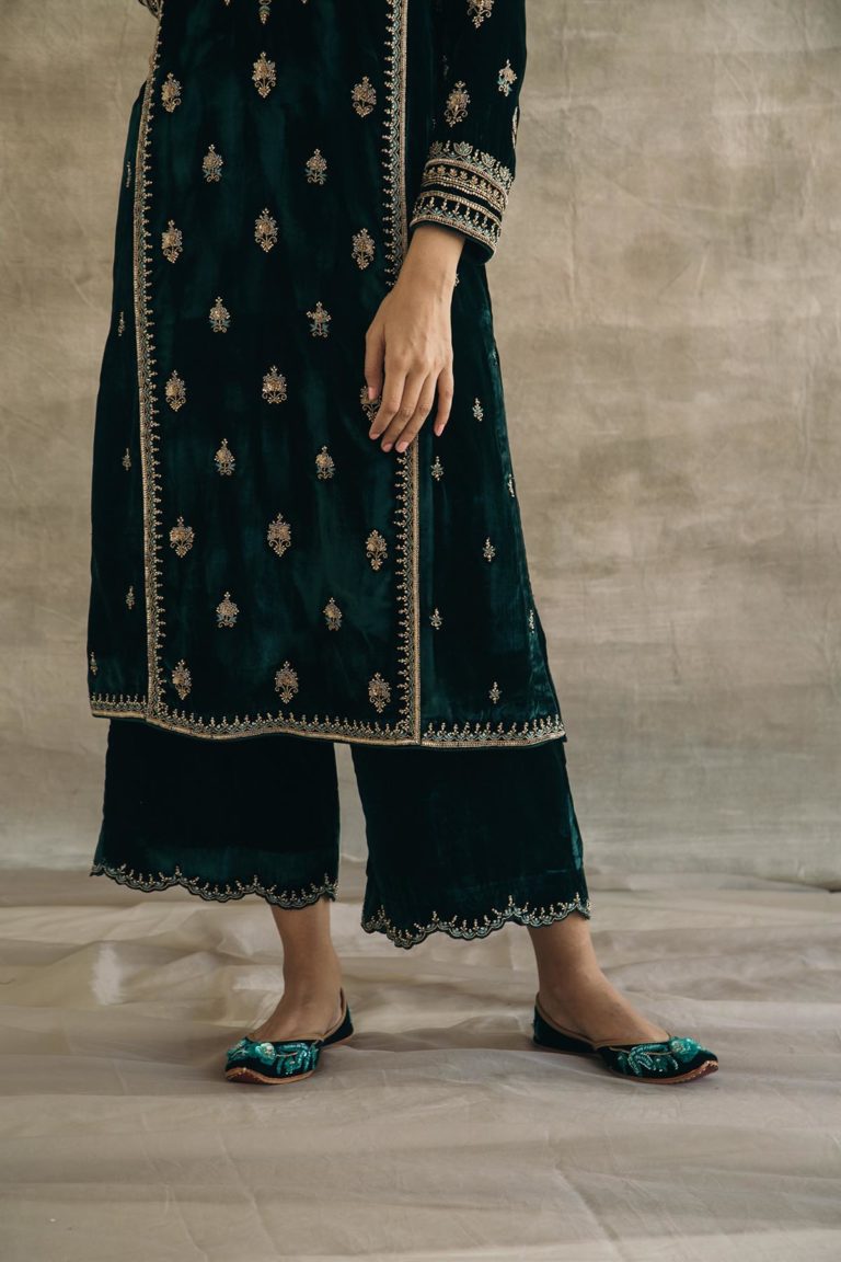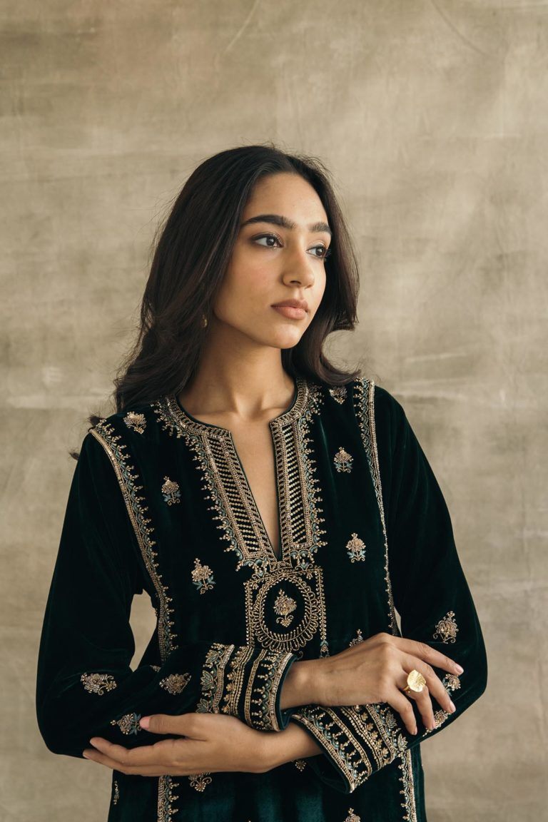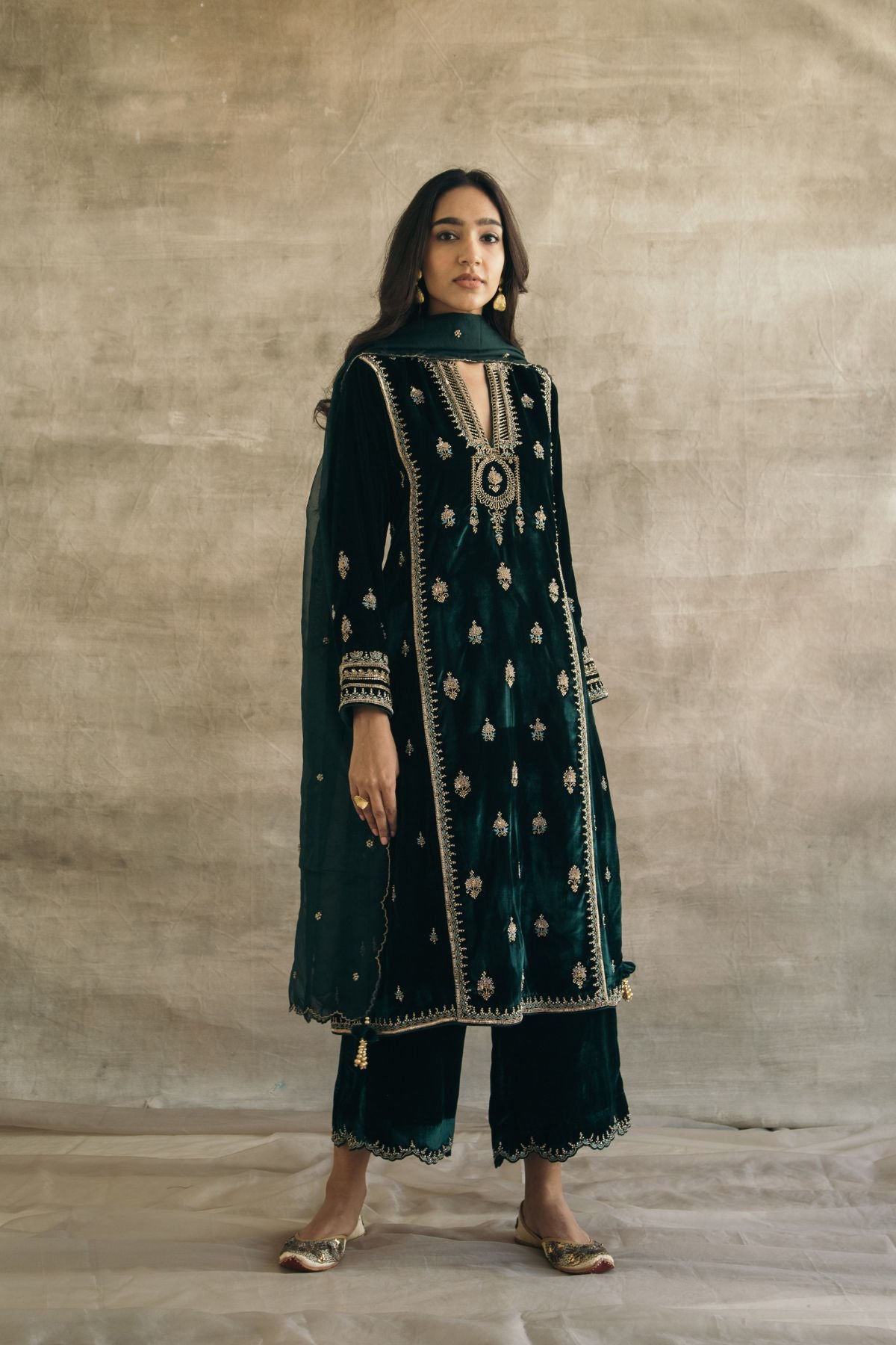 Bottle Green perfection — don head-to-toe velvet with this kalidaar silk velvet kurta with scalloped palazzos and an embroidered organza dupatta. The zardozi hand-embroidered motifs spread across the kurta are the hero of this piece, and find their inspiration in the royal robes of Mughal queens.
