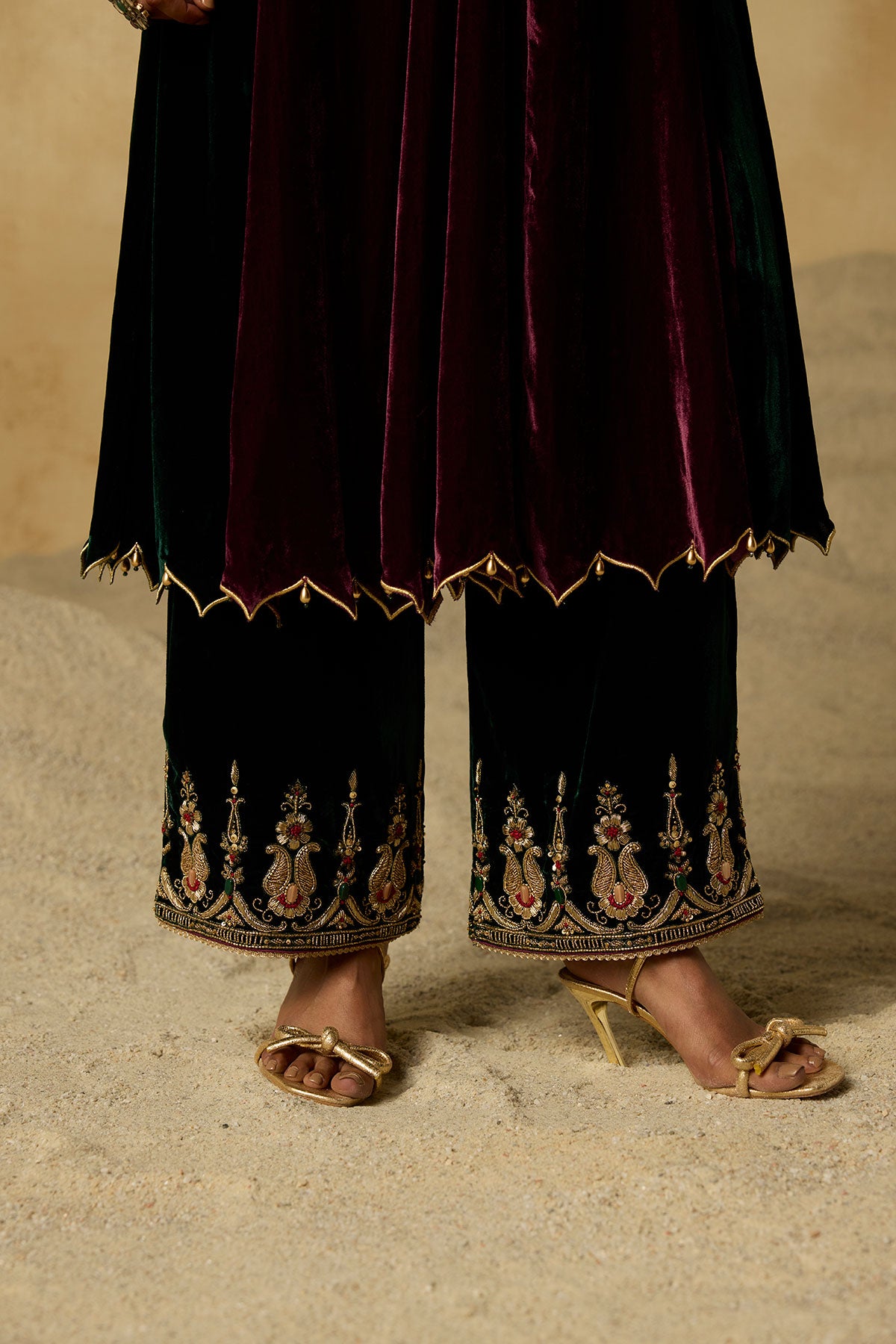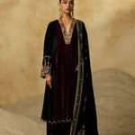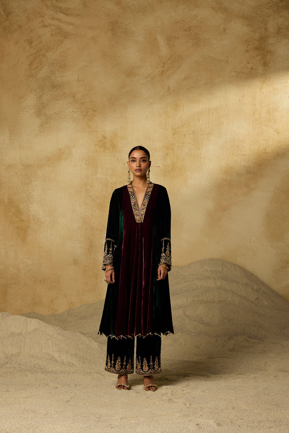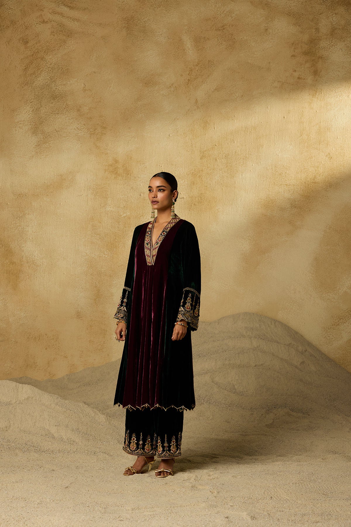 Velvet stripes in wine and bottle green define this kurta set, detailed with intricate antique gold embroidery for a striking, festive statement.