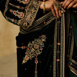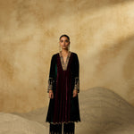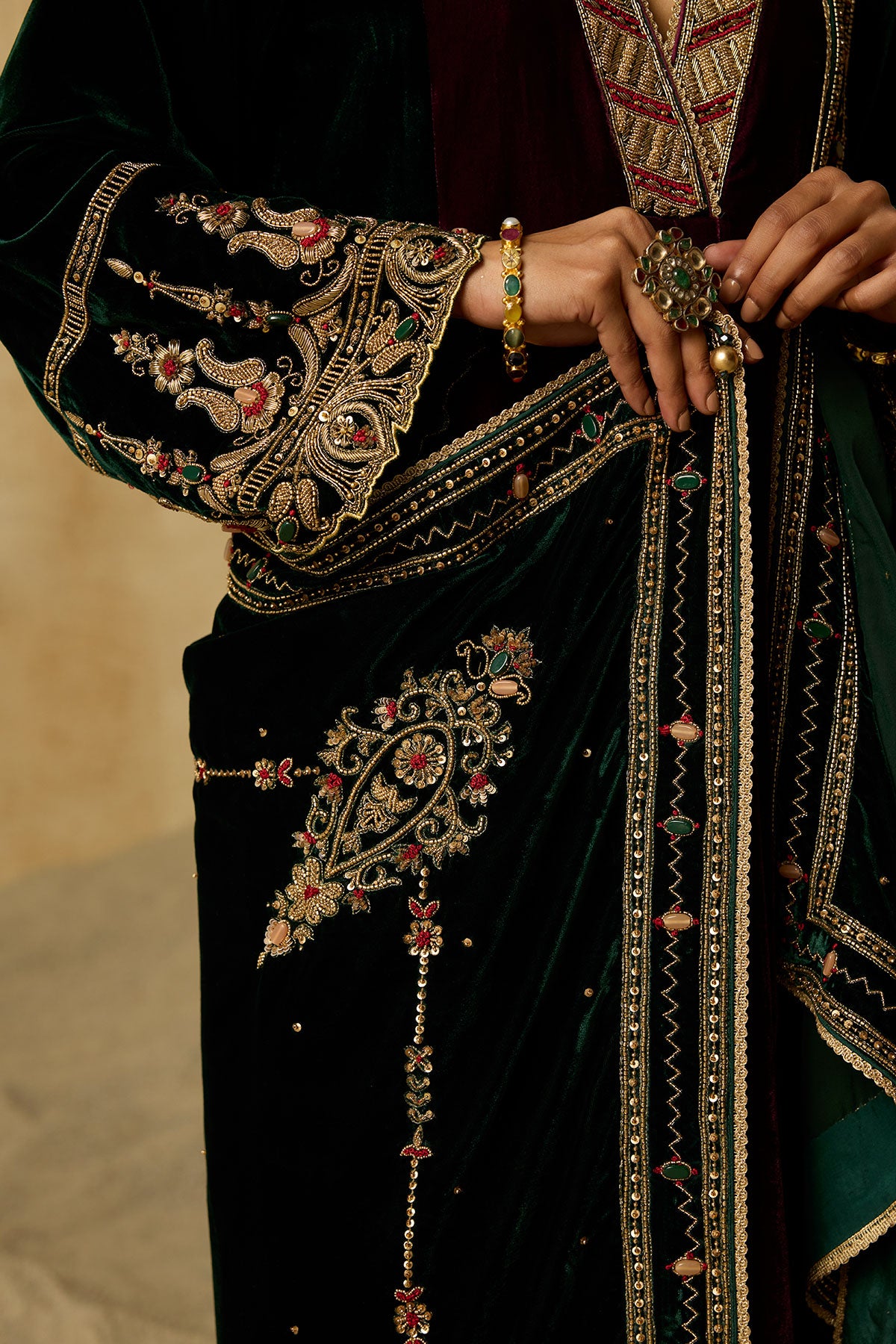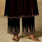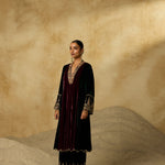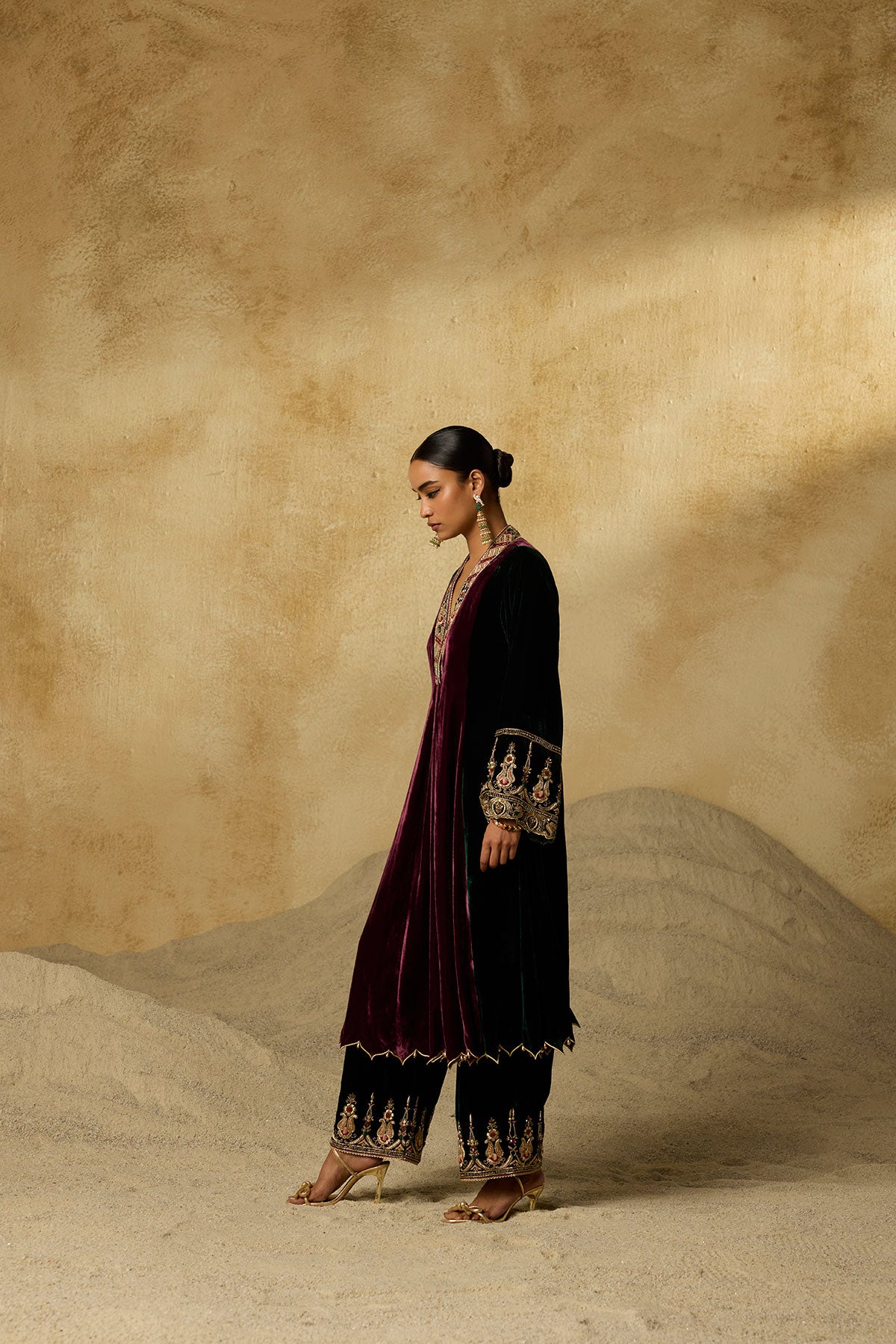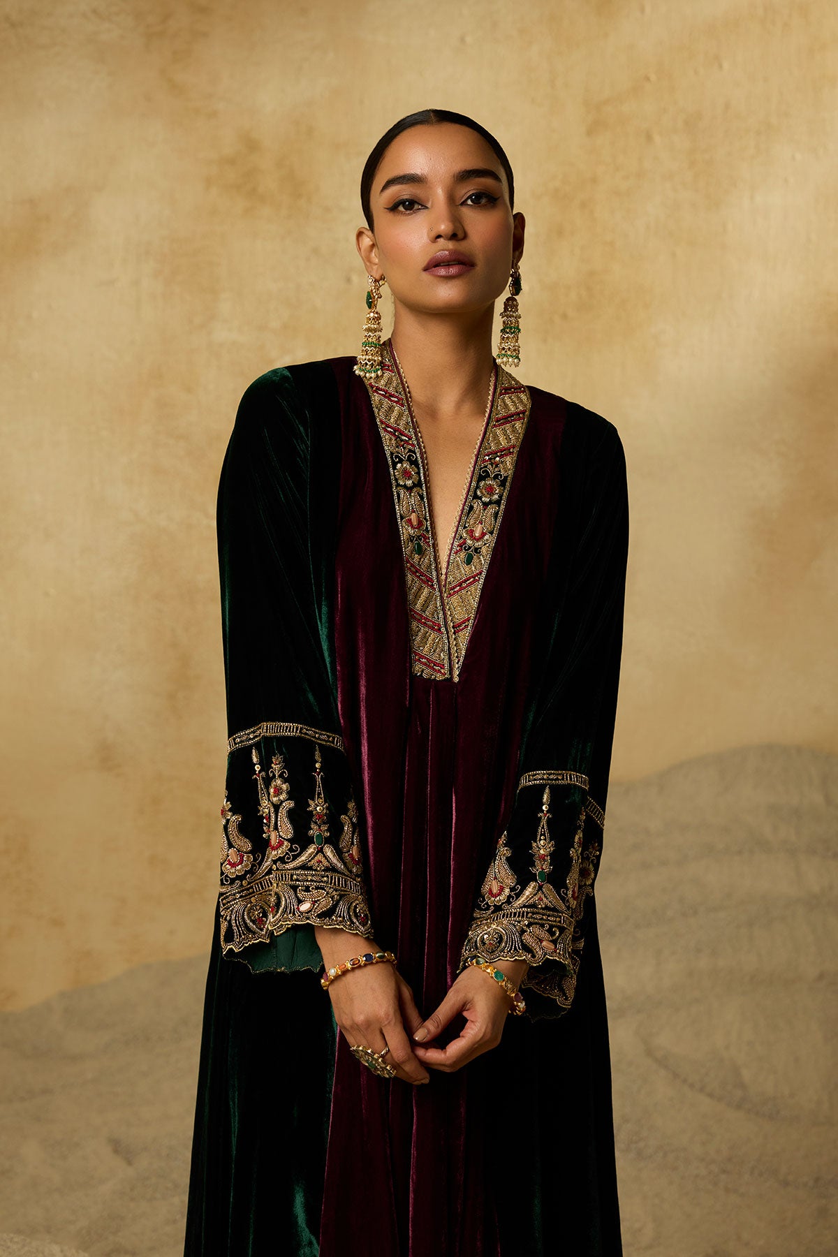 Velvet stripes in wine and bottle green define this kurta set, detailed with intricate antique gold embroidery for a striking, festive statement.