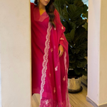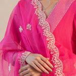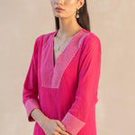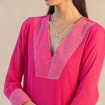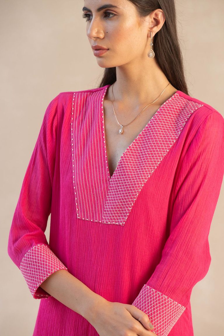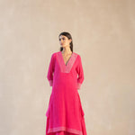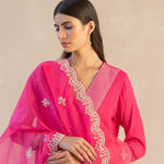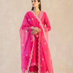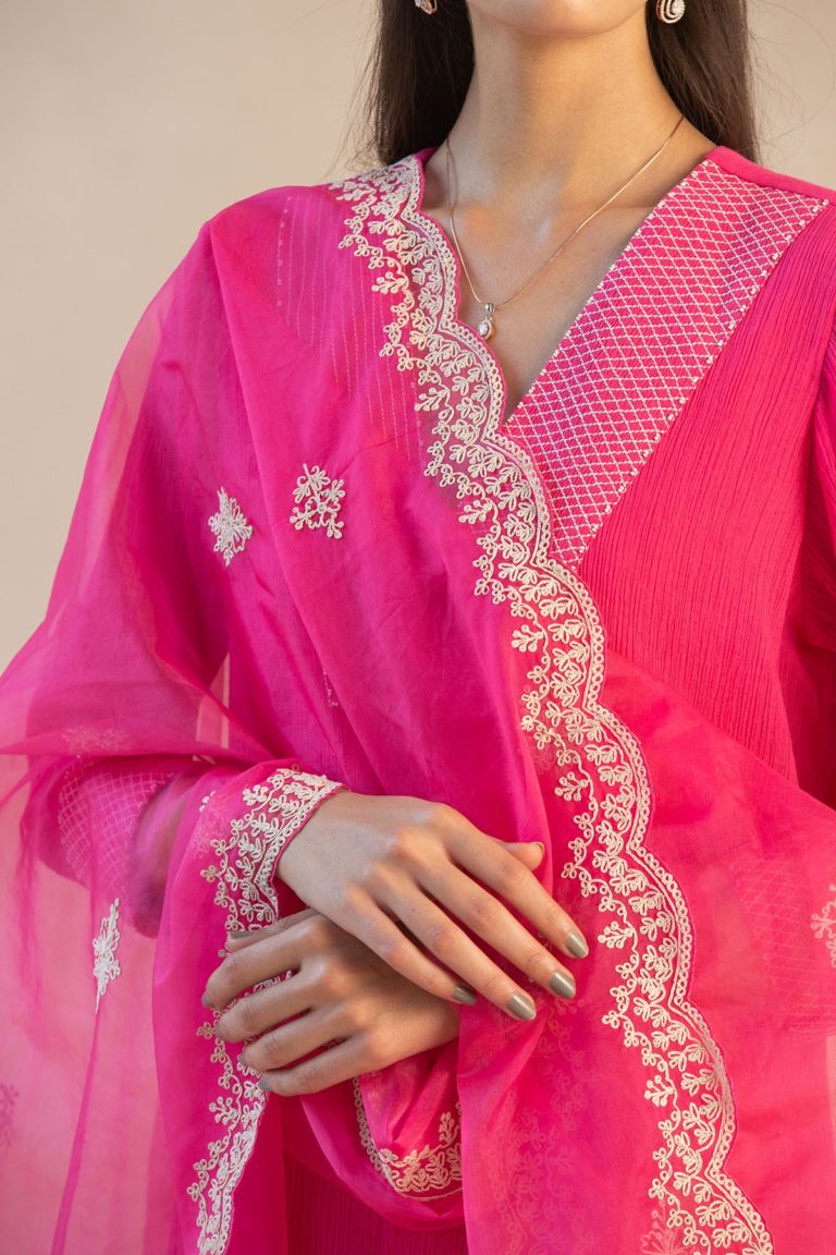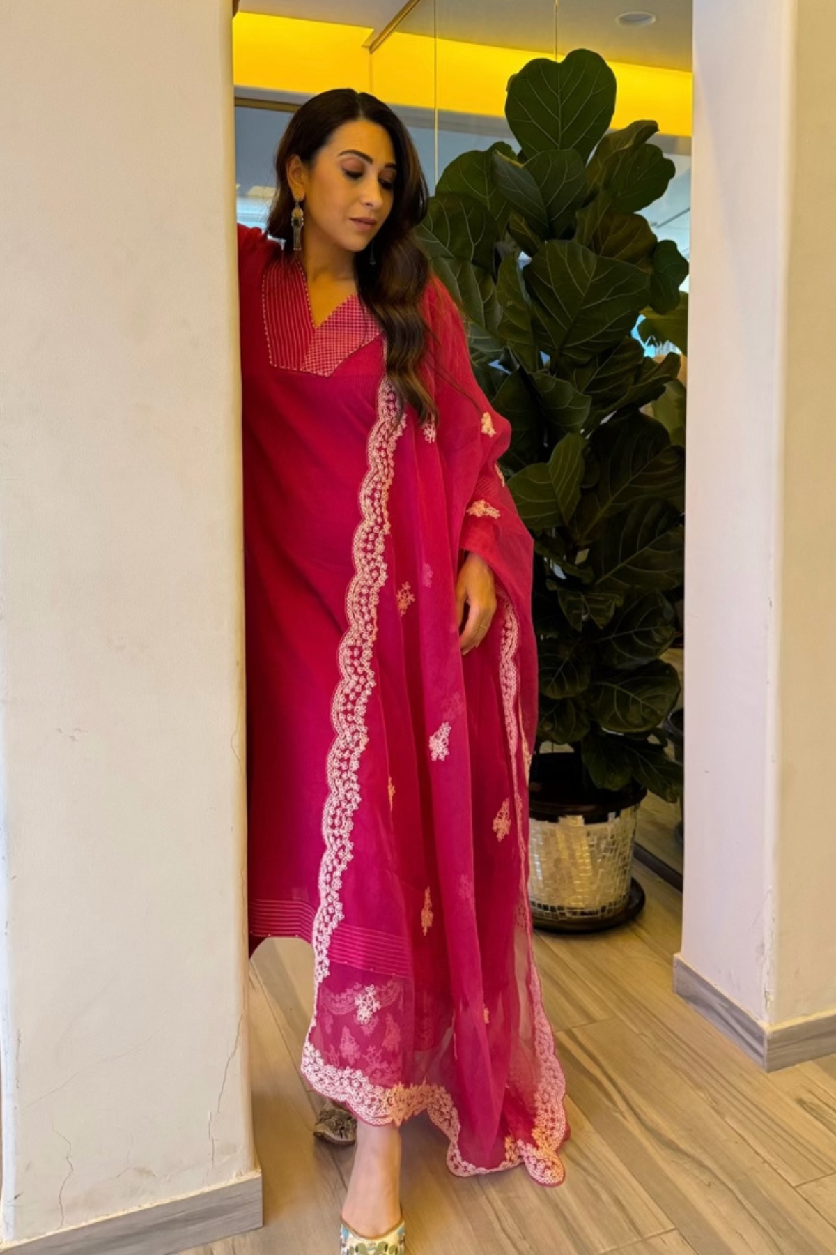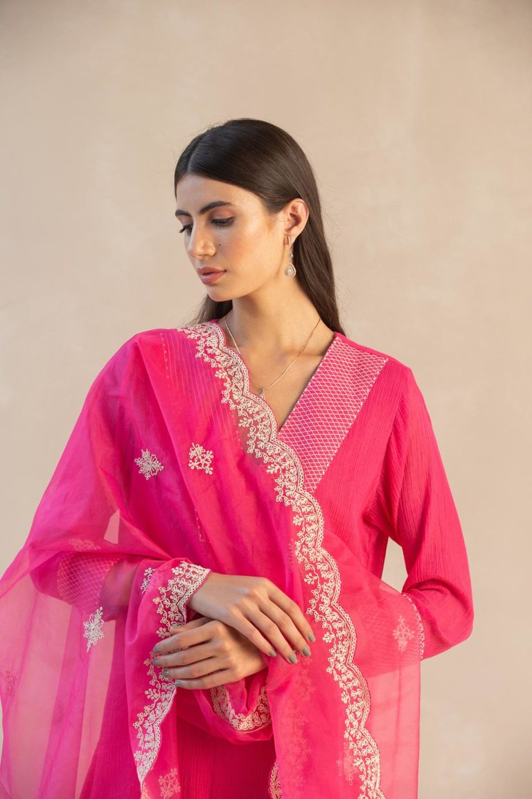 In a ruby pink, this breezy kurta set in cotton gauze comes with a V-neck and waterfall hemline. The scallops on the pants and diaphanous dupatta are embroidered and sprinkled with ecru threadwork motifs.