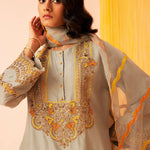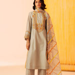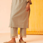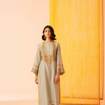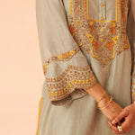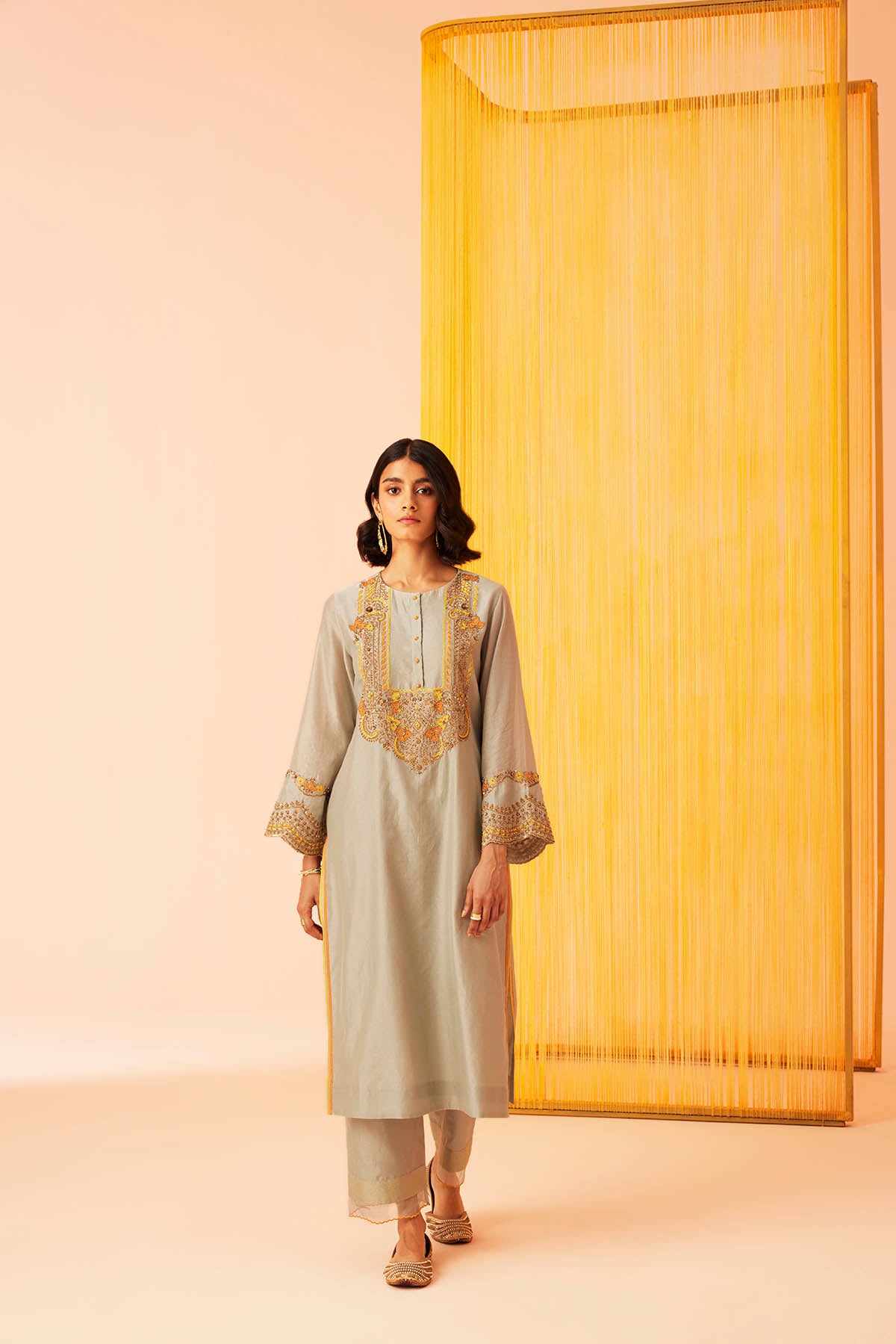 Get ready to make a statement with this sea green kurta set. The intricate detailing of resham, zari, and dabka on the yoke and sleeves adds a touch of elegance, while the scalloped palazzos with organza panel and scalloped dupatta with two colour applique waves make this outfit perfect for an intimate soiree. Complete the look with gold jewellery and ivory juttis.