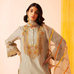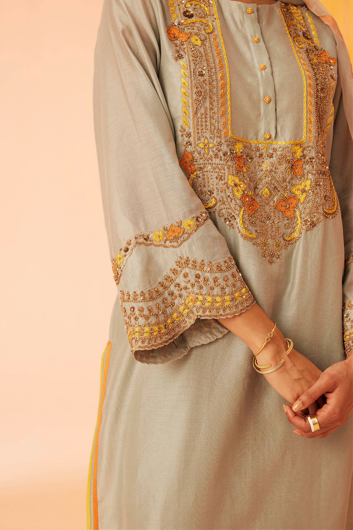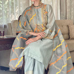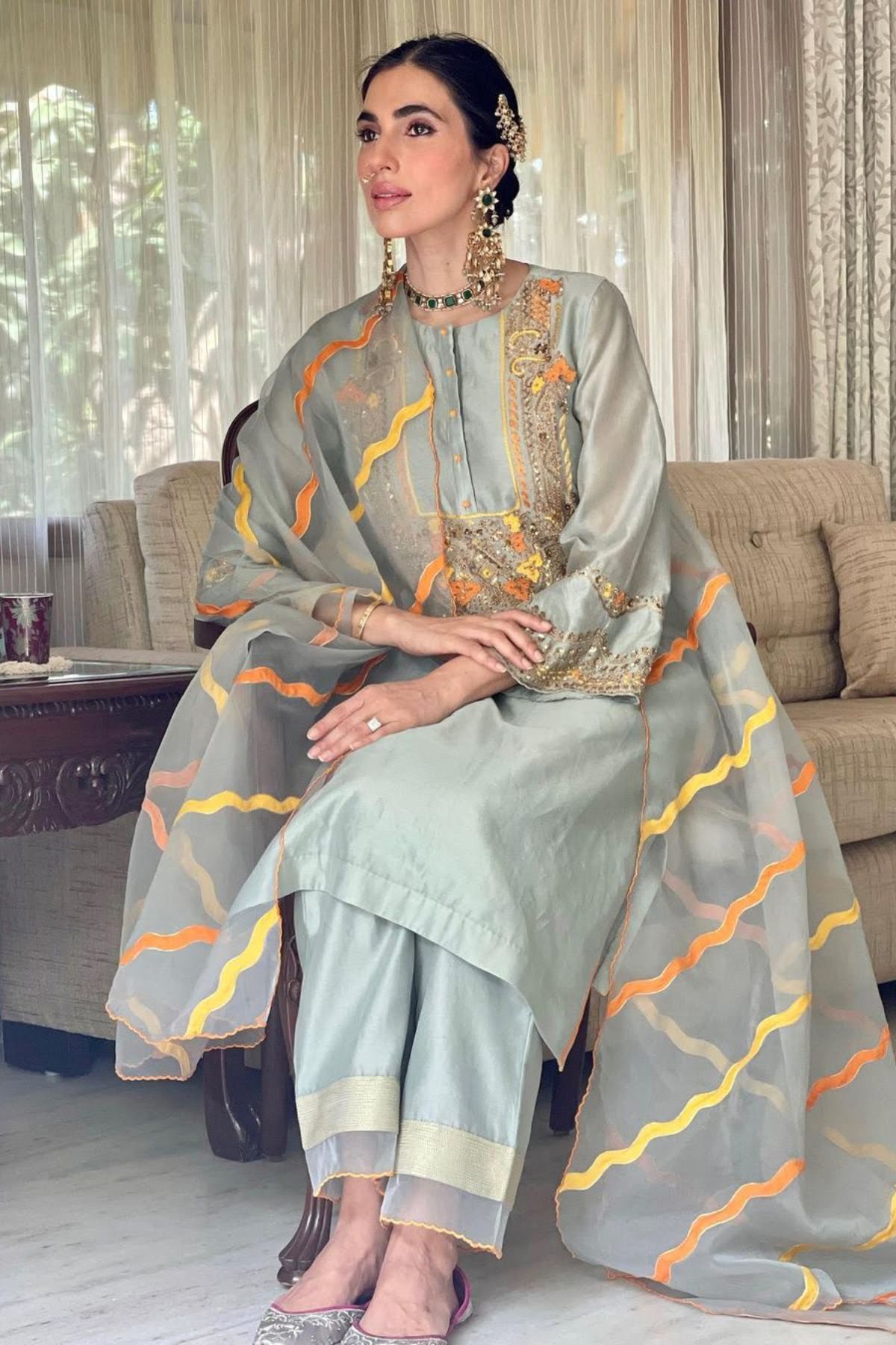 Get ready to make a statement with this sea green kurta set. The intricate detailing of resham, zari, and dabka on the yoke and sleeves adds a touch of elegance, while the scalloped palazzos with organza panel and scalloped dupatta with two colour applique waves make this outfit perfect for an intimate soiree. Complete the look with gold jewellery and ivory juttis.