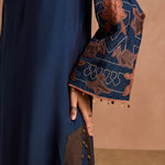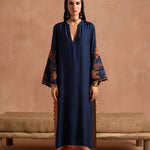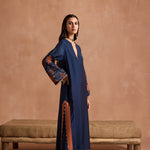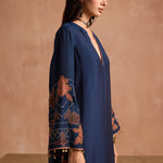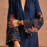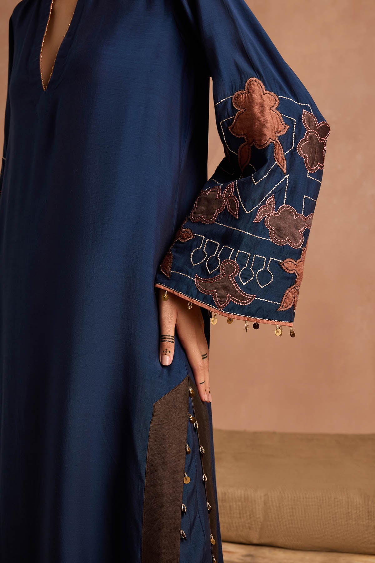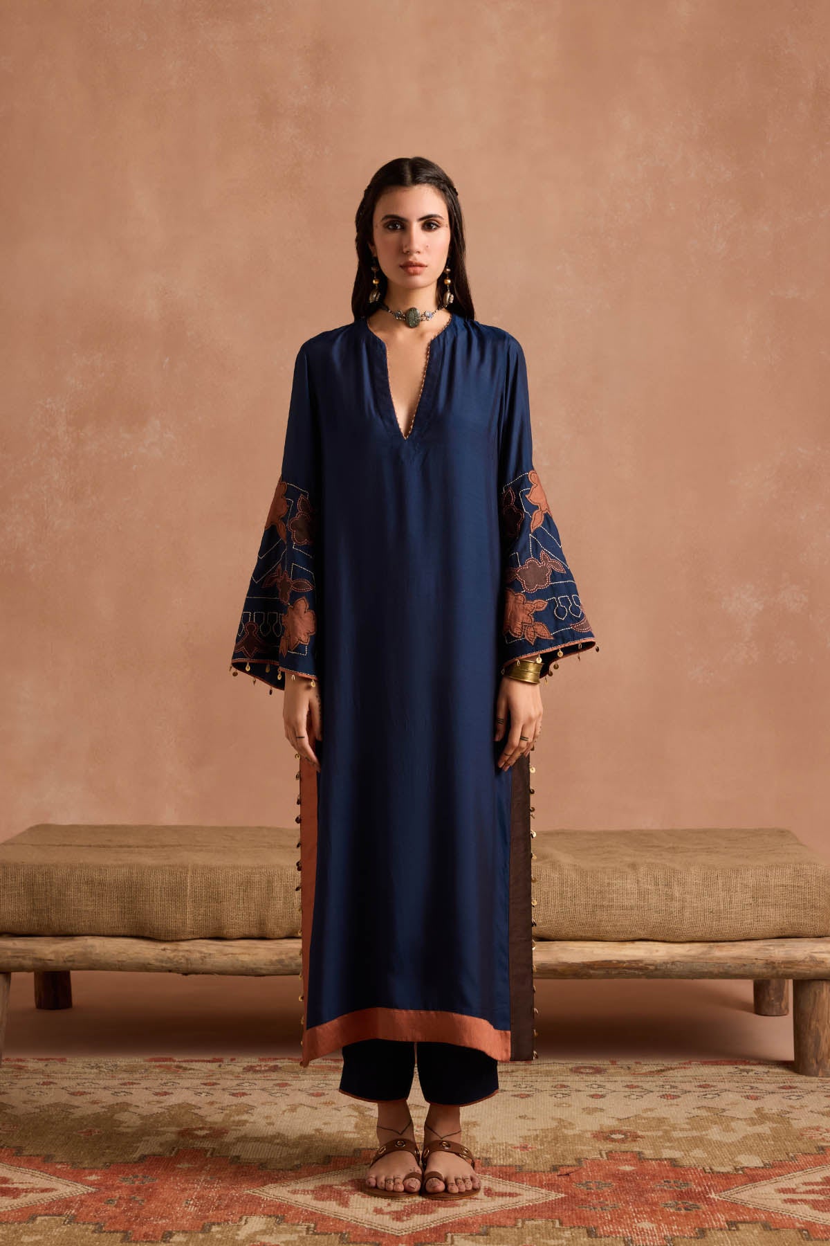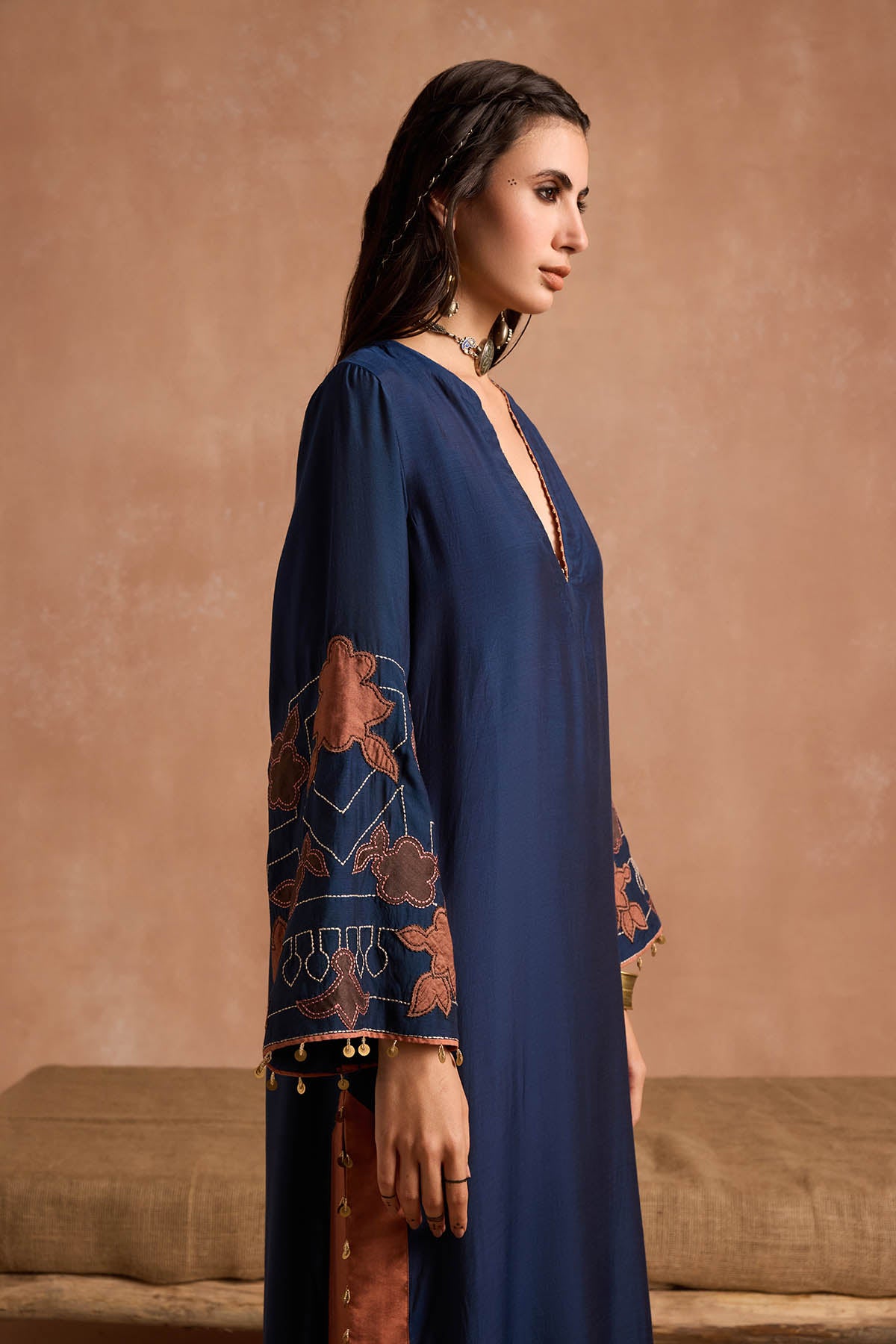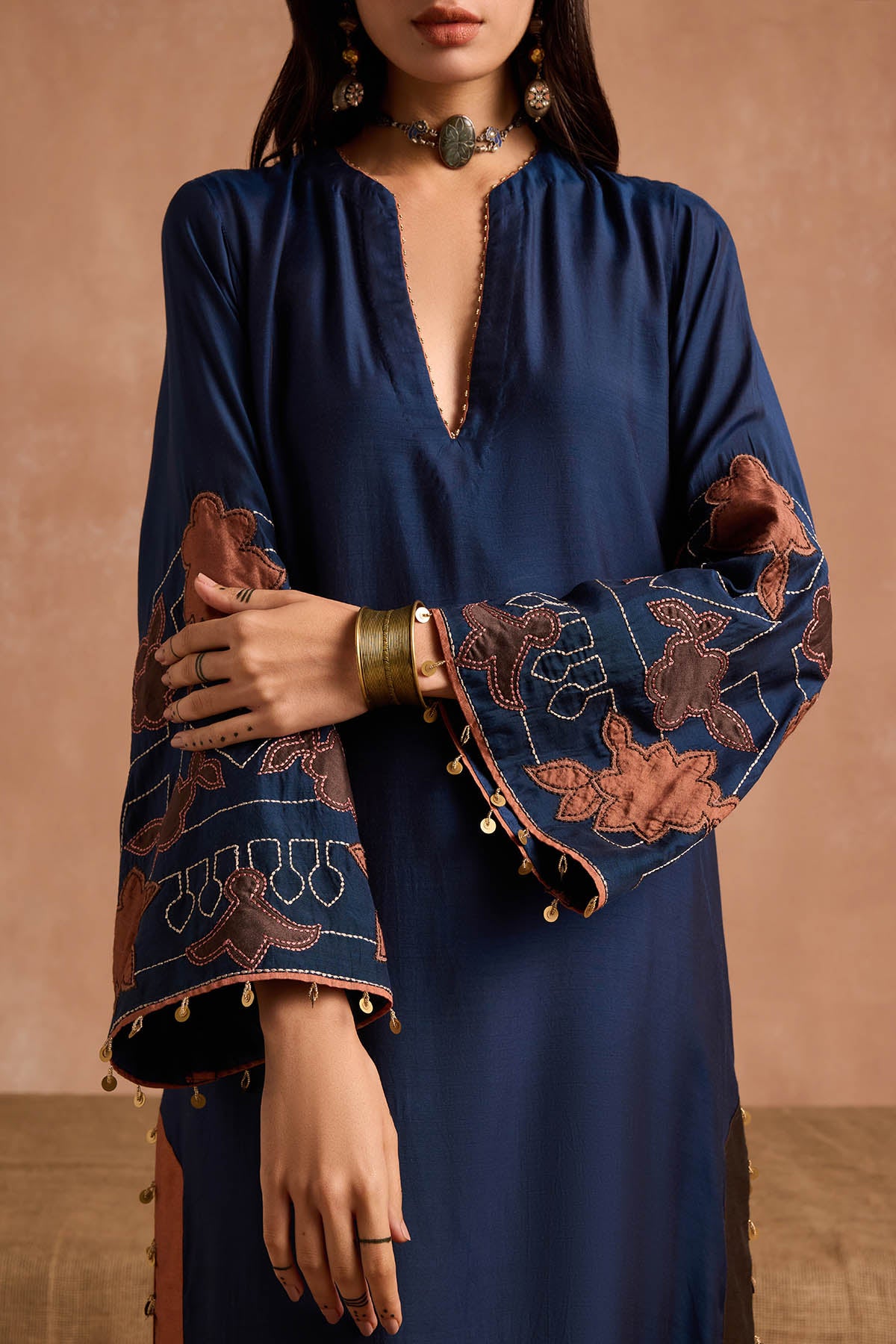 Indo-Western at it’s best. Our classic navy blue kurta set features floral applique patchwork on flared bell sleeves. A contemporary V-shaped neckline and signature coin hangings along the side slits give this one elevated appeal.