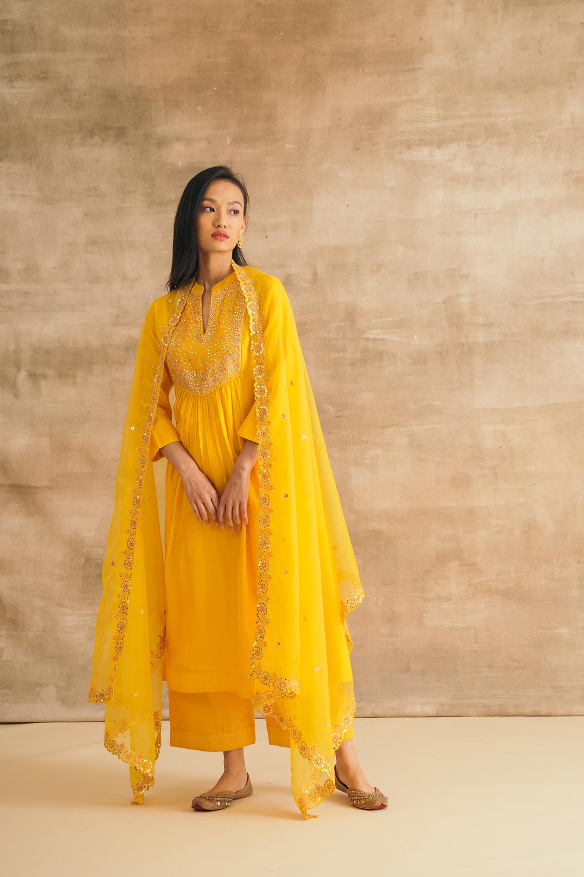 Our signature yellow silk chanderi set is accented with mirror embellishments along the yoke. The glam-quotient is amplified with an intricately embroidered dupatta featuring a scalloped border. Punctuate the look with statement earrings and a matching embellished bag.