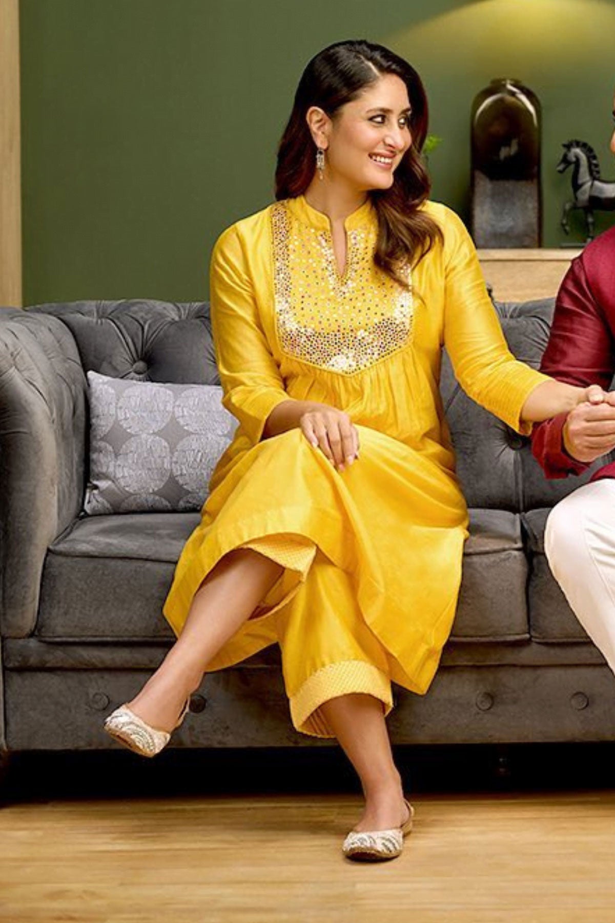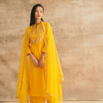 Our signature yellow silk chanderi set is accented with mirror embellishments along the yoke. The glam-quotient is amplified with an intricately embroidered dupatta featuring a scalloped border. Punctuate the look with statement earrings and a matching embellished bag.