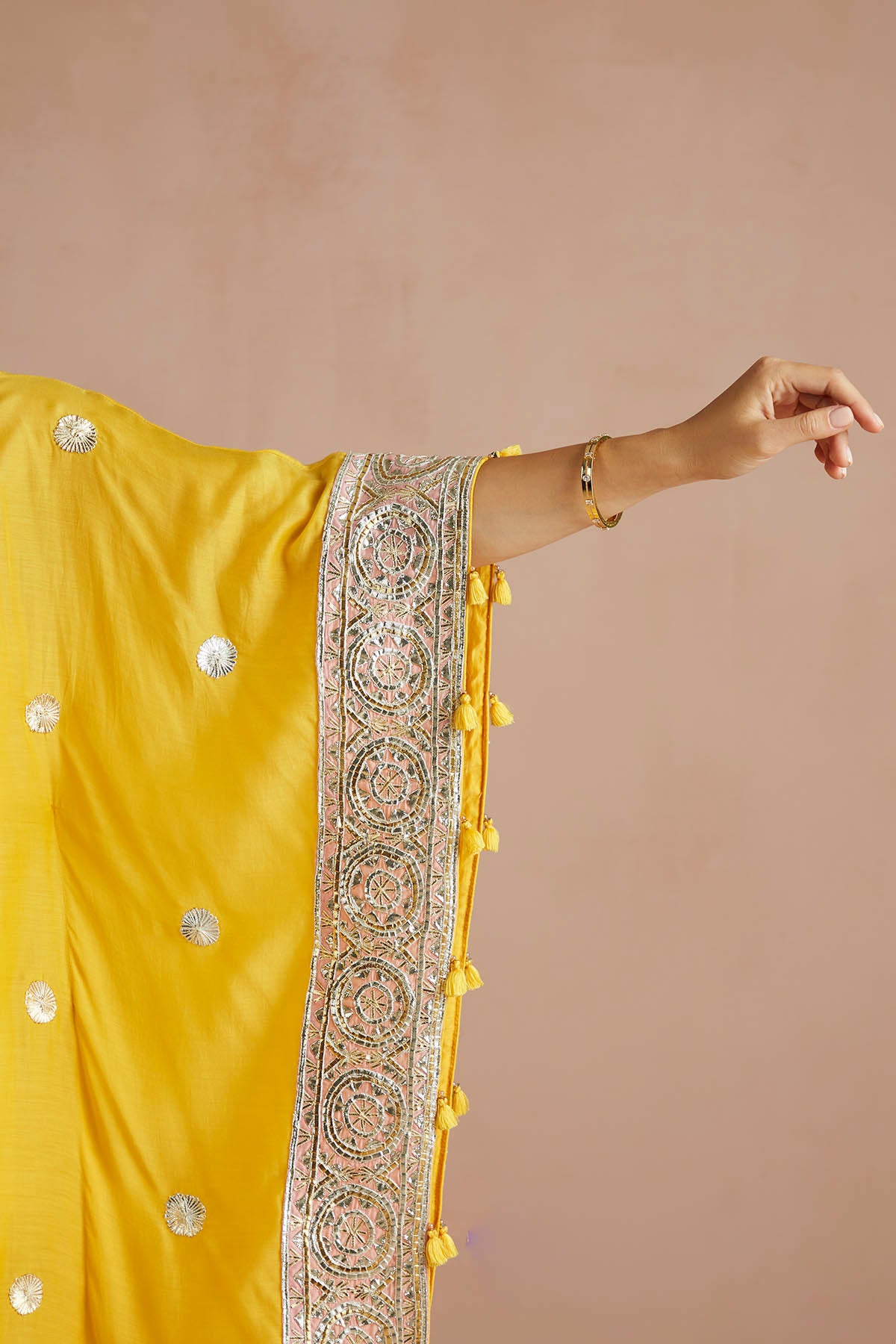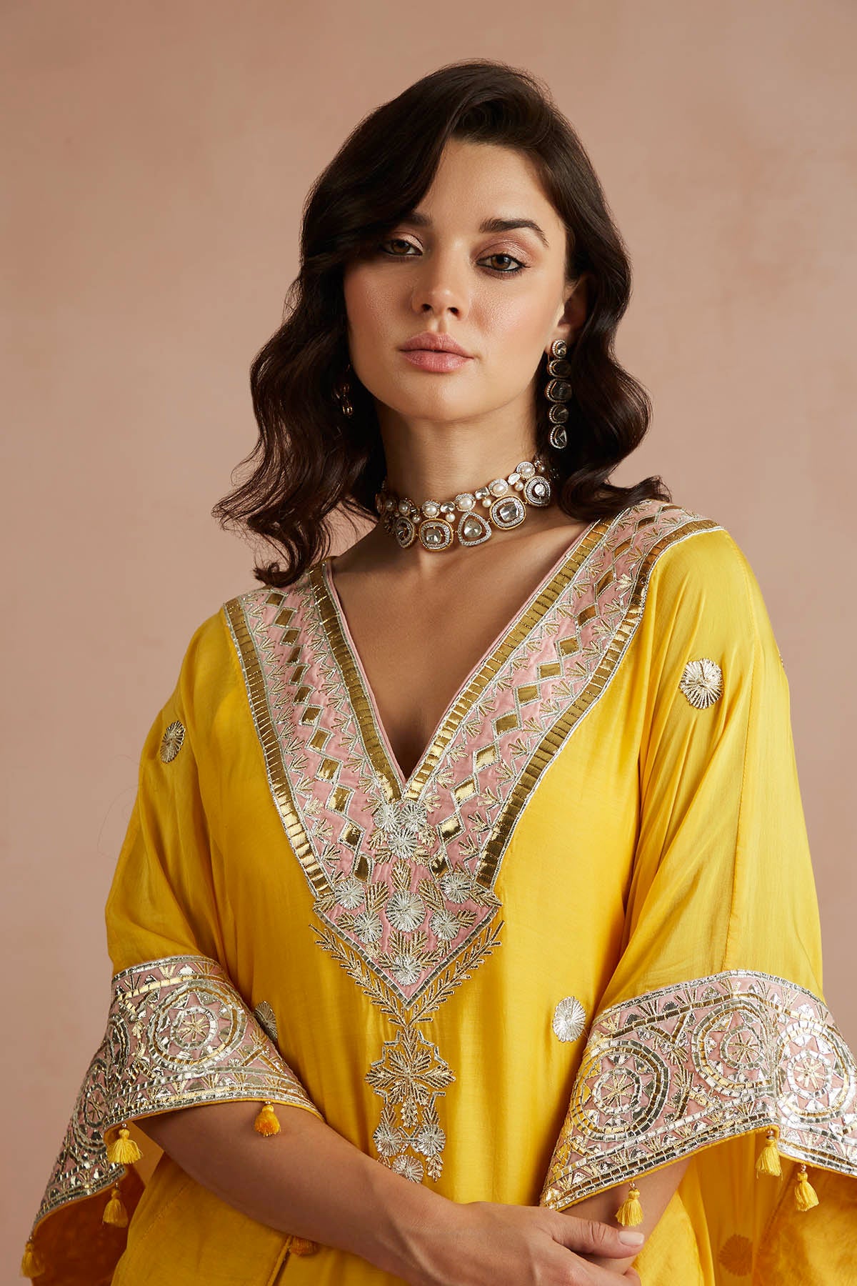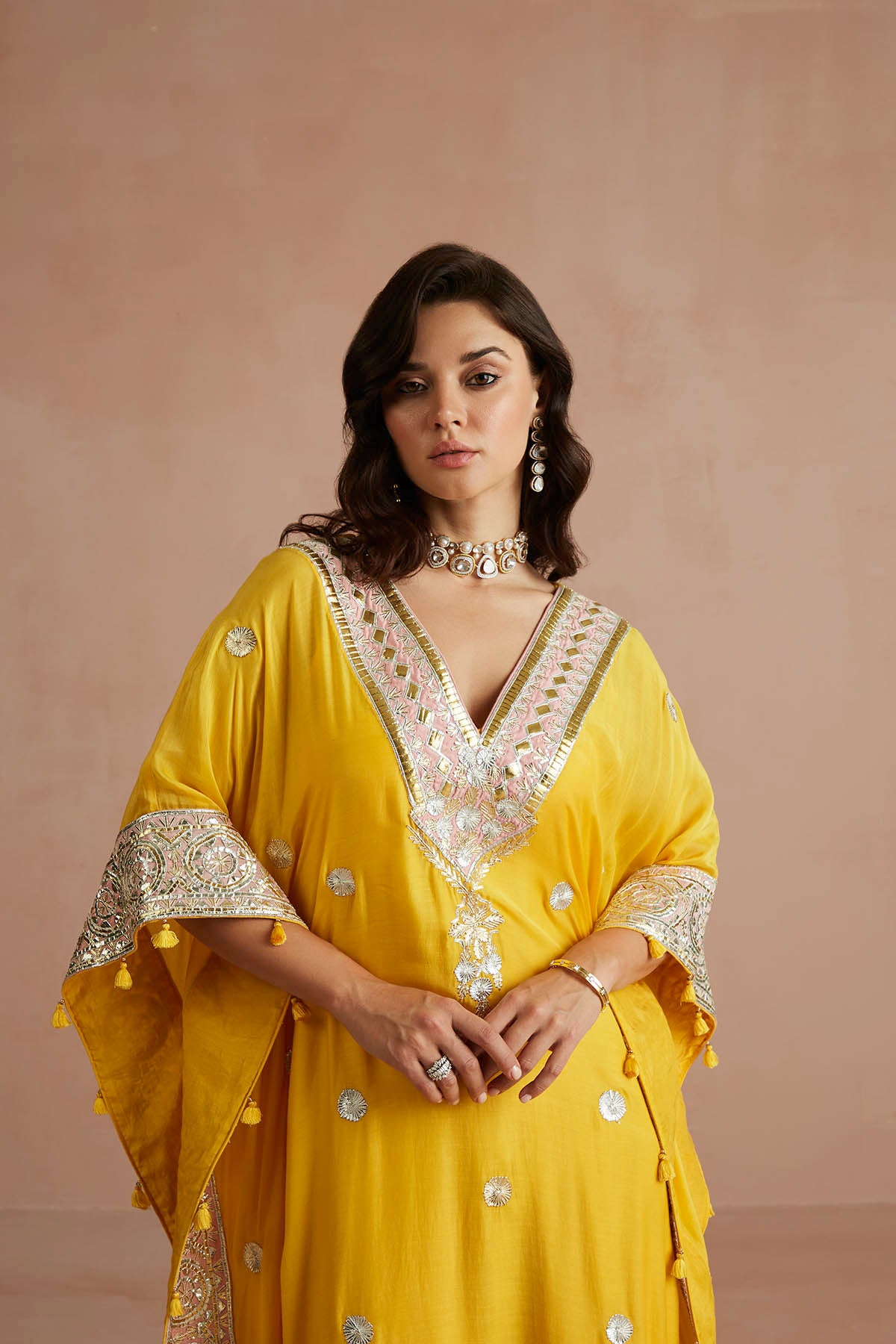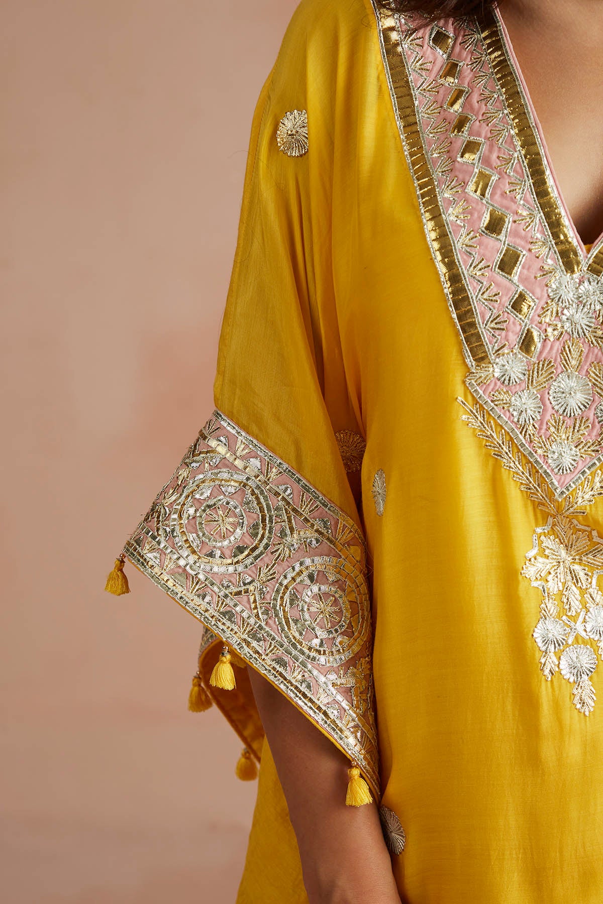 Kaftan cool: This sunny yellow kaftan nails fuss-free festive dressing, while keeping it polished. Hints of blush pink at the sleeves and neckline, accentuated by glistening gota patchwork, make this a wedding season must-have.