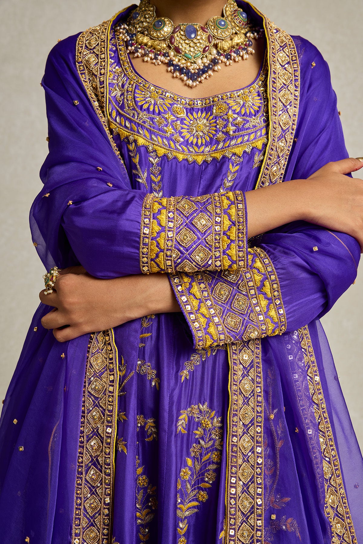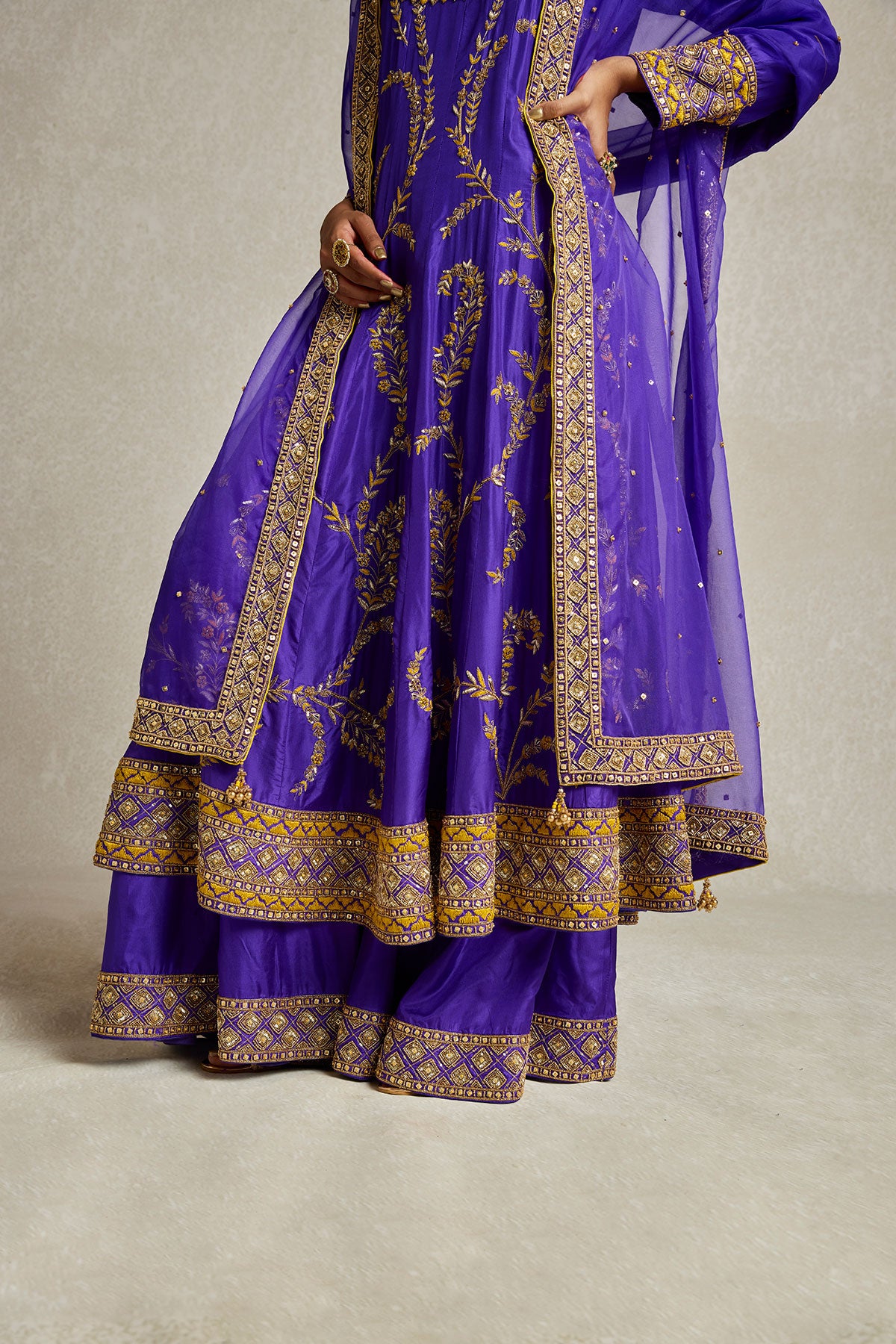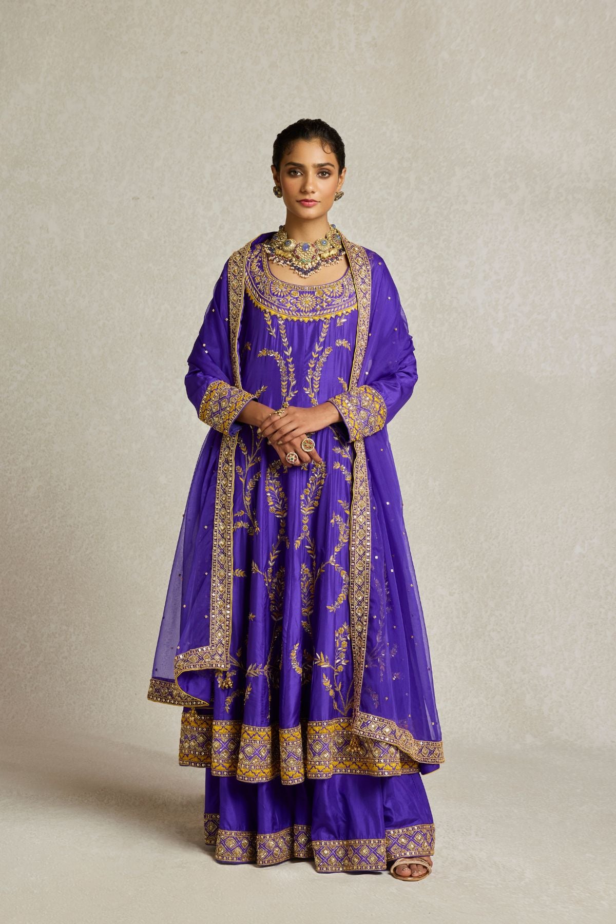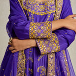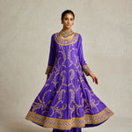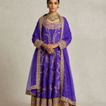 Inspired by royal opulence, this purple Anarkali with sharara is adorned with threadwork, zardozi, and aari hand embroidery. The tone on tone embellished organza dupatta gives you a variety of draping options to further elevate this already statement look.