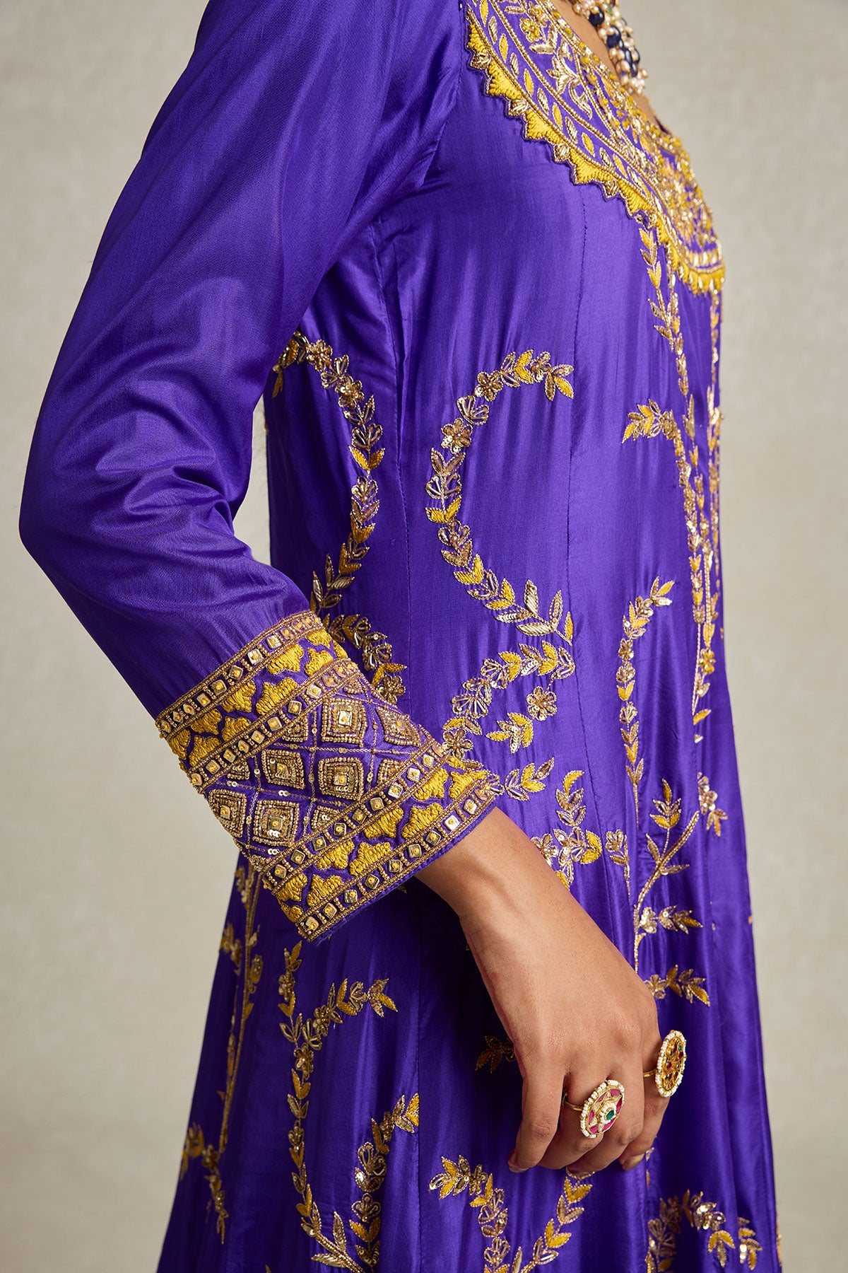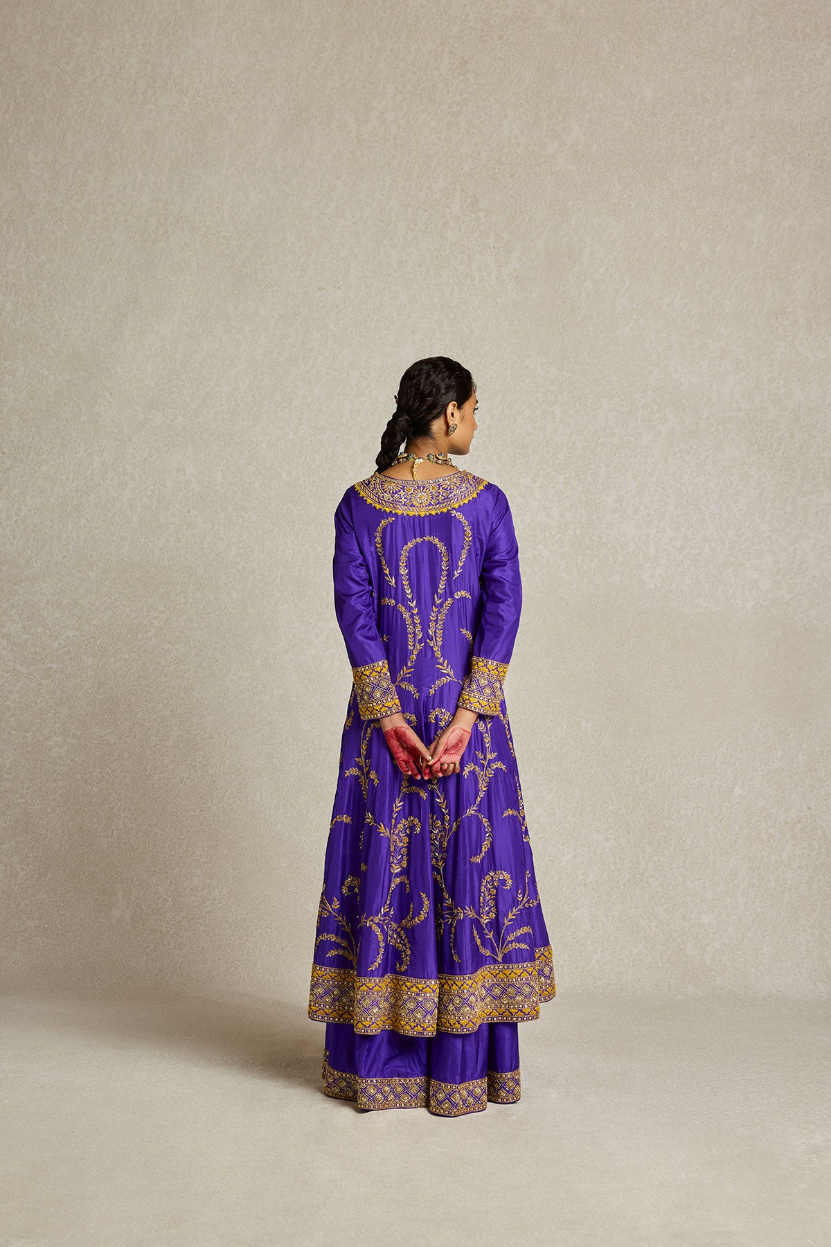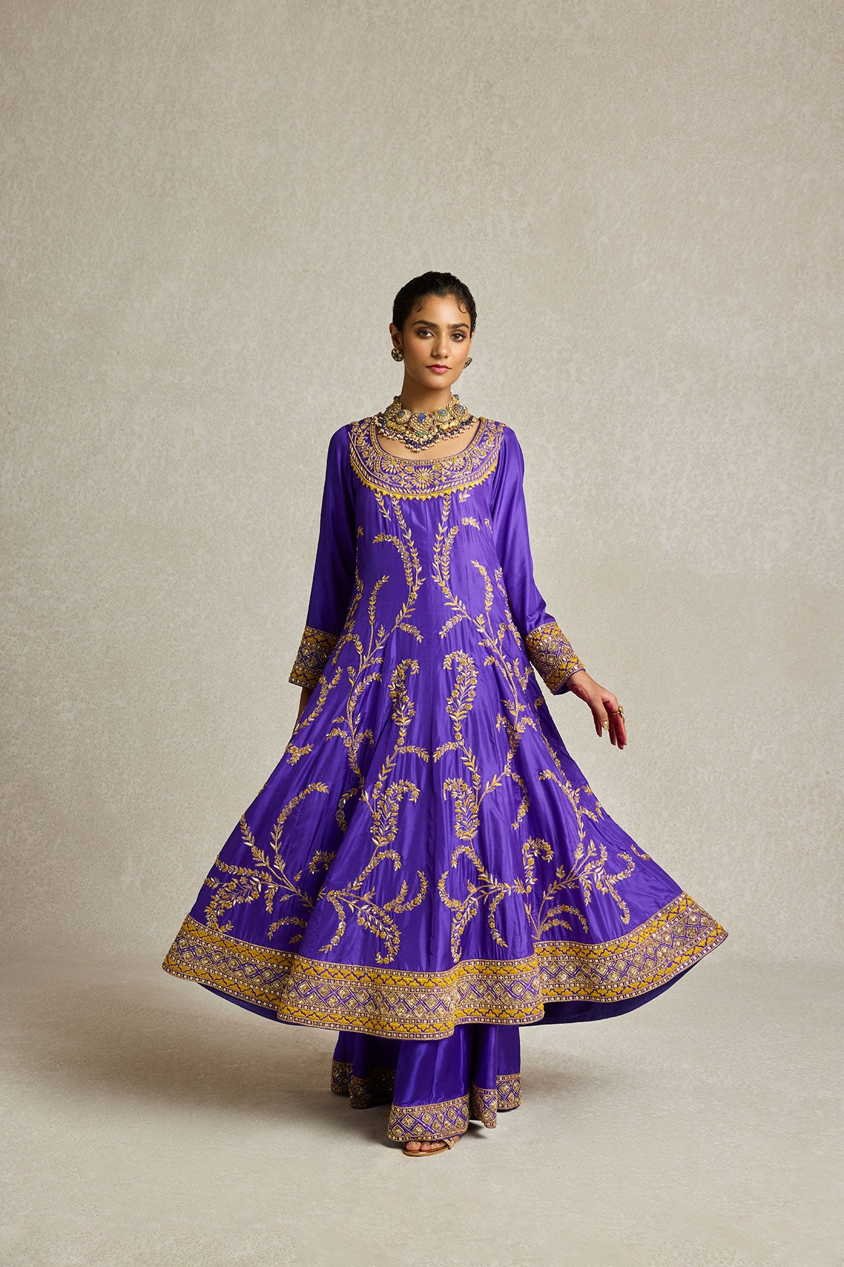 Inspired by royal opulence, this purple Anarkali with sharara is adorned with threadwork, zardozi, and aari hand embroidery. The tone on tone embellished organza dupatta gives you a variety of draping options to further elevate this already statement look.