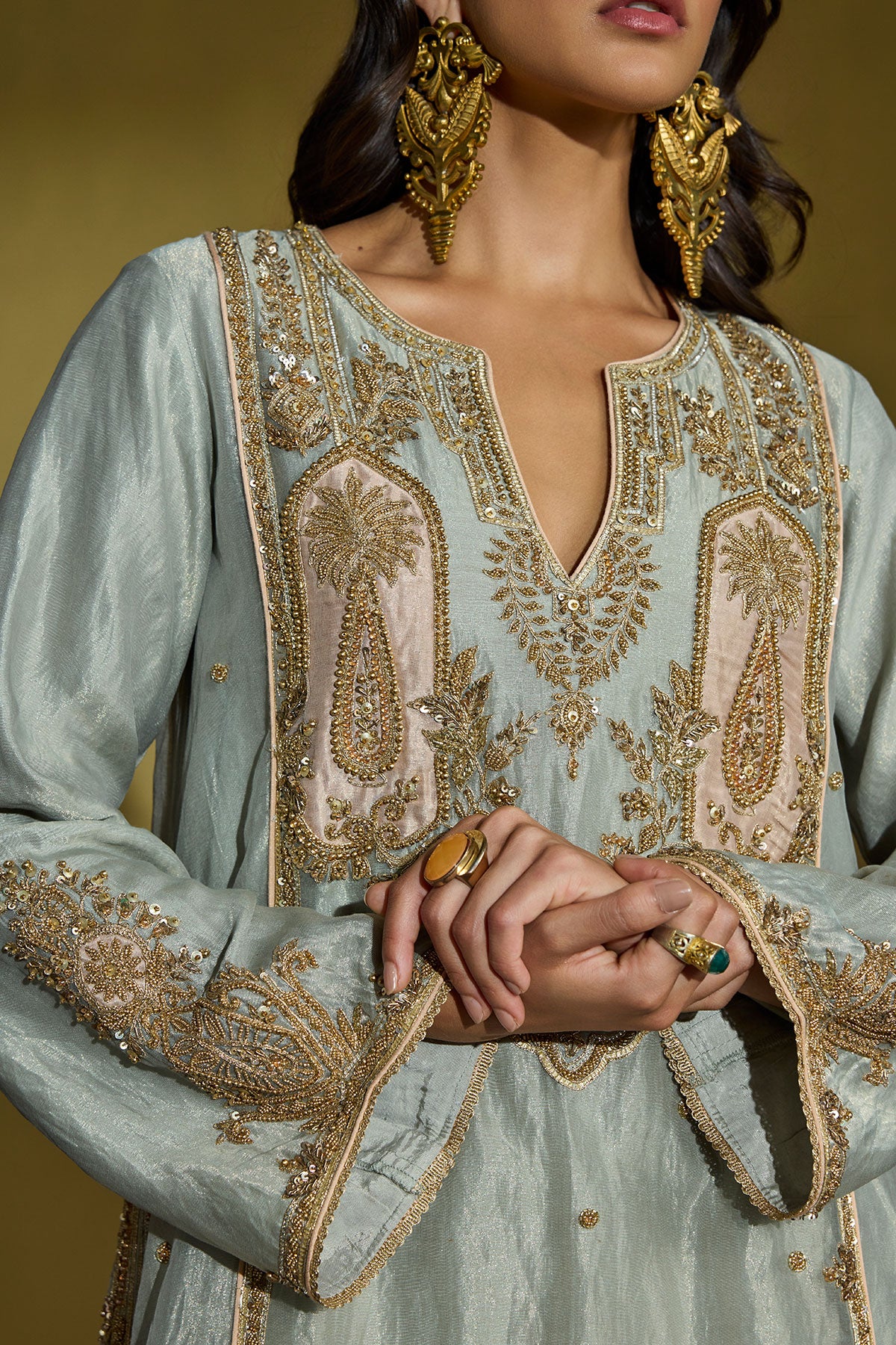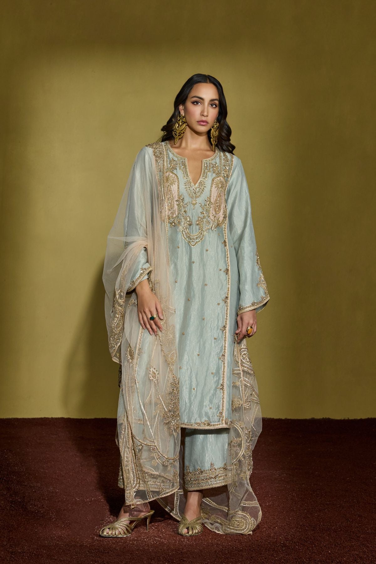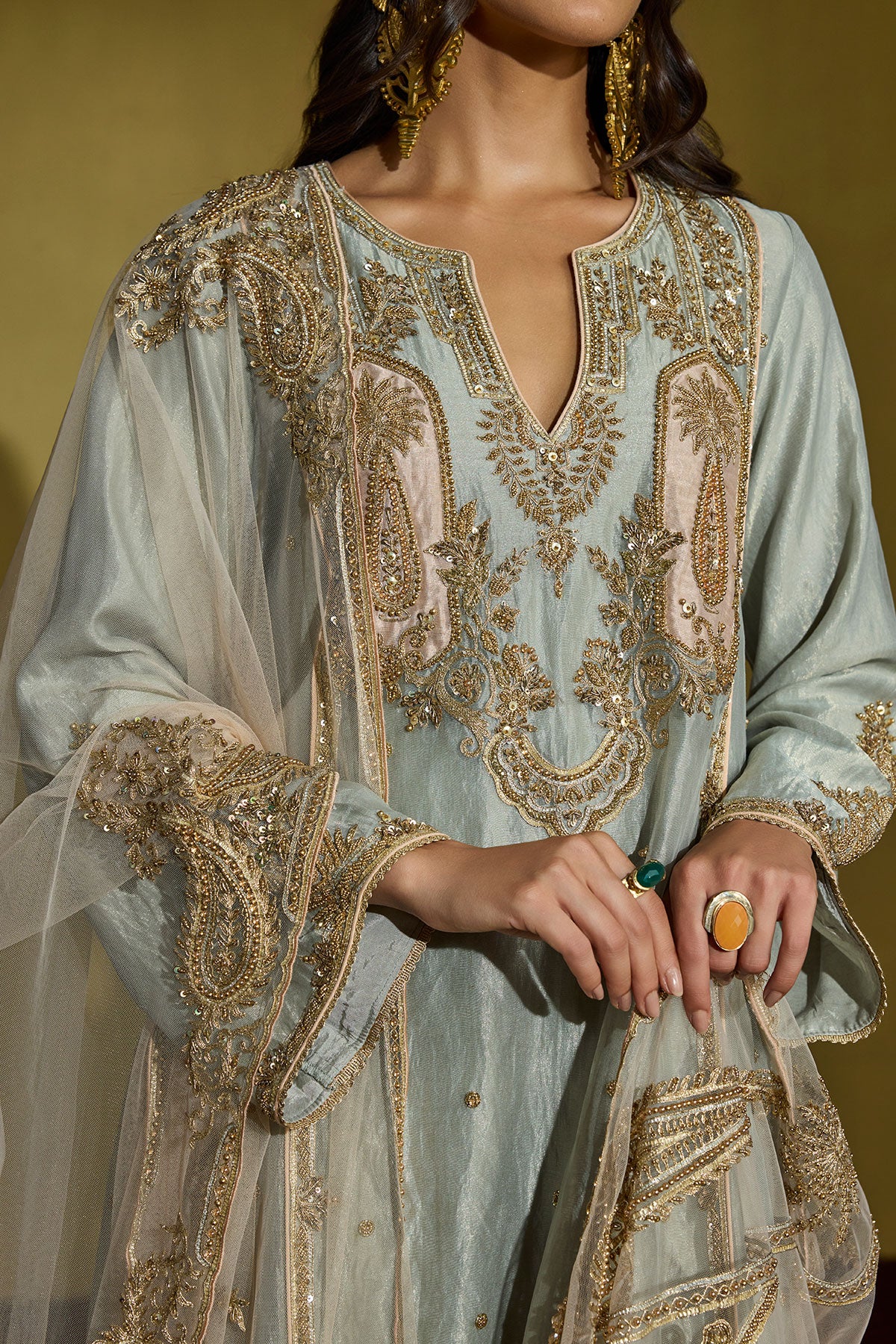 A sage green kurta set that balances ease with intricacy—embellished with delicate kiran dori and gota embroidery, accented by subtle peach contrasts. Paired with a sheer peach dupatta and fluid palazzos, it’s a graceful choice for celebrations that call for quiet beauty and timeless charm.