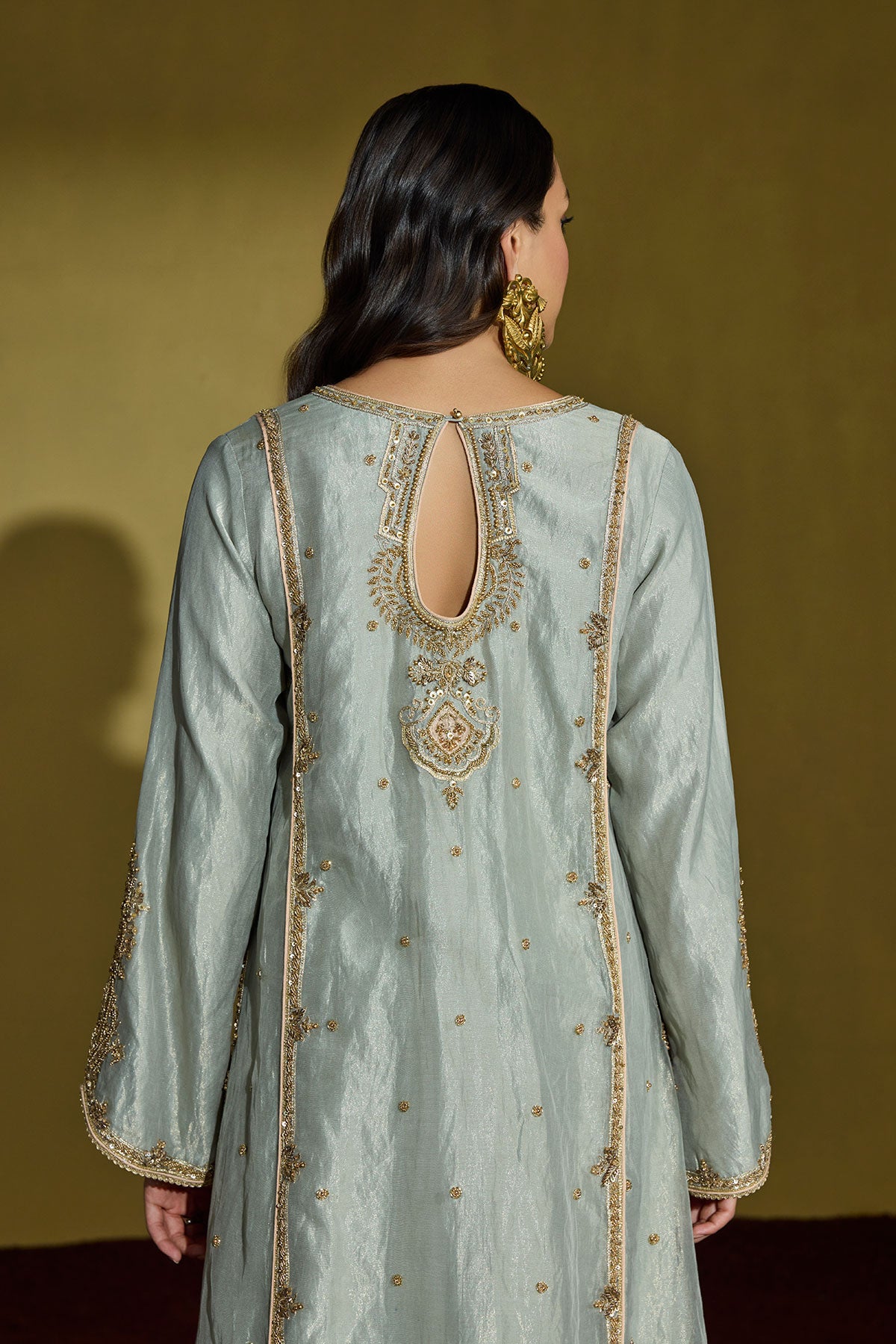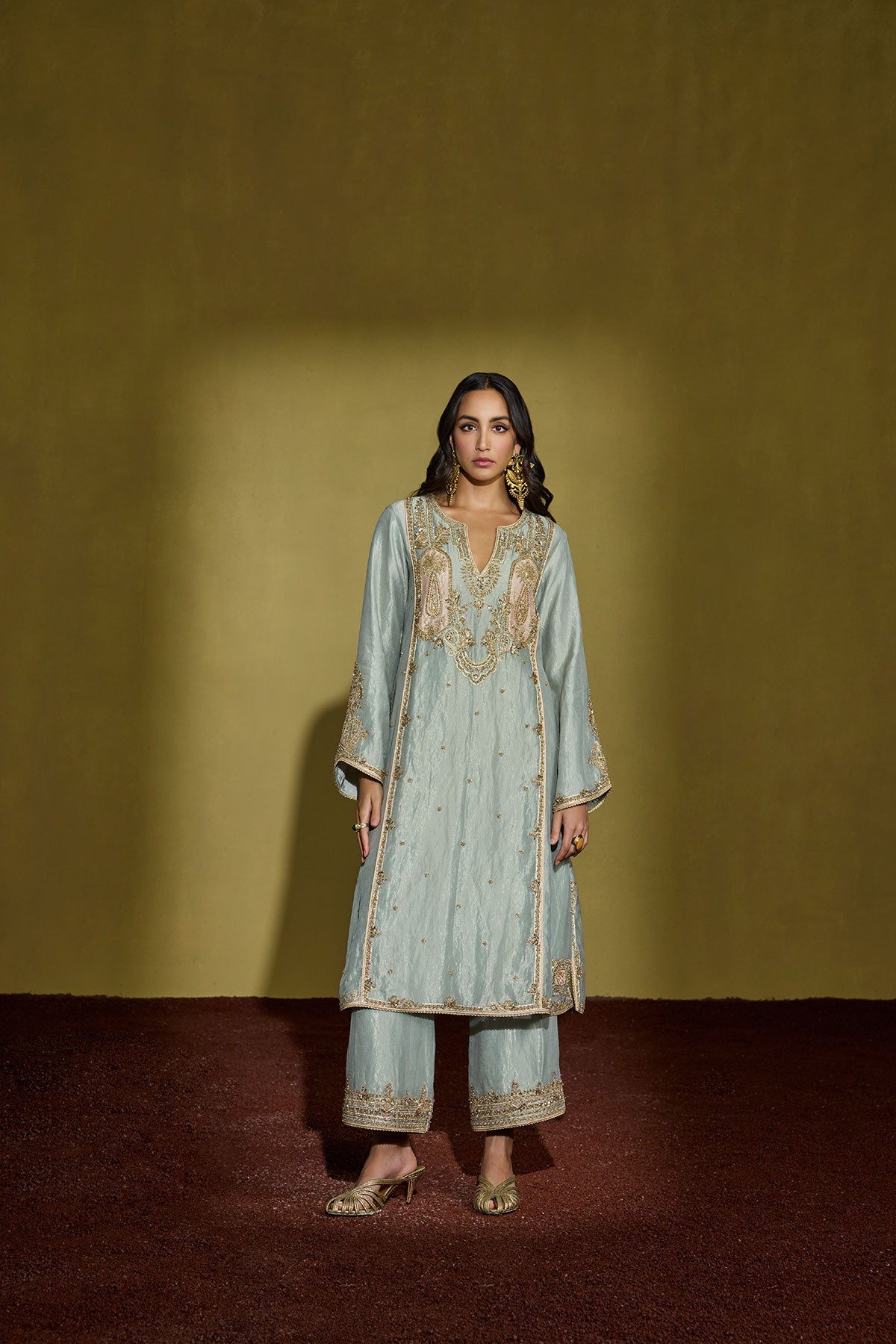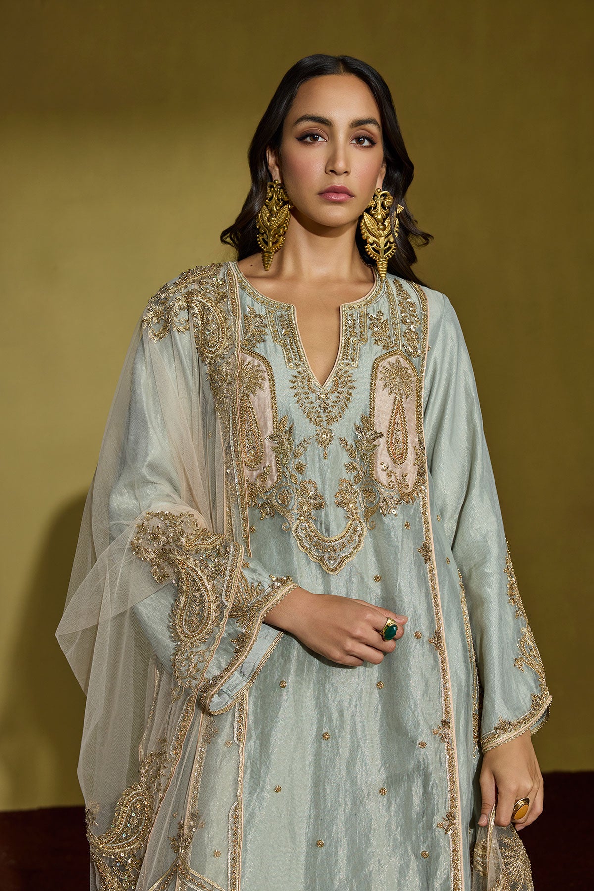 A sage green kurta set that balances ease with intricacy—embellished with delicate kiran dori and gota embroidery, accented by subtle peach contrasts. Paired with a sheer peach dupatta and fluid palazzos, it’s a graceful choice for celebrations that call for quiet beauty and timeless charm.