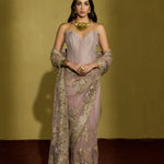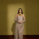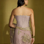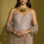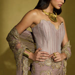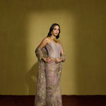 A lilac saree that feels like poetry in motion—crafted in sheer net and embroidered with gold floral motifs in kiran dori and gota, each detail catching the light as you move. Paired with a statement corset blouse that mirrors the saree’s artistry, it’s a modern take on timeless opulence.