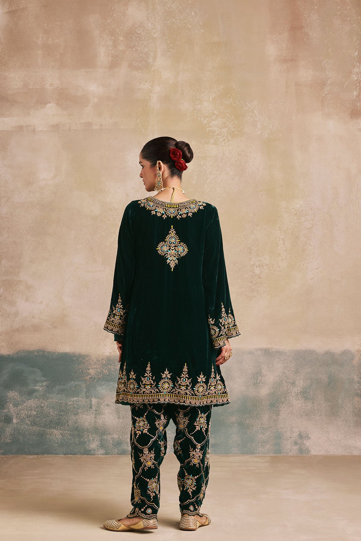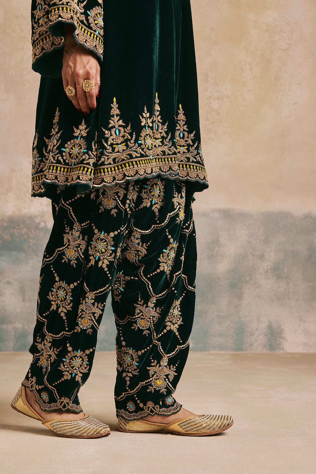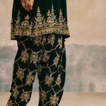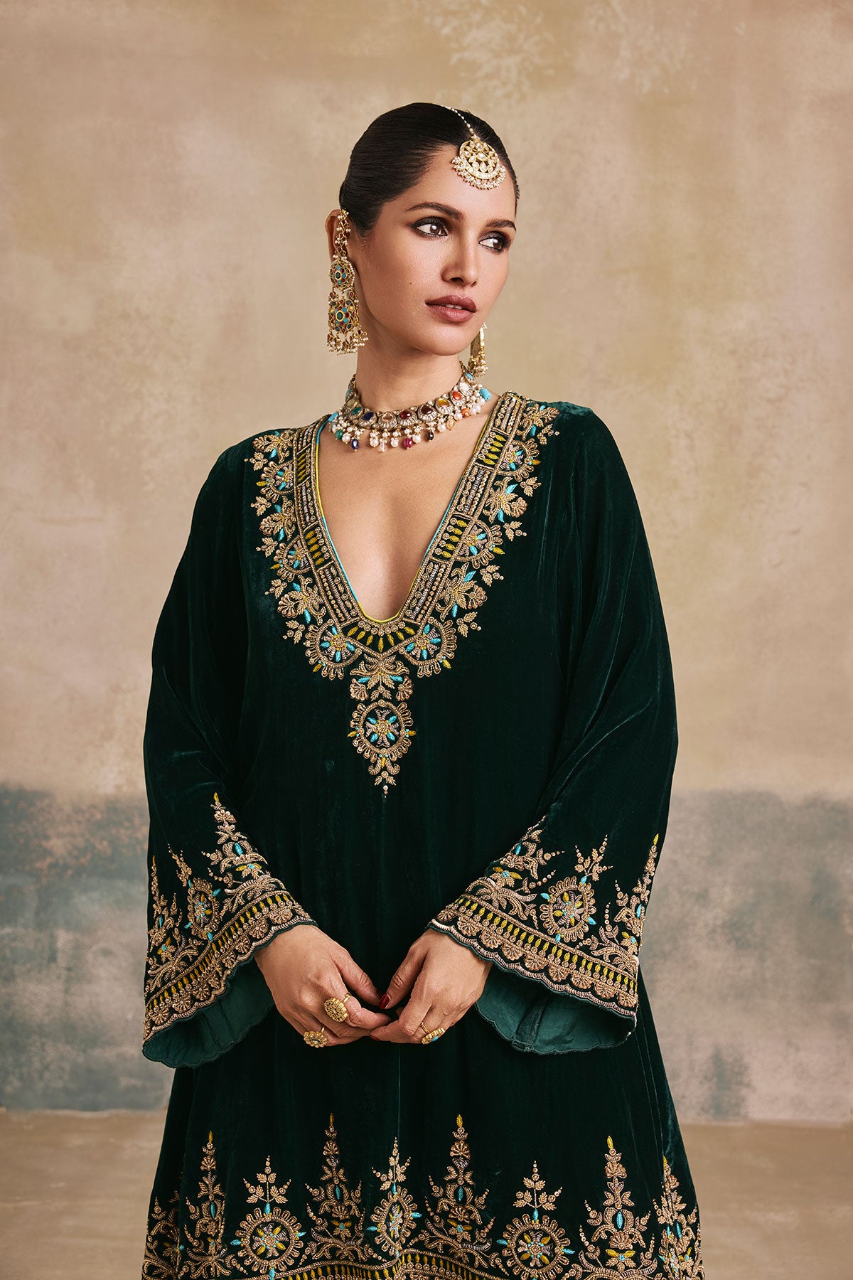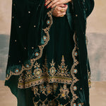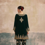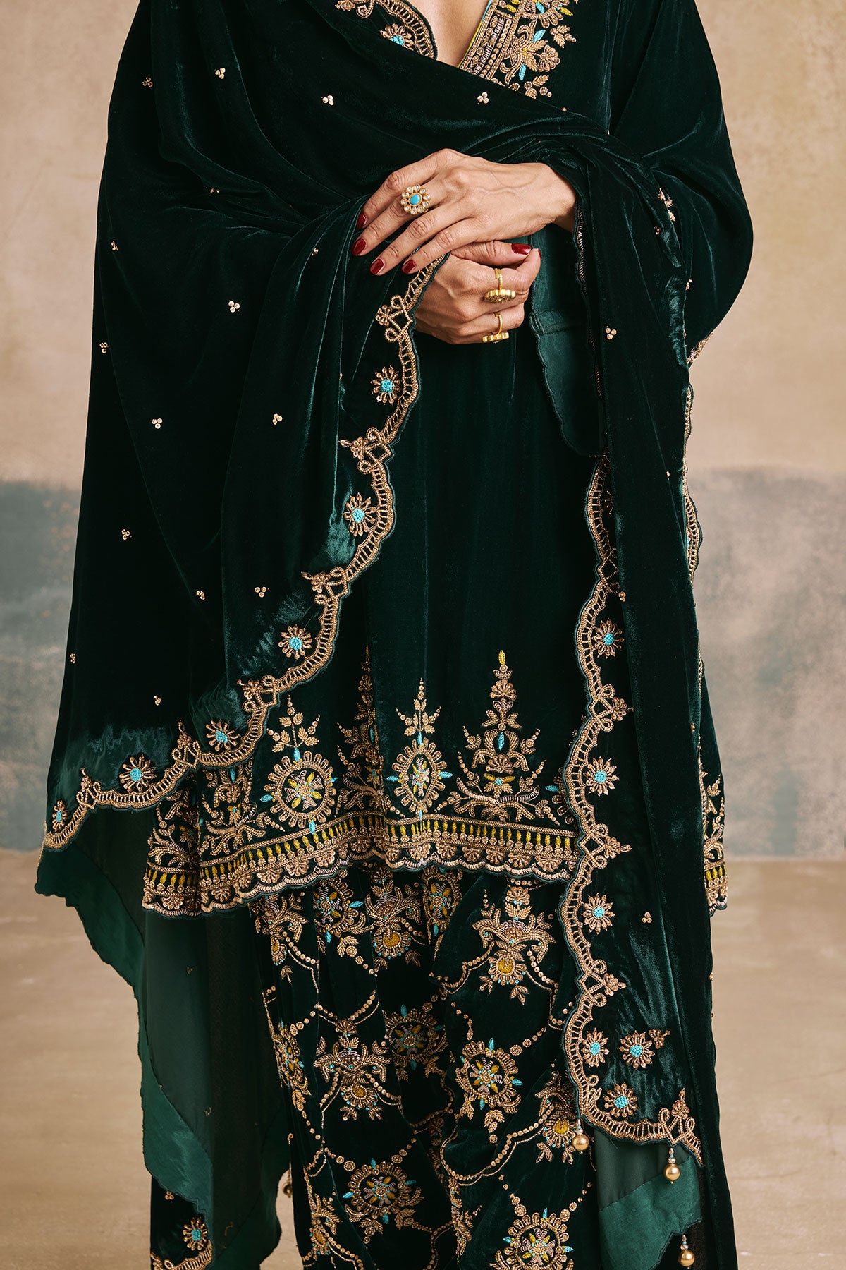 The Zehra Salwar Set combines rich bottle green silk velvet with intricate Mughal-inspired embroidery. From the ornate short kurta to the intricately detailed salwar and regal dupatta, every thread tells a story of craftsmanship and grandeur.