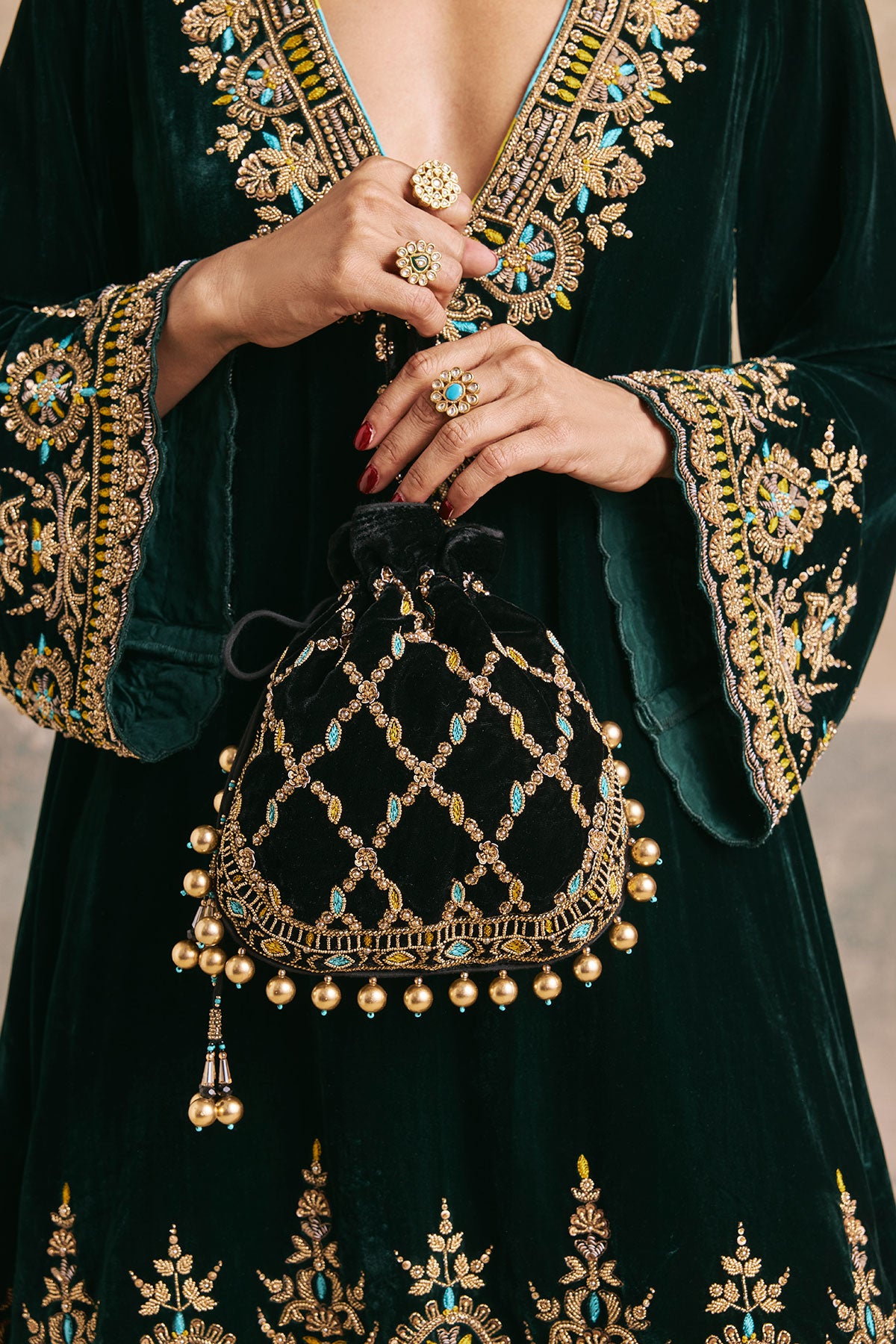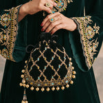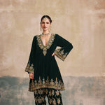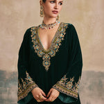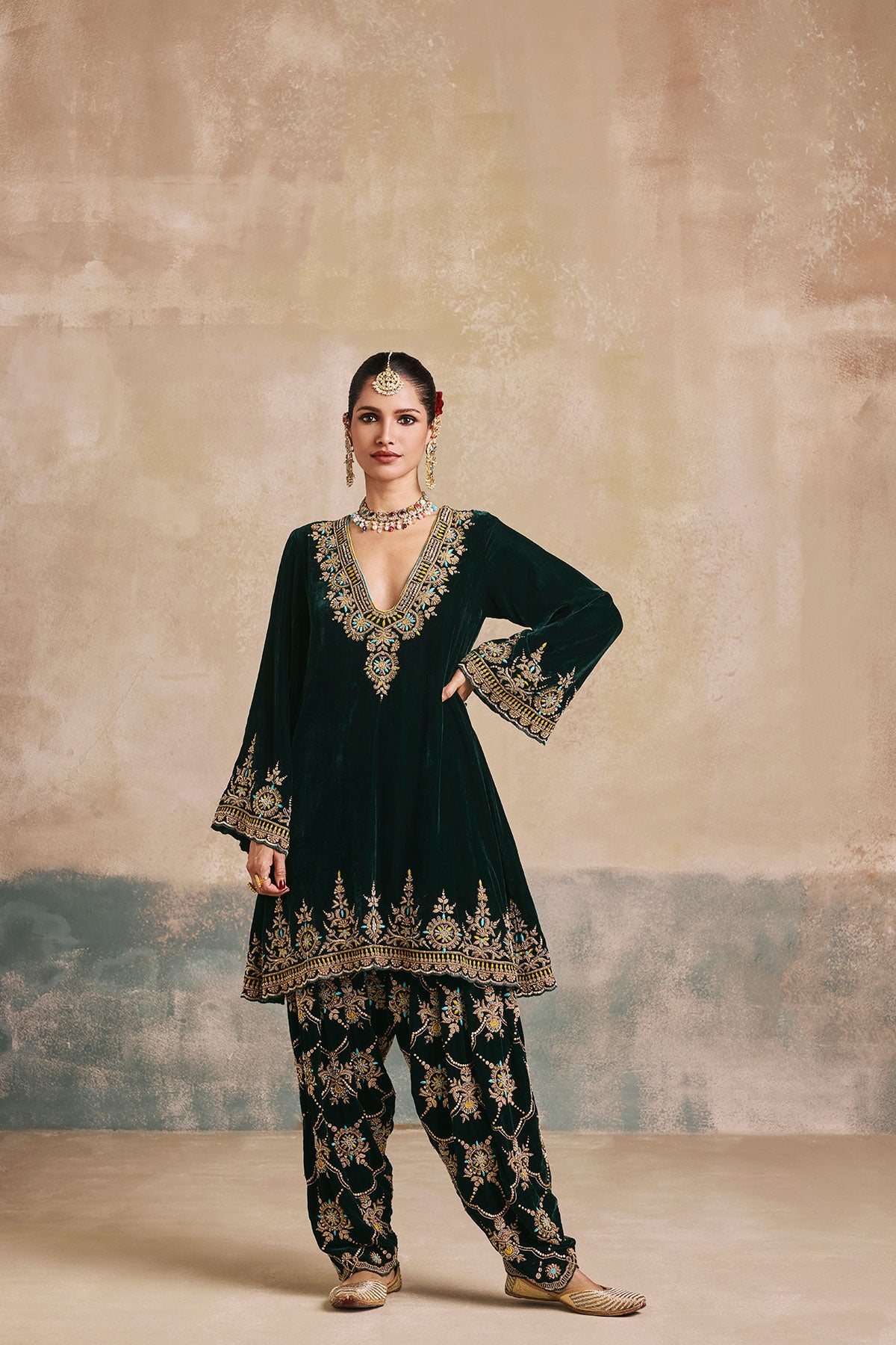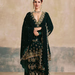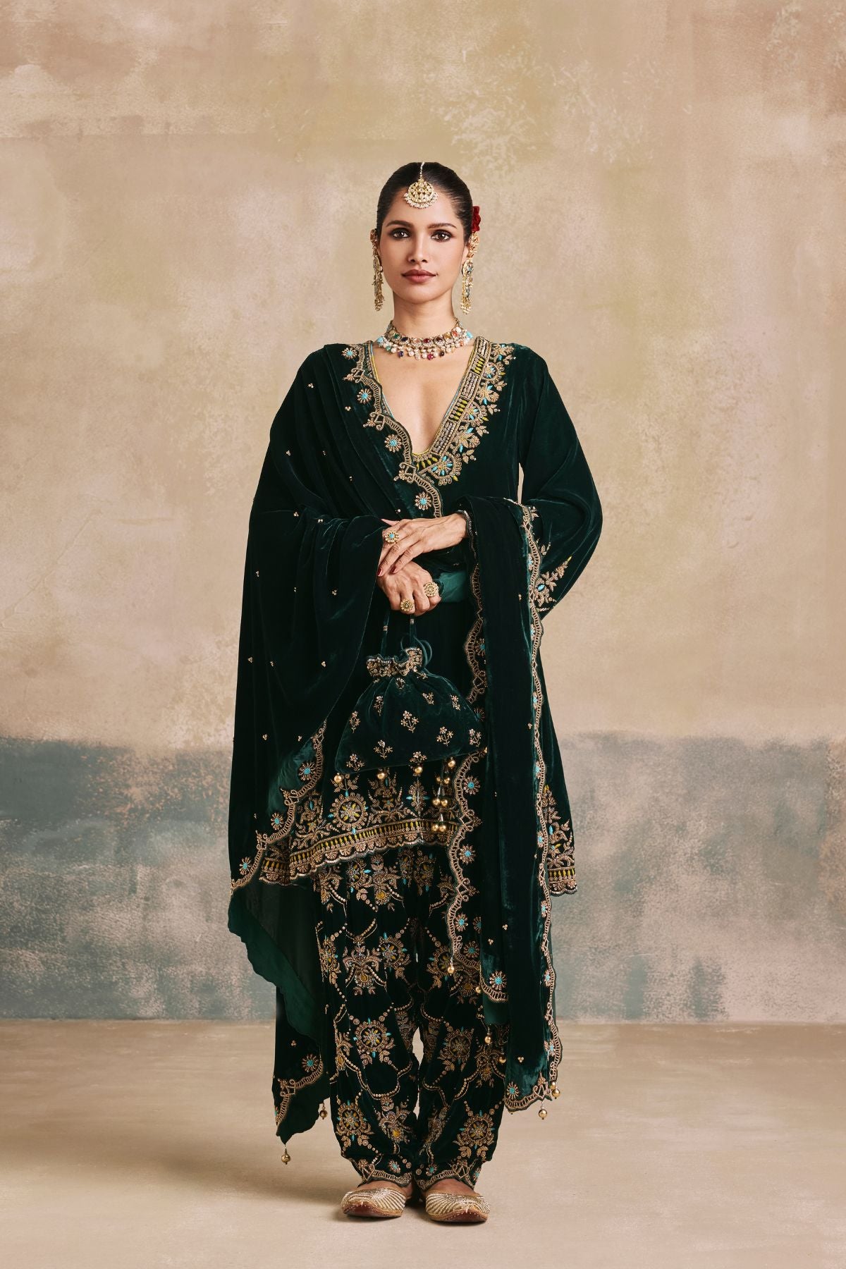 The Zehra Salwar Set combines rich bottle green silk velvet with intricate Mughal-inspired embroidery. From the ornate short kurta to the intricately detailed salwar and regal dupatta, every thread tells a story of craftsmanship and grandeur.