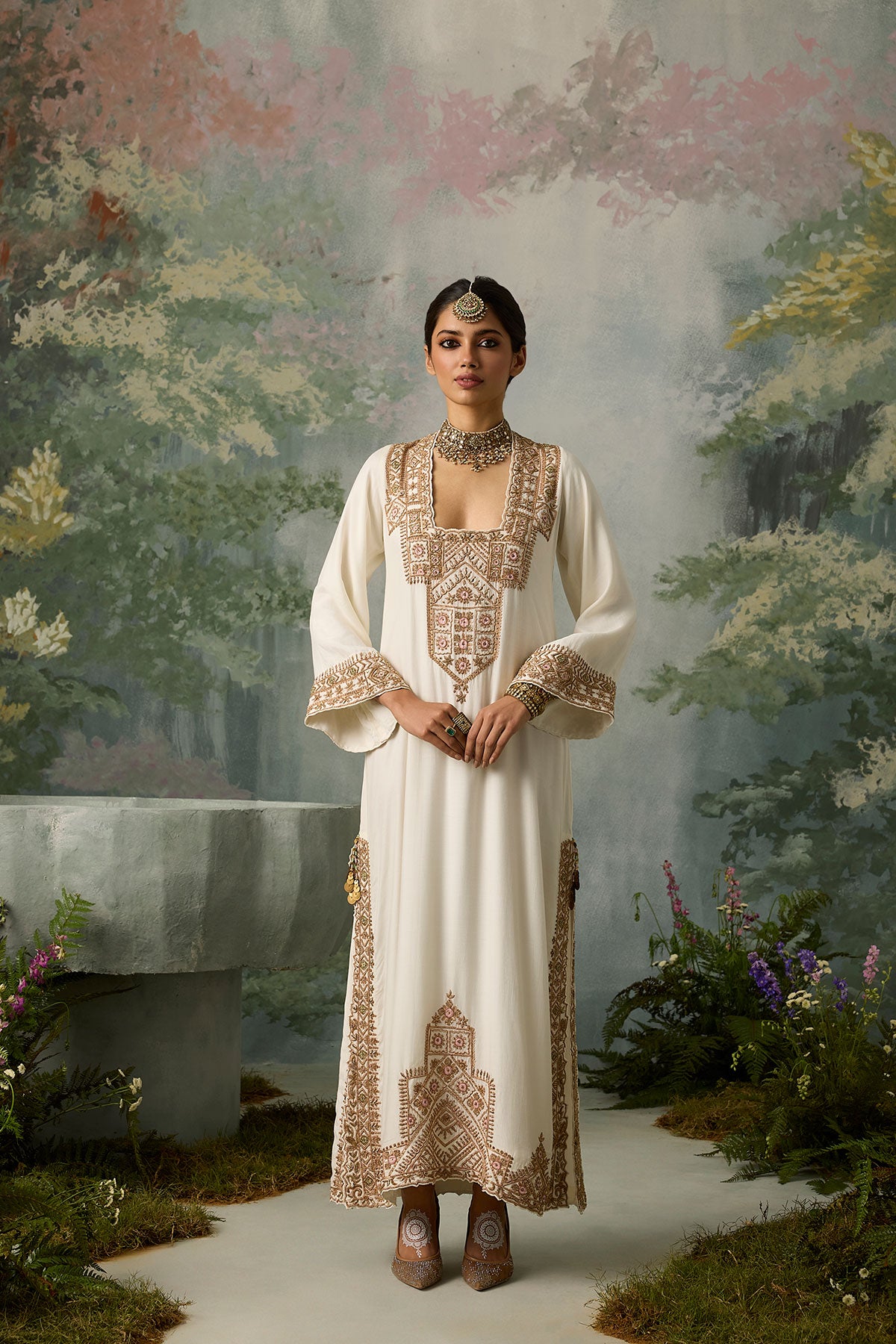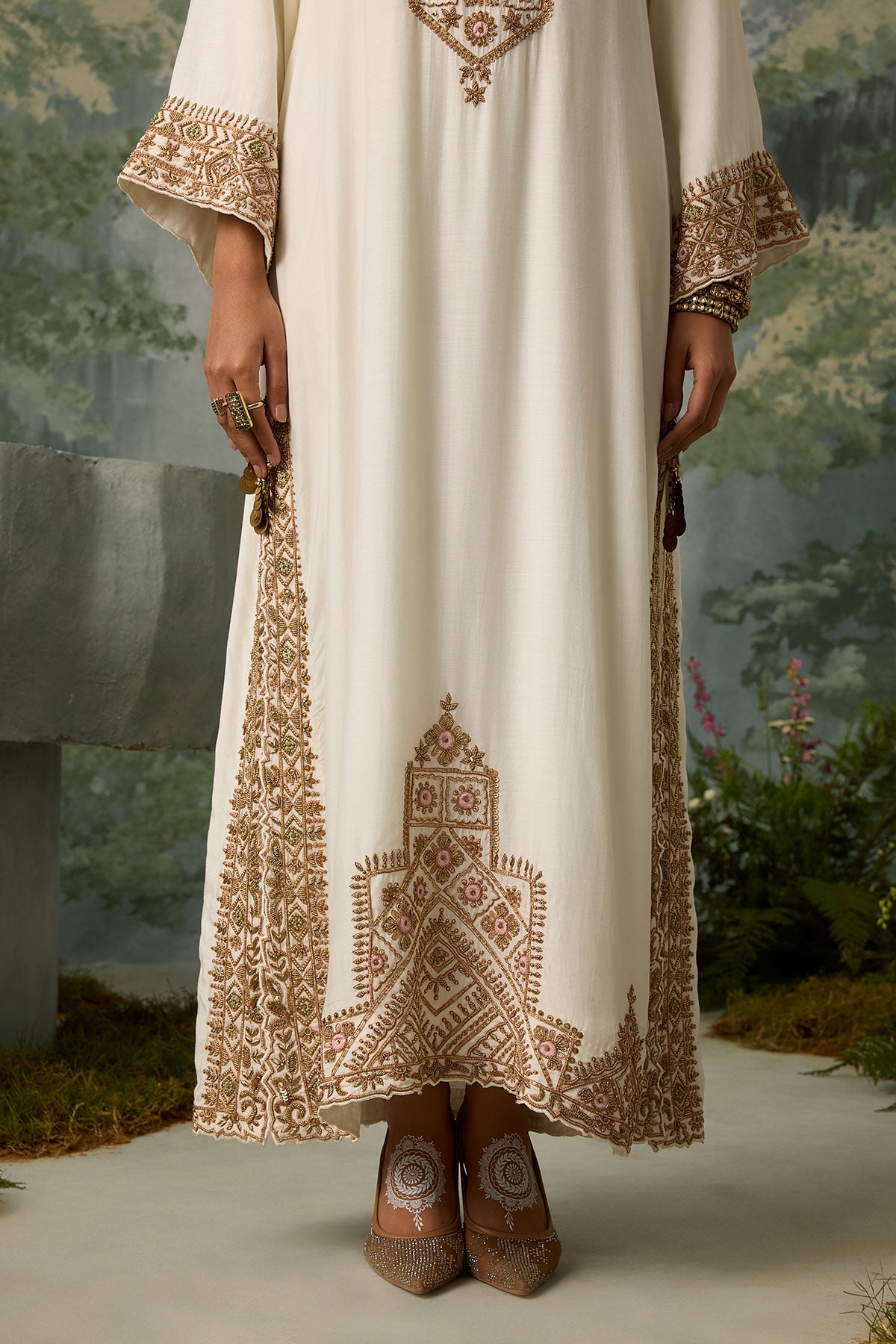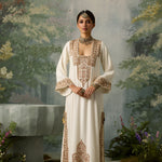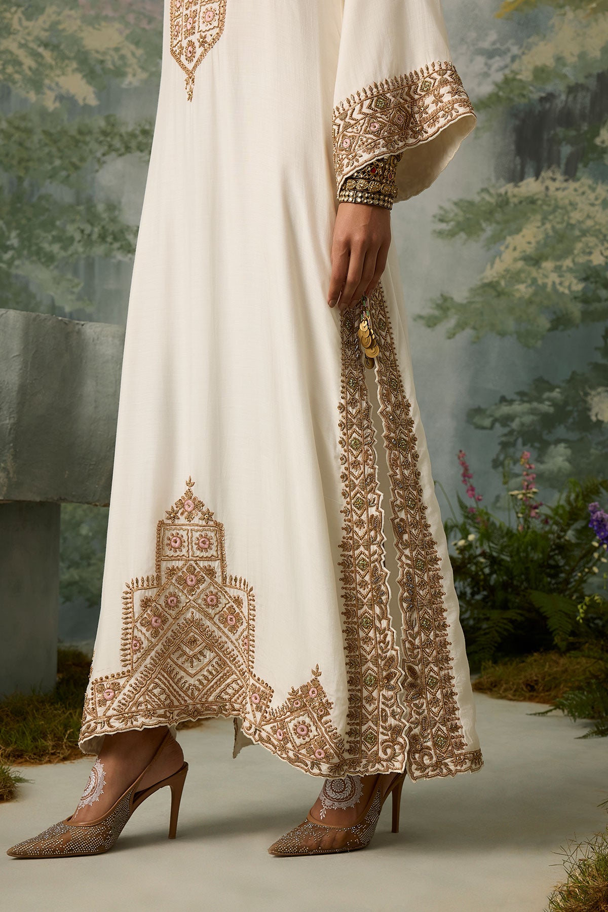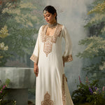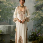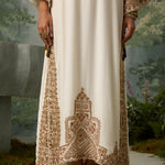 Ivory Muslin drapes fluidly from shoulder to ankle in this floor-grazing kaftan, anchored by a plunging Mughal neckline. Intricately embroidered slits finished with delicate cutwork add depth and dimension. The silhouette is signature to the brand—timeless, versatile, and made to transcend seasons.
