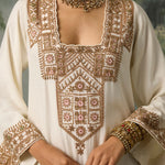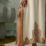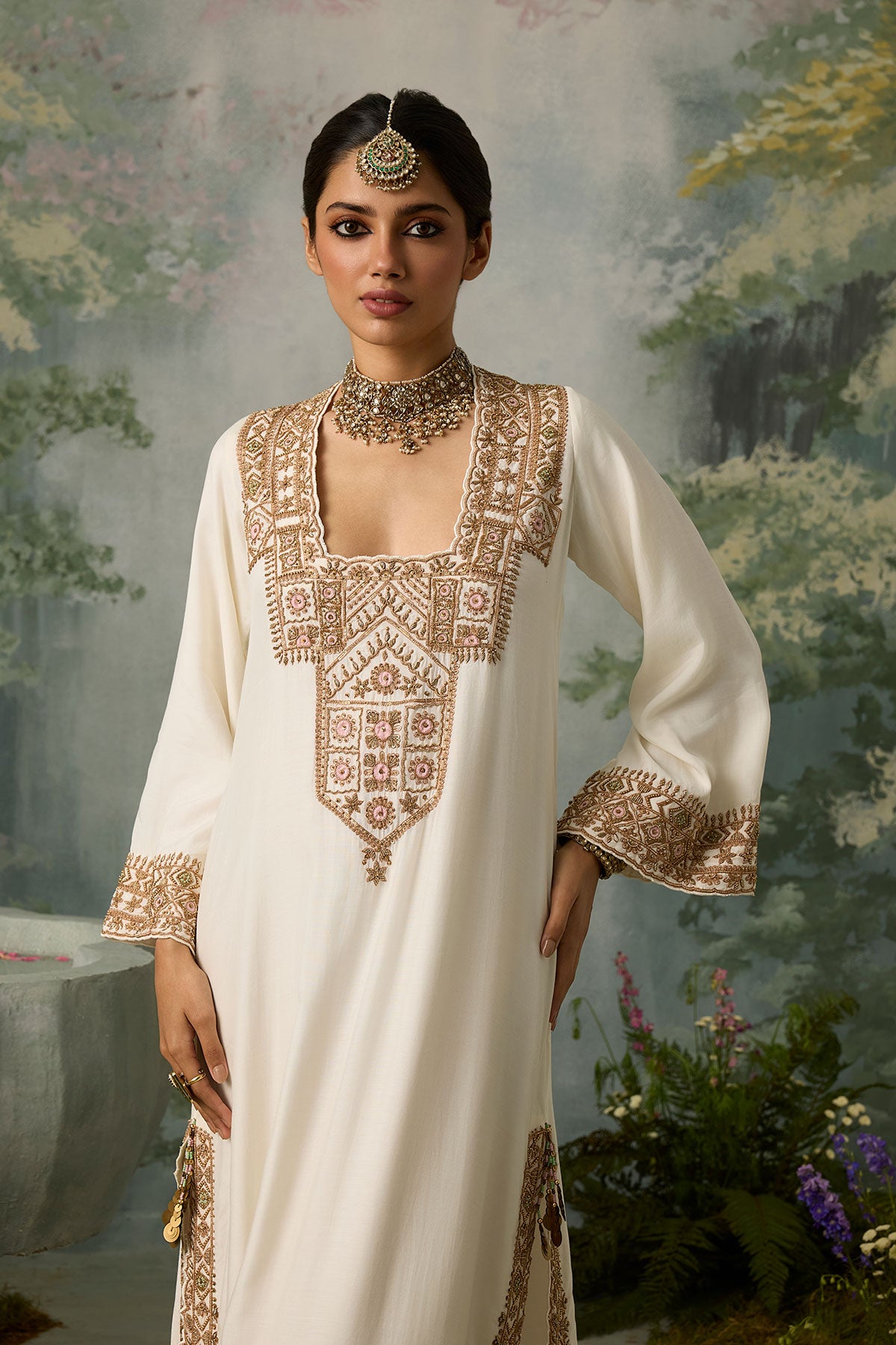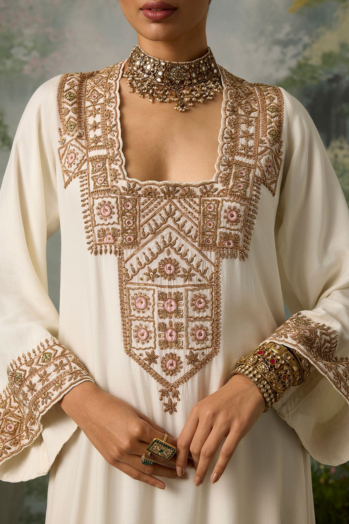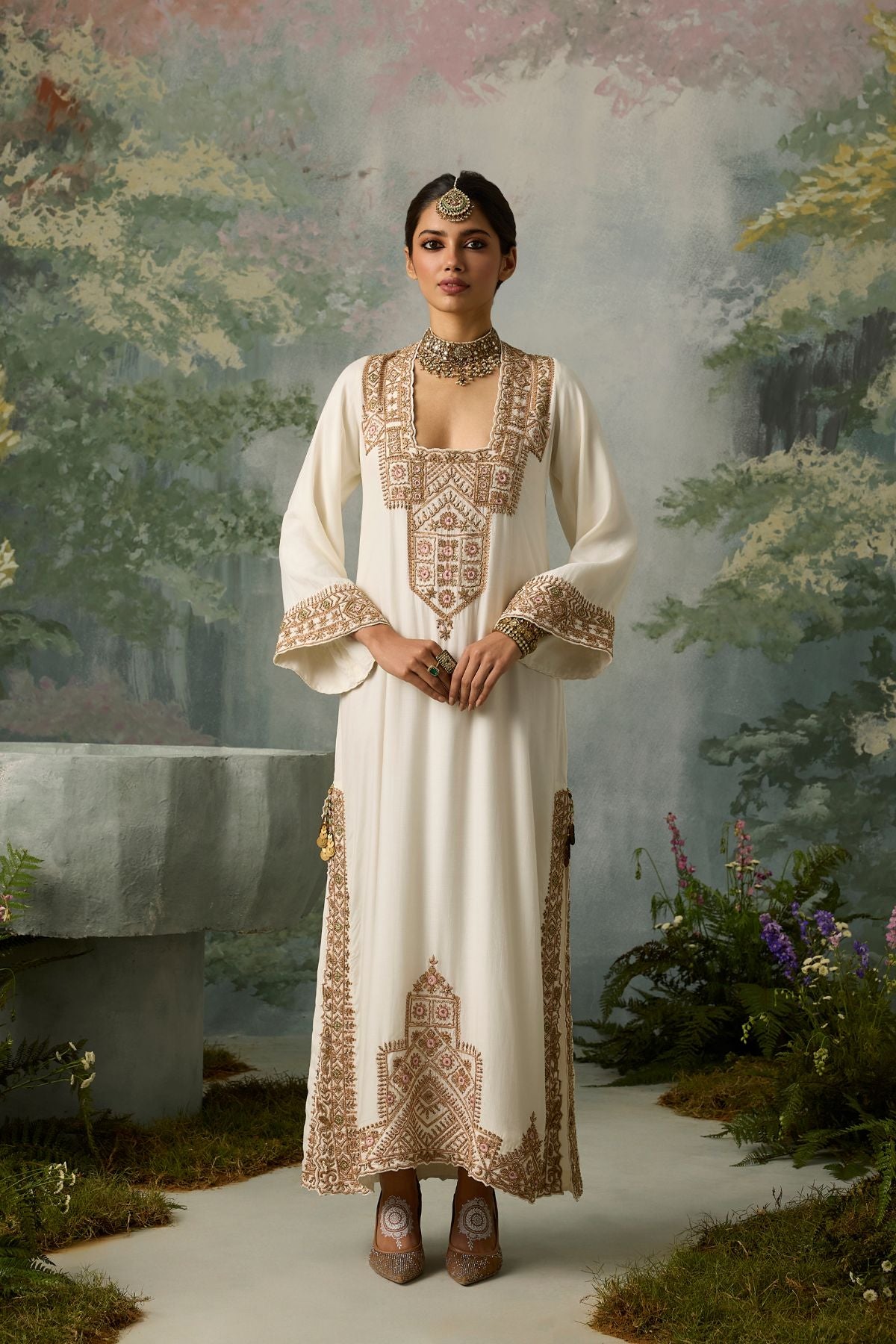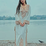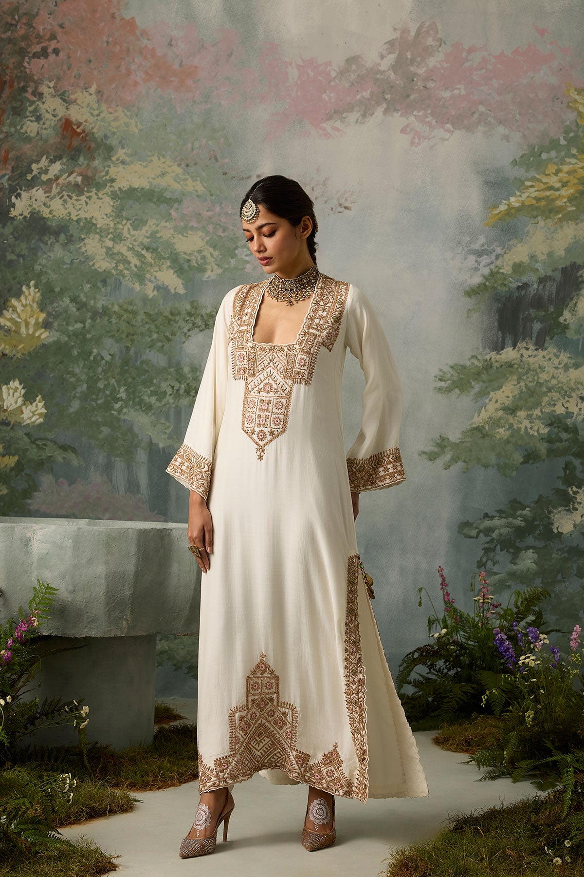 Ivory Muslin drapes fluidly from shoulder to ankle in this floor-grazing kaftan, anchored by a plunging Mughal neckline. Intricately embroidered slits finished with delicate cutwork add depth and dimension. The silhouette is signature to the brand—timeless, versatile, and made to transcend seasons.